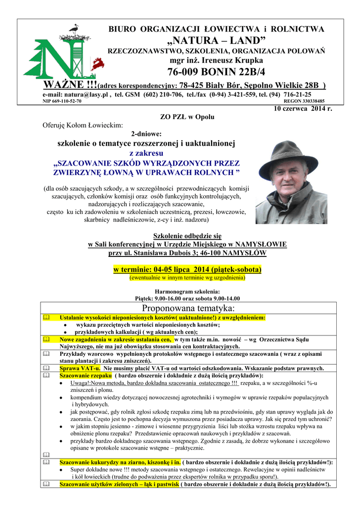BIURO ORGANIZACJI ŁOWIECTWA i ROLNICTWA „NATURA – LAND” RZECZOZNAWSTWO, SZKOLENIA, ORGANIZACJA POLOWAŃ mgr inż. Ireneusz Krupka 76-009 BONIN 22B/4 WAŻNE !!!(adres korespondencyjny: 78-425 Biały Bór, Sępolno Wielkie 28B ) e-mail: [email protected] , tel. GSM (602) 210-706, tel./fax (0-94) 3-421-559, tel. (94) 716-21-25 NIP 669-110-52-70 REGON 330338485 10 czerwca 2014 r. ZO PZŁ w Opolu Oferuję Kołom Łowieckim: 2-dniowe: szkolenie o tematyce rozszerzonej i uaktualnionej z zakresu „SZACOWANIE SZKÓD WYRZĄDZONYCH PRZEZ ZWIERZYNĘ ŁOWNĄ W UPRAWACH ROLNYCH ” (dla osób szacujących szkody, a w szczególności przewodniczących komisji szacujących, członków komisji oraz osób funkcyjnych kontrolujących, nadzorujących i rozliczających szacowanie, często ku ich zadowoleniu w szkoleniach uczestniczą, prezesi, łowczowie, skarbnicy nadleśniczowie, z-cy i inż. nadzoru) Szkolenie odbędzie się w Sali konferencyjnej w Urzędzie Miejskiego w NAMYSŁOWIE przy ul. Stanisława Dubois 3; 46-100 NAMYSŁÓW w terminie: 04-05 lipca 2014 (piątek-sobota) (ewentualnie w innym terminie wg uzgodnienia) Harmonogram szkolenia: Piątek: 9.00-16.00 oraz sobota 9.00-14.00 Proponowana tematyka: Ustalanie wysokości nieponiesionych kosztów( uaktualnione!) z uwzględnieniem: wykazu przeciętnych wartości nieponiesionych kosztów; przykładowych kalkulacji ( wg aktualnych cen); Nowe zagadnienia w zakresie ustalania cen, w tym także m.in. nowość – wg Orzecznictwa Sądu Najwyższego, nie ma już obowiązku stosowania cen kontraktacyjnych. Przykłady wzorcowo wypełnionych protokołów wstępnego i ostatecznego szacowania ( wraz z opisami stanu plantacji i zakresu zniszczeń). Sprawa VAT-u. Nie musimy płacić VAT-u od wartości odszkodowania. Wskazanie podstaw prawnych. Szacowanie rzepaku ( bardzo obszernie i dokładnie z dużą ilością przykładów): Uwaga!:Nowa metoda, bardzo dokładna szacowania ostatecznego !!! rzepaku, a w szczególności %-u zniszczeń i plonu. kompendium wiedzy dotyczącej nowoczesnej agrotechniki i wymogów w uprawie rzepaków populacyjnych i hybrydowych. jak postępować, gdy rolnik zgłosi szkodę rzepaku zimą lub na przedwiośniu, gdy stan uprawy wygląda jak do zaorania. Często jest to pochopna decyzja wymuszona przez posiadacza uprawy. Jak się przed tym uchronić? w jakim stopniu jesienno - zimowe i wiosenne przygryzienia liści lub stożka wzrostu rzepaku wpływa na obniżenie plonu rzepaku? Przedstawienie opracowań naukowych i przykładów z szacowań. przykłady bardzo dokładnego szacowania wstępnego. Zgodnie z zasadą, że dobrze wykonane i szczegółowo opisane w protokole szacowanie wstępne – praktycznie. Szacowanie kukurydzy na ziarno, kiszonkę i in. ( bardzo obszernie i dokładnie z dużą ilością przykładów!): Super dokładne nowe !!! metody szacowania wstępnego i ostatecznego. Rewelacyjne w opinii nadleśnictw i kół łowieckich (trudne do podważenia przez ekspertów rolnika w przypadku sporu!). Szacowanie użytków zielonych – łąk i pastwisk ( bardzo obszernie i dokładnie z dużą ilością przykładów!). Szacowanie wstępne i ostateczne roślin zbożowych jarych i ozimych, także gryki, w tym specyfika szacowania coraz powszechniejszych odmian hybrydowych oraz „przewódek” (nowość w szacowaniach!) Szacowanie roślin okopowych w tym ziemniaków i buraków. Szczególnie ważne z uwagi na bardzo wysokie ceny ziemniaków, gdzie za szkody w pow. 1ha, odszkodowanie może wynosić ponad 50 000 zł. Szacowanie roślin warzywnych w tym warzyw korzeniowych. Przykłady. Szacowanie upraw sadowniczych np. truskawek, upraw krzewów jagodowych (porzeczki, aronia, borówki), sadów, w tym upraw ekologicznych. Przykłady protokołów oraz obszernych szacowań, opinii i opracowań. Nowe zagrożenia w zakresie szkód w nietypowych uprawach rolnych oraz przykładowe rozwiązywanie problemów z tym m. in. rośliny energetyczne np. wierzba, rośliny ozdobne i in./ Zapoznanie z najbardziej skutecznymi i nowymi sposobami zapobiegania szkód. Psychologia w szacowaniu. Szkody łowieckie w aspekcie obowiązujących przepisów prawnych: ustawa prawo łowieckie i kodeks cywilny w aspekcie szacowania szkód; szczegółowa analiza rozporządzenia w sprawie szacowania szkód . terminy szacowania szkód wg uchwały sejmiku województwa oraz zwrócenie uwagi na nową interpretację szacowania płodów ( w kopcach, silosach), gdyż terminy szacowania dotyczą zarówno upraw jak i płodów np. kopców, silosów, za które nie odpowiadamy po 14-u dniach od ustalonych terminów. Nowość! ustawa o lasach, a szacowanie szkód; prawo unijne w zakresie wymogów wg PROW 2014-2020 - dotyczące szacowania szkód; orzeczenia sądowe i inne przepisy prawne związane ze szkodami; Praktyczne porady dotyczące prowadzenia spraw związanych z sporami w postępowaniu sądowym: aspekty prawne w zakresie odpowiedzialności za szkody w przypadku sporu sądowego; osoby szacujące powołane są na świadka w danej sprawie – jak powinny się przygotować do sprawy, sposób zachowania przed sądem, jak konstruktywnie i rzeczowo zeznawać? jak wykonywać przekonywujące dowody z szacowania - przykłady; odpowiedzi na pozew – konkretne przykłady z praktyki zawodowej przykłady wniosków do sądu o zabezpieczenie dowodu, bowiem nie tylko rolnik ma prawo występowania do sądu powołanie biegłego sądowego; Każdy uczestnik otrzyma: 1. Obszerne najnowsze materiały szkoleniowe (skrypt ok. 500 stron – każdy dział będzie rozdawany odrębnie podczas omawiania danego zagadnienia ). Materiały będą stanowić niezbędne kompendium wiedzy z zakresu szacowania szkód i gospodarki łowieckiej - na podbudowie odbytego szkolenia 2. Świadectwo ukończenia szkolenia – często niezbędne i żądane przy sporach sądowych. Cena za szkolenie – 300,00 zł brutto od uczestnika (w cenie są już ww. materiały szkoleniowe). Moje kwalifikacje i doświadczenie przydatne do p