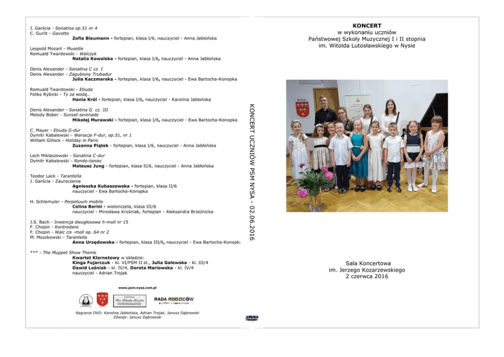 KONCERT w wykonaniu uczniów Państwowej Szkoły Muzycznej I i II stopnia im. Witolda Lutosławskiego w Nysie J. Garścia - Sonatina op.51 nr 4 C. Gurlit - Gavotte Zofia Blaumann - fortepian, klasa I/6, nauczyciel - Anna Jabłońska Leopold Mozart - Musette Romuald Twardowski - Walczyk Natalia Kowalska - fortepian, klasa I/6, nauczyciel - Anna Jabłońska Denis Alexander - Sonatina C cz. I Denis Alexander - Zagubiony Trubadur Julia Kaczmarska - fortepian, klasa I/6, nauczyciel - Ewa Bartocha-Konopka Romuald Twardowski - Etiuda Feliks Rybicki - Ty za wodą… Hania Król - fortepian, klasa I/6, nauczyciel - Karolina Jabłońska C. Mayer - Etiuda G-dur Dymitr Kabalewski - Wariacje F-dur, op.51, nr 1 William Gillock - Holiday in Paris Zuzanna Piątek - fortepian, klasa I/6, nauczyciel - Anna Jabłońska Lech Miklaszewski - Sonatina C-dur Dymitr Kabalewski - Rondo-taniec Mateusz Jung - fortepian, klasa II/6, nauczyciel - Anna Jabłońska Teodor Lack - Tarantella J. Garścia - Zauroczenie Agnieszka Kubaszewska - fortepian, klasa II/6 nauczyciel - Ewa Bartocha-Konopka H. Schlemuler - Perpetuum mobile Celina Berini - wiolonczela, klasa III/6 nauczyciel - Mirosława Krośniak, fortepian - Aleksandra Brzeźnicka J.S. Bach - Inwencja dwugłosowa h-moll nr 15 F. Chopin - Kontredans F. Chopin - Walc cis -moll op. 64 nr 2 M. Moszkowski - Tarantella Anna Urzędowska - fortepian, klasa III/6, nauczyciel - Ewa Bartocha-Konopka *** - The Muppet Show Theme Kwartet Klarnetowy w składzie: Kinga Fujarczuk - kl. VI/PSM II st., Julia Galewska - kl. III/4 Dawid Leśniak - kl. IV/4, Dorota Mariowska - kl. IV/4 nauczyciel - Adrian Trojak www.psm.nysa.com.pl Nagranie DVD: Karolina Jabłońska, Adrian Trojak, Janusz Dąbrowski Dźwięk: Janusz Dąbrowski KONCERT UCZNIÓW PSM NYSA - 02.06.2016 Denis Alexander - Sonatina G cz. III Melody Bober - Sunset serenade Mikołaj Murawski - fortepian, klasa I/6, nauczyciel - Ewa Bartocha-Konopka Sala Koncertowa im. Jerzego Kozarzewskiego 2 czerwca 2016