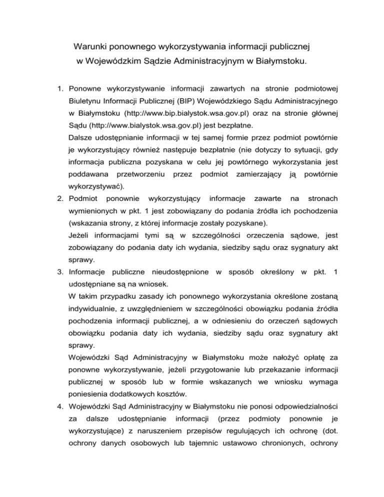 Warunki ponownego wykorzystywania informacji publicznej w Wojewódzkim Sądzie Administracyjnym w Białymstoku. 1. Ponowne wykorzystywanie informacji zawartych na stronie podmiotowej Biuletynu Informacji Publicznej (BIP) Wojewódzkiego Sądu Administracyjnego w Białymstoku (http://www.bip.bialystok.wsa.gov.pl) oraz na stronie głównej Sądu (http://www.bialystok.wsa.gov.pl) jest bezpłatne. Dalsze udostępnianie informacji w tej samej formie przez podmiot powtórnie je wykorzystujący również następuje bezpłatnie (nie dotyczy to sytuacji, gdy informacja publiczna pozyskana w celu jej powtórnego wykorzystania jest poddawana przetworzeniu przez podmiot zamierzający ją powtórnie na stronach wykorzystywać). 2. Podmiot ponownie wykorzystujący informacje zawarte wymienionych w pkt. 1 jest zobowiązany do podania źródła ich pochodzenia (wskazania strony, z której informacje zostały pozyskane). Jeżeli informacjami tymi są w szczególności orzeczenia sądowe, jest zobowiązany do podania daty ich wydania, siedziby sądu oraz sygnatury akt sprawy. 3. Informacje publiczne nieudostępnione w sposób określony w pkt. 1 udostępniane są na wniosek. W takim przypadku zasady ich ponownego wykorzystania określone zostaną indywidualnie, z uwzględnieniem w szczególności obowiązku podania źródła pochodzenia informacji publicznej, a w odniesieniu do orzeczeń sądowych obowiązku podania daty ich wydania, siedziby sądu oraz sygnatury akt sprawy. Wojewódzki Sąd Administracyjny w Białymstoku może nałożyć opłatę za ponowne wykorzystywanie, jeżeli przygotowanie lub przekazanie informacji publicznej w sposób lub w formie wskazanych we wniosku wymaga poniesienia dodatkowych kosztów. 4. Wojewódzki Sąd Administracyjny w Białymstoku nie ponosi odpowiedzialności za dalsze udostępnianie informacji (przez podmioty ponownie je wykorzystujące) z naruszeniem przepisów regulujących ich ochronę (dot. ochrony danych osobowych lub tajemnic ustawowo chronionych, ochrony prawa do prywatności), a także za informacje pozyskane w sposób inny niż określony w pkt. 1 z pominięciem procedury wnioskowej. 5. Udostępnienie informacji publicznej w celu ponownego wykorzystywania nie może wprowadzać ograniczenia korzystania z tej informacji przez innych użytkowników. 6. Podmiot dokonujący przetworzenia informacji publicznych pozyskanych w celu ich ponownego wykorzystania, zobowiązany jest do wskazania tego faktu. Podmiot ponownie wykorzystujący informację publiczną w postaci orzeczenia sądowego jest zobowiązany do wskazania, czy wykorzystuje je w całości czy we fragmentach, a jeżeli tak to w jakich (np. uzasadnienie faktyczne lub uzasadnione prawne orzeczenia sądowego).