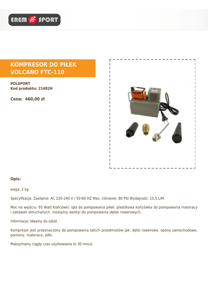 KOMPRESOR DO PIŁEK VOLCANO FTC-110 POLSPORT Kod produktu: 21482H Cena: 460,00 zł Opis: waga: 2 kg Specyfikacja: Zasilanie: AC 220-240 V / 50-60 HZ Max. ciśnienie: 80 PSI Wydajność: 15,5 L/M. Moc na wejściu: 95 Watt Końcówki: igła do pompowania piłek. plastikowa końcówka do pompowania materacy i zabawek dmuchanych. mosiężny wentyl do pompowania dętek rowerowych. Informacje: Idealny do szkół. Kompresor jest przeznaczony do pompowania takich przedmiotów jak: dętki rowerowe, opony samochodowe, pontony, materace, piłki. Maksymalny ciągły czas użytkowania to 30 minut. Wydajny i trwały. Produkt wyłącznie na zamówienie telefoniczne!