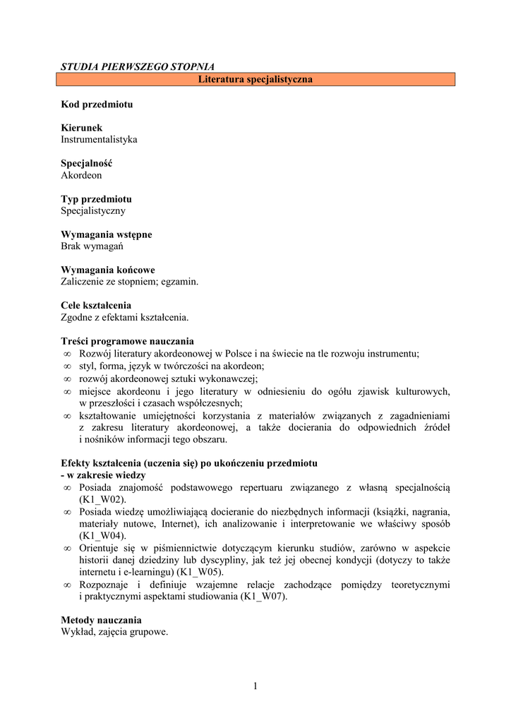 STUDIA PIERWSZEGO STOPNIA Literatura specjalistyczna Kod przedmiotu Kierunek Instrumentalistyka Specjalność Akordeon Typ przedmiotu Specjalistyczny Wymagania wstępne Brak wymagań Wymagania końcowe Zaliczenie ze stopniem; egzamin. Cele kształcenia Zgodne z efektami kształcenia. Treści programowe nauczania • Rozwój literatury akordeonowej w Polsce i na świecie na tle rozwoju instrumentu; • styl, forma, język w twórczości na akordeon; • rozwój akordeonowej sztuki wykonawczej; • miejsce akordeonu i jego literatury w odniesieniu do ogółu zjawisk kulturowych, w przeszłości i czasach współczesnych; • kształtowanie umiejętności korzystania z materiałów związanych z zagadnieniami z zakresu literatury akordeonowej, a także docierania do odpowiednich źródeł i nośników informacji tego obszaru. Efekty kształcenia (uczenia się) po ukończeniu przedmiotu - w zakresie wiedzy • Posiada znajomość podstawowego repertuaru związanego z własną specjalnością (K1_W02). • Posiada wiedzę umożliwiającą docieranie do niezbędnych informacji (książki, nagrania, materiały nutowe, Internet), ich analizowanie i interpretowanie we właściwy sposób (K1_W04). • Orientuje się w piśmiennictwie dotyczącym kierunku studiów, zarówno w aspekcie historii danej dziedziny lub dyscypliny, jak też jej obecnej kondycji (dotyczy to także internetu i e-learningu) (K1_W05). • Rozpoznaje i definiuje wzajemne relacje zachodzące pomiędzy teoretycznymi i praktycznymi aspektami studiowania (K1_W07). Metody nauczania Wykład, zajęcia grupowe. 1 Nakład pracy studenta potrzebny do osiągnięcia efektów uczenia się ROK SEMESTR Punkty ECTS Ilość godzin w semestrze Rodzaj zaliczenia LEGENDA I 1 II 2 III 3 4 2 2 30 30 zs egz 5 6 zal – zaliczony; zs – zaliczenie ze stopniem; egz – egzamin; ed – egzamin dyplomowy. Kryteria oceny Ocenie podlega znajomość repertuaru własnej dyscypliny (rozpoznawanie zestawu utworów podczas egzaminu), a także wiedza dotycząca możliwości i sposobów docierania do wszelkich źródeł związanych z literaturą akordeonową oraz korzystania z nich. Literatura (piśmiennictwo) • Dowlasz B., Akordeon w twórczości Bronisława Kazimierza Przybylskiego w latach 1963-1988, AMiFC Warszawa; • Eickhof Th., Kulturgeschichte der Harmonika, Kamen 1991; • Gervasoni P., L’accordeon, instrument du XX siecle, EMA Paris, 1986; • Lips F., Die Kunst des Bajanspiels, Kamen 1991 lub to samo w języku rosyjskim: Lips F., Iskustwo igry na bajanie, Moskwa 1985; • Lips F., Tworczestwo Władysława Zołotariewa, WISK Moskwa 1984; • Mądrawski J., Twórczość kompozytorska Bogdana Dowlasza na akordeon, AMiFC Warszawa 2000; • Oberjuchtin M., Problemy ispołnitielstwa na bajanie, Muzyka, Moskwa 1989; • Pater J. (red.), Muzyczny świat Andrzeja Krzanowskiego, ZN AM Kraków 2000; • Pater J., Andrzej Krzanowski, próba fragmentarycznego przeglądu twórczości akordeonowej w aspekcie języka muzycznego, Warszawa 1996 (Zeszyty Naukowe AmiFC); • Pater J., Wartości sonorystyczne akordeonu koncertowego w oparciu o współczesną literaturę akordeonową, Kraków 1982 (Zeszyty Naukowe AM w Krakowie); • Pichura J., Śląscy twórcy muzyki akordeonowej, cz. I, WSP Częstochowa 1997; • Pichura J., Środki wyrazowe współczesnej literatury akordeonowej, WSP Częstochowa 1997; • Pichura J., Twórczość akordeonowa kompozytorów środowiska katowickiego (Materiały z sympozjum w Miętnem); • Rosińska E., Panorama polskiej twórczości akordeonowej; • Rosińska E., Polska literatura akordeonowa, Warszawa 1966 (AMiFC) • Vičar J., Akordeon a jeho hudebni uplatnieni, Panton, Praha 1981. Język wykładowy Polski, możliwość prowadzenia zajęć w języku angielskim, niemieckim, rosyjskim. 2 Imię i nazwisko wykładowcy prof. Bogdan Dowlasz kw. II st. Zbigniew Ignaczewski, prof. AM 3