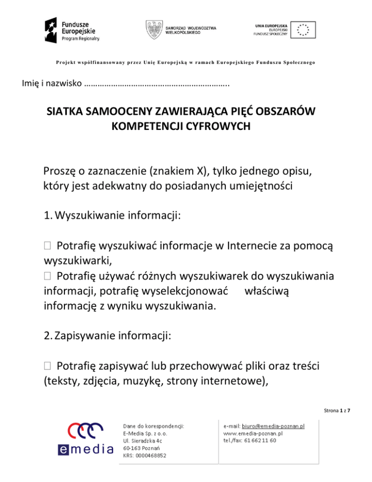 P r o j e k t w s p ó ł f i n a n s o w a n y p r z e z U n i ę E u r o p e j s ką w r a m a c h E u r o p e j s ki e g o F u n d u s z u S p o ł e c z n e g o Imię i nazwisko ……………………………………………………….. SIATKA SAMOOCENY ZAWIERAJĄCA PIĘĆ OBSZARÓW KOMPETENCJI CYFROWYCH Proszę o zaznaczenie (znakiem X), tylko jednego opisu, który jest adekwatny do posiadanych umiejętności 1. Wyszukiwanie informacji: Potrafię wyszukiwać informacje w Internecie za pomocą wyszukiwarki, Potrafię używać różnych wyszukiwarek do wyszukiwania informacji, potrafię wyselekcjonować właściwą informację z wyniku wyszukiwania. 2. Zapisywanie informacji: Potrafię zapisywać lub przechowywać pliki oraz treści (teksty, zdjęcia, muzykę, strony internetowe), Strona 1 z 7 P r o j e k t w s p ó ł f i n a n s o w a n y p r z e z U n i ę E u r o p e j s ką w r a m a c h E u r o p e j s ki e g o F u n d u s z u S p o ł e c z n e g o Wiem, jak zapisywać, przechowywać pliki lub odnośniki do nich. Posiadam własną strategię przechowywania informacji. 3. Komunikacja z innymi: Potrafię komunikować się z innymi, za pomocą podstawowych narzędzi komunikacji, Potrafię się komunikować za pomocą kilku narzędzi, wykorzystując ustawienia zaawansowane. 4. Udostępnianie plików: Potrafię udostępniać pliki i treści, korzystając z prostych narzędzi, Wiem jak korzystać z serwisów społecznościowych, potrafię przekazywać oraz dzielić się wiedzą, treściami i informacjami. 5. Tożsamość cyfrowa: Strona 2 z 7 P r o j e k t w s p ó ł f i n a n s o w a n y p r z e z U n i ę E u r o p e j s ką w r a m a c h E u r o p e j s ki e g o F u n d u s z u S p o ł e c z n e g o Zdaję sobie sprawę z korzyści i zagrożeń związanych z tożsamością cyfrową, Wiem, jak kształtować tożsamość cyfrową i śledzić swój ślad cyfrowy. 6. Tworzenie treści: Potrafię tworzyć proste treści (tekst, tabelę, obrazy, pliki), Potrafię tworzyć oraz edytować treści cyfrowe w różnych formatach. 7. Prawa autorskie: Wiem, że treść może być objęta prawami autorskimi, Posiadam wiedzę na temat różnic między prawem autorskim, copyleft i crative commons, potrafię stosować licencję do tworzonych przeze mnie treści. Strona 3 z 7 P r o j e k t w s p ó ł f i n a n s o w a n y p r z e z U n i ę E u r o p e j s ką w r a m a c h E u r o p e j s ki e g o F u n d u s z u S p o ł e c z n e g o 8. Bezpieczeństwo: Potrafię wykonać podstawowe działania, aby chronić swoje urządzenie (np. za pomocą programów antywirusowych oraz haseł), Wiem, jak chronić swoje urządzenie cyfrowe oraz aktualizuję swoje strategie bezpieczeństwa. 9. Bezpieczeństwo w Internecie: Wiem, że w Internecie mogę udostępnić tylko określony rodzaj informacji o sobie i innych, Mam ogólną wiedzę dotyczącą ochrony prywatności i mam podstawową wiedzę dotyczącą sposobów gromadzenia i wykorzystywania moich danych przez innych użytkowników. 10. Rozwiązywanie problemów Potrafię znaleźć wsparcie i pomoc, w sytuacji, gdy wystąpił problem techniczny lub w przypadku korzystania z nowego urządzenia/programu, Strona 4 z 7 P r o j e k t w s p ó ł f i n a n s o w a n y p r z e z U n i ę E u r o p e j s ką w r a m a c h E u r o p e j s ki e g o F u n d u s z u S p o ł e c z n e g o Potrafię rozwiązywać nietypowe zadania poprzez badania możliwości technicznych. 11. Jak ocenia Pan/-i swoją wiedzę z poniższych obszarów: proszę o zaznaczenie znakiem X odpowiedniej oceny, przy czym: 1 oznacza – niedostatecznie, 2 – mniej niż dostatecznie, 3 – dostatecznie, 4 – dobrze, 5 – bardzo dobrze Przeglądanie, wyszukiwanie i filtrowanie informacji w Internecie 1 2 3 4 5 Strona 5 z 7 P r o j e k t w s p ó ł f i n a n s o w a n y p r z e z U n i ę E u r o p e j s ką w r a m a c h E u r o p e j s ki e g o F u n d u s z u S p o ł e c z n e g o Przechowywanie znalezionych informacji Komunikacja z wykorzystaniem narzędzi cyfrowych i aplikacji Netykieta Tworzenie i edytowanie treści Przestrzeganie prawa autorskiego i licencji Wiedza na temat ochrony moich danych osobowych Rozwiązywanie problemów technicznych 1 2 3 4 5 1 2 3 4 5 1 1 2 2 3 3 4 4 5 5 1 2 3 4 5 1 2 3 4 5 1 2 3 4 5 Strona 6 z 7 P r o j e k t w s p ó ł f i n a n s o w a n y p r z e z U n i ę E u r o p e j s ką w r a m a c h E u r o p e j s ki e g o F u n d u s z u S p o ł e c z n e g o 12. Proszę o zaznaczenie 3 modułów, które najczęściej będzie Pan/-i wykorzystywał/-a w swojej pracy: Informacja, Komunikacja, Tworzenie treści, Bezpieczeństwo, Rozwiązywanie problemów. Strona 7 z 7