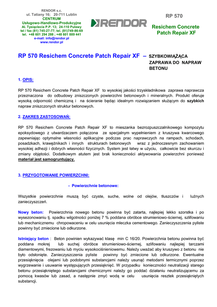RENDOR s.c. ul. Tatiany 16; 20-711 Lublin CENTRUM Usługowo-Handlowo-Produkcyjne Al. Tysiąclecia P.P. 13; 24-110 Puławy tel / fax (81) 745-27-77; tel. (81)749-86-69 tel. +48 601 294 288 ; +48 601 889 441 e-mail: [email protected] www.rendor.pl RP 570 Resichem Concrete Patch Repair XF – RP 570 Resichem Concrete Patch Repair XF SZYBKOWIĄŻĄCA ZAPRAWA DO NAPRAW BETONU 1. OPIS: RP 570 Resichem Concrete Patch Repair XF to wysokiej jakości trzyskładnikowa zaprawa naprawcza przeznaczona do odbudowy zniszczonych powierzchni betonowych i mineralnych. Produkt oferuje wysoką odporność chemiczną i na ścieranie będąc idealnym rozwiązaniem służącym do szybkich napraw zniszczonych struktur betonowych. 2. ZAKRES ZASTOSOWAŃ: RP 570 Resichem Concrete Patch Repair XF to mieszanka bezrozpuszczalnikowego kompozytu epoksydowego z utwardzaczem połączona ze specjalnym wypełnieniem z kruszywa kwarcowego zapewniając optymalne własności aplikacyjne podczas prac naprawczych na rampach, schodach, posadzkach, krawężnikach i innych strukturach betonowych wraz z jednoczesnym zachowaniem wysokiej adhezji i dobrych własności fizycznych. System jest łatwy w użyciu, całkowicie bez skurczu i zmiany objętości. Dodatkowym atutem jest brak konieczności aktywowania powierzchni ponieważ materiał jest samogruntujący. 3. PRZYGOTOWANIE POWIERZCHNI: - Powierzchnie betonowe: Wszystkie powierzchnie muszą być czyste, suche, wolne od olejów, tłuszczów i zanieczyszczeń. luźnych Nowy beton: Powierzchnia nowego betonu powinna być zatarta, najlepiej lekko szorstka i po wysezonowaniu tj. spadku wilgotności poniżej 7 % poddana obróbce strumieniowo-ściernej, szlifowaniu lub mechanicznemu chropowaceniu w celu usunięcia mleczka cementowego. Zanieczyszczenia pyliste powinny być zmiecione lub odkurzone. Istniejący beton : Beton powinien wykazywać klasę min C 16/20. Powierzchnia betonu powinna być poddana mokrej lub suchej obróbce strumieniowo-ściernej, szlifowaniu najlepiej tarczami diamentowymi, frezowaniu lub myciu wysokociśnieniowemu. Należy uważać aby kruszywo z betonu nie było odsłonięte. Zanieczyszczenia pyliste powinny być zmiecione lub odkurzone. Ewentualne przesiąknięcia olejami lub podobnymi substancjami należy usunąć metodami termicznymi poprzez wygrzewanie i usuwanie występujących przesiąknięć. W przypadku konieczności neutralizacji starego betonu przesiąkniętego substancjami chemicznymi należy go poddać działaniu neutralizującemu za pomocą kwasów lub zasad, a następnie zmyć wodą w celu usunięcia resztek przesiąkniętych substancji. Nie wolno aplikować materiału na stare, słabo związane powłoki malarskie, które należy usunąć. Odsłonięte części zbrojenia konstrukcji betonowej należy oczyścić ręcznie lub mechanicznie i zabezpieczyć za pomocą materiału RP 506 Resichem Aluprime. Wilgotność betonu nie może przekraczać 7%. Wszystkie powierzchnie betonowe powinny mieć skuteczną izolacje przeciwwilgociową. Materiał jest samogruntujący i nie wymaga żadnych dodatkowych warstw podkładowych. Nakładania nie należy przeprowadzać gdy : temperatura podłoża lub powietrza wynosi poniżej 5 oC lub wilgotność jest większa niż 90% lub gdy temperatura jest niższa niż 3 oC od punktu rosy. 4. STOSUNEK MIESZANIA: Wszystkie komponenty muszą być mieszane w całości. Nie można dzielić opakowań i mieszać ich częściowo. Kolejność czynności : 1/ Umieścić komponent bazowy materiału RP 570 Resichem Concrete Patch Repair XF i utwardzacz w dostarczonym wiadrze będącym opakowaniem dla w/w produktów i dokładnie wymieszać 2/ Następnie do wymieszanych bazy i utwardzacza dodać około połowy kruszywa wypełniającego i ponownie dokładnie wymieszać przez min. 30 sekund 3/ Dodać resztę kruszywa i wymieszać całość zestawu 4/ Przygotowaną mieszankę bazy, utwardzacza i kruszywa za pomocą pacy metalowej. należy aplikować na naprawiane miejsca 5. NAKŁADANIE: Wymieszany materiał należy aplikować za pomocą pacy metalowej. Kompozyt powinien być dokładnie dociśnięty pacą do naprawianych miejsc, a następnie wygładzony. W celu uzyskania optymalnych walorów estetycznych nałożoną warstwę kompozytu można wygładzić za pomocą pacy lekko zwilżonej w wodzie. 6. DANE APLIKACYJNE dla temperatury 20 oC : - czas użycia po wymieszaniu: 30 min. - minimalny czas do nałożenia kolejnej warstwy gdy tylko pierwsza warstwa będzie sucha w dotyku - maksymalny czas do nałożenia kolejnej warstwy 8 godz. - lekkie obciążenie 2 godz. - pełne utwardzenie: 3 - 4 godz. - wydajność objętościowa 1500 cm3 z zestawu 5 kg ( możliwość odbudowy 0,25 m2 powierzchni przy grubości warstwy 6 mm z zestawu 5 kg ) - V.O.C. / zawartość cząstek lotnych / - brak Podane czasy aplikacji mogą się różnić wilgotności powietrza. od powyższych zależnie od temperatury powierzchni i 7. CHARAKTERYSTYKA TECHNICZNA : CECHA Adhezja (do betonu) Wytrzymałość na ściskanie Wytrzymałość na zginanie Odporność na ścieranie Norma badawcza ASTM D 4541 ASTM D 695 ASTM D 790 ASTM D 4060 Wynik badania 35 kg/cm2 przewyższa kohezję betonu 840 kg/cm2 450 kg/cm2 122 mg utraty wagi na 1000 cykli koło CS 17 obciążenie 1 kg 8. BEZPIECZEŃSTWO I POZOSTAŁE ZALECENIA : jak wykazuje praktyka RP 570 Resichem Concrete Patch Repair XF może być używany całkowicie bezpiecznie unikać bezpośredniego, niepotrzebnego kontaktu ze skórą; używane do aplikacji narzędzia należy natychmiast umyć w rozcieńczalniku do wyrobów epoksydowych lub Universal Cleaner 020 czas przechowywania materiału wynosi 5 lat, jeśli materiał przechowywany jest w temp. od 15 oC - 30 oC 9. ATESTY I DOPUSZCZENIA: Oświadczenie dostawcy wydane na podstawie Rozporządzenia Ministra Spraw Wewnętrznych i Administracji w sprawie aprobat i kryteriów technicznych oraz jednostkowego stosowania wyrobów budowlanych