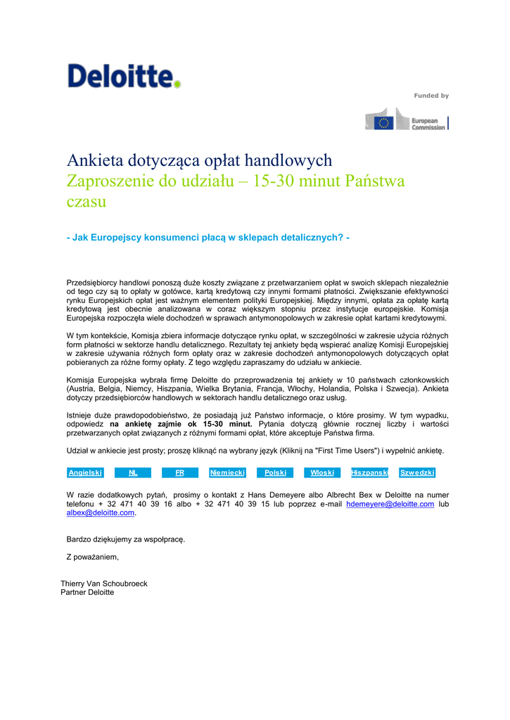 Funded by Ankieta dotycząca opłat handlowych Zaproszenie do udziału – 15-30 minut Państwa czasu - Jak Europejscy konsumenci płacą w sklepach detalicznych? - Przedsiębiorcy handlowi ponoszą duże koszty związane z przetwarzaniem opłat w swoich sklepach niezależnie od tego czy są to opłaty w gotówce, kartą kredytową czy innymi formami płatności. Zwiększanie efektywności rynku Europejskich opłat jest ważnym elementem polityki Europejskiej. Między innymi, opłata za opłatę kartą kredytową jest obecnie analizowana w coraz większym stopniu przez instytucje europejskie. Komisja Europejska rozpoczęła wiele dochodzeń w sprawach antymonopolowych w zakresie opłat kartami kredytowymi. W tym kontekście, Komisja zbiera informacje dotyczące rynku opłat, w szczególności w zakresie użycia różnych form płatności w sektorze handlu detalicznego. Rezultaty tej ankiety będą wspierać analizę Komisji Europejskiej w zakresie używania różnych form opłaty oraz w zakresie dochodzeń antymonopolowych dotyczących opłat pobieranych za różne formy opłaty. Z tego względu zapraszamy do udziału w ankiecie. Komisja Europejska wybrała firmę Deloitte do przeprowadzenia tej ankiety w 10 państwach członkowskich (Austria, Belgia, Niemcy, Hiszpania, Wielka Brytania, Francja, Włochy, Holandia, Polska i Szwecja). Ankieta dotyczy przedsiębiorców handlowych w sektorach handlu detalicznego oraz usług. Istnieje duże prawdopodobieństwo, że posiadają już Państwo informacje, o które prosimy. W tym wypadku, odpowiedz na ankietę zajmie ok 15-30 minut. Pytania dotyczą głównie rocznej liczby i wartości przetwarzanych opłat związanych z różnymi formami opłat, które akceptuje Państwa firma. Udział w ankiecie jest prosty; proszę kliknąć na wybrany język (Kliknij na "First Time Users") i wypełnić ankietę. Angielski NL FR Niemiecki Polski Wloski Hiszpanski Szw edzki W razie dodatkowych pytań, prosimy o kontakt z Hans Demeyere albo Albrecht Bex w Deloitte na numer telefonu + 32 471 40 39 16 albo + 32 471 40 39 15 lub poprzez e-mail [email protected] lub [email protected]. Bardzo dziękujemy za wspołpracę. Z poważaniem, Thierry Van Schoubroeck Partner Deloitte