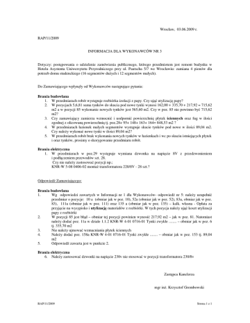 Wrocław, 03.06.2009 r. RAP/11/2009 INFORMACJA DLA WYKONAWCÓW NR 3 Dotyczy: postępowania o udzielenie zamówienia publicznego, którego przedmiotem jest remont budynku w Hotelu Asystenta Uniwersytetu Przyrodniczego przy ul. Pautscha 5/7 we Wrocławiu: zamiana 4 pionów dla potrzeb domu studenckiego (16 segmentów dużych i 12 segmentów małych). Do Zamawiającego wpłynęły od Wykonawców następujące pytania: Branża budowlana 1. W przedmiarach robót występuje rozbiórka izolacji z papy. Czy ująć utylizację papy? 2. W pozycjach 5,6,81 suma tynków do skucia pod nowe tynki wynosi 162,00 + 335,70 + 217,92 = 715,62 m2 a w pozycji 85 wykonanie nowych tynków jest 565,60 m2. Czy w poz. 85 nie powinno być 715,62 m2? 3. Czy zamawiający zamierza wzmocnić i uodpornić powierzchnię płytek ściennych oraz fug w ilości zgodnej z olicowaną powierzchnią tj. poz.28+ 95+ 148+ 163+ 164= 848,53 m2 ? 4. W przedmiarach łazienek małych segmentów występuje skucie tynków pod nowe w ilości 89,04 m2. Czy należy wykonać nowe tynki w ilości 89,04 m2? 5. W przedmiarach robót brak wykonania nowych tynków w łazienkach i wc po skuciu istniejących płytek i oraz tynków, prosimy o skorygowanie przedmiaru robót. Branża elektryczna 1. W przedmiarach w poz.29 występuje wymiana dzwonka na napięcie 8V z przedzwonieniem i podłączeniem przewodów szt. 28. Czy nie należy zastosować pozycji np.; KNR-W 5-08 0406-02 montaż transformatora 220/8V - 28 szt.? Odpowiedź Zamawiającego: Branża budowlana 1. Wg odpowiedzi zawartych w Informacji nr 1 dla Wykonawców- odpowiedź nr 5: należy uzupełnić przedmiar o pozycje: 10 a (obmiar jak w poz. 10), 52a (obmiar jak w poz. 52), 83a, obmiar jak w poz. 83), 111a (obmiar jak w poz. 111) oraz 135 a (obmiar jak w poz. 135) – kalk. własna - Opłata za przyjęcie na wysypisko i utylizację materiałów z rozbiórki. W tych pozycja należy ująć koszt utylizacji papy z rozbiórki 2. W pozycji 85 jest błąd – obmiar tej pozycji powinien wynosić 217,92 m2 – jak w poz. 81. Natomiast należy dodać poz. 11a w dziale 1.1.2 KNR-W 4-01 0716-01 Tynki zwykłe ........ – obmiar jak w poz. 6 tj. 335,70 m2 3. Nie należy ujmować wzmacniania płytek ściennych 4. Należy dodać poz. 158a KNR-W 4-01 0716-01 Tynki zwykłe ........ – obmiar jak w poz. 153 tj. 89,04 m2 5. Odpowiedź zawarta jest w punkcie 2. Branża elektryczna 6. Należy zastosować dzwonki na napięcie 230v nie stosować w pozycji transformatora 230/8v Zastępca Kanclerza mgr inż. Krzysztof Grembowski RAP/11/2009 Strona 1 z 1