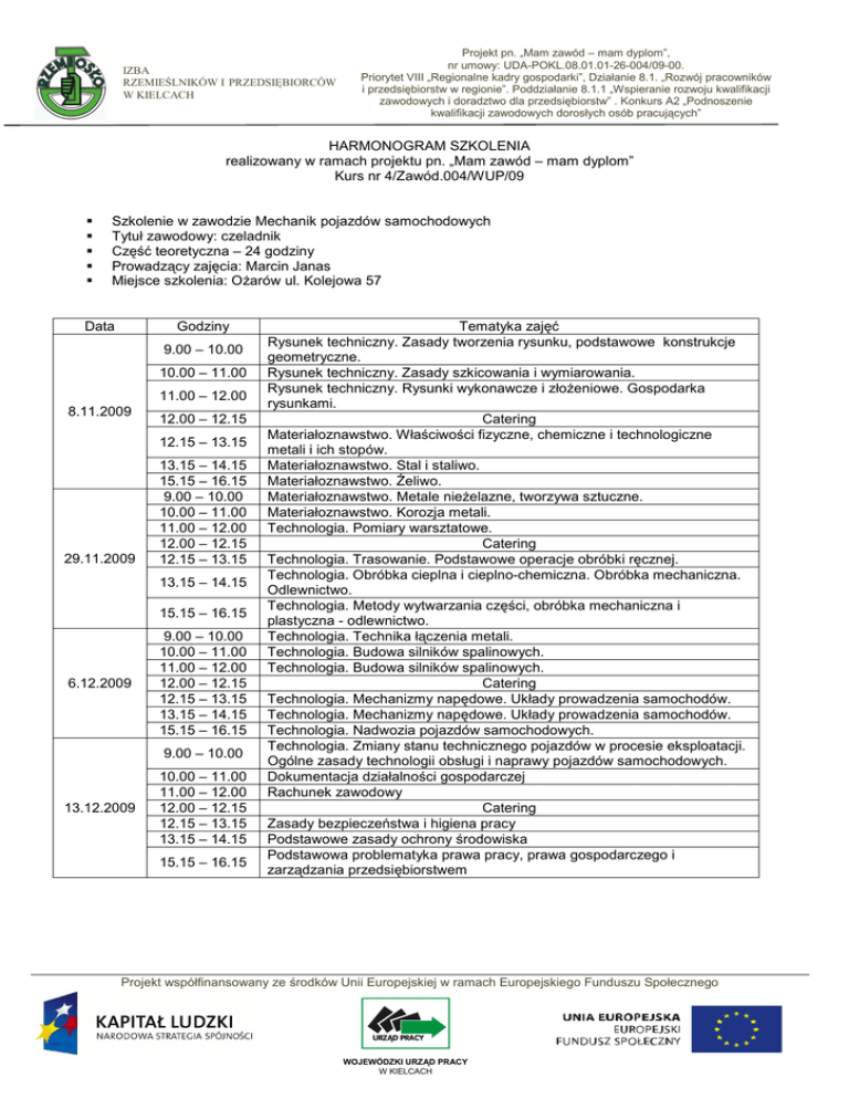 IZBA RZEMIEŚLNIKÓW I PRZEDSIĘBIORCÓW W KIELCACH Projekt pn. „Mam zawód – mam dyplom”, nr umowy: UDA-POKL.08.01.01-26-004/09-00. Priorytet VIII „Regionalne kadry gospodarki”, Działanie 8.1. „Rozwój pracowników i przedsiębiorstw w regionie”. Poddziałanie 8.1.1 „Wspieranie rozwoju kwalifikacji zawodowych i doradztwo dla przedsiębiorstw” . Konkurs A2 „Podnoszenie kwalifikacji zawodowych dorosłych osób pracujących” HARMONOGRAM SZKOLENIA realizowany w ramach projektu pn. „Mam zawód – mam dyplom” Kurs nr 4/Zawód.004/WUP/09 Szkolenie w zawodzie Mechanik pojazdów samochodowych Tytuł zawodowy: czeladnik Część teoretyczna – 24 godziny Prowadzący zajęcia: Marcin Janas Miejsce szkolenia: OŜarów ul. Kolejowa 57 Data Godziny 9.00 – 10.00 10.00 – 11.00 11.00 – 12.00 8.11.2009 12.00 – 12.15 12.15 – 13.15 29.11.2009 13.15 – 14.15 15.15 – 16.15 9.00 – 10.00 10.00 – 11.00 11.00 – 12.00 12.00 – 12.15 12.15 – 13.15 13.15 – 14.15 15.15 – 16.15 6.12.2009 9.00 – 10.00 10.00 – 11.00 11.00 – 12.00 12.00 – 12.15 12.15 – 13.15 13.15 – 14.15 15.15 – 16.15 9.00 – 10.00 13.12.2009 10.00 – 11.00 11.00 – 12.00 12.00 – 12.15 12.15 – 13.15 13.15 – 14.15 15.15 – 16.15 Tematyka zajęć Rysunek techniczny. Zasady tworzenia rysunku, podstawowe konstrukcje geometryczne. Rysunek techniczny. Zasady szkicowania i wymiarowania. Rysunek techniczny. Rysunki wykonawcze i złoŜeniowe. Gospodarka rysunkami. Catering Materiałoznawstwo. Właściwości fizyczne, chemiczne i technologiczne metali i ich stopów. Materiałoznawstwo. Stal i staliwo. Materiałoznawstwo. śeliwo. Materiałoznawstwo. Metale nieŜelazne, tworzywa sztuczne. Materiałoznawstwo. Korozja metali. Technologia. Pomiary warsztatowe. Catering Technologia. Trasowanie. Podstawowe operacje obróbki ręcznej. Technologia. Obróbka cieplna i cieplno-chemiczna. Obróbka mechaniczna. Odlewnictwo. Technologia. Metody wytwarzania części, obróbka mechaniczna i plastyczna - odlewnictwo. Technologia. Technika łączenia metali. Technologia. Budowa silników spalinowych. Technologia. Budowa silników spalinowych. Catering Technologia. Mechanizmy napędowe. Układy prowadzenia samochodów. Technologia. Mechanizmy napędowe. Układy prowadzenia samochodów. Technologia. Nadwozia pojazdów samochodowych. Technologia. Zmiany stanu technicznego pojazdów w procesie eksploatacji. Ogólne zasady technologii obsługi i naprawy pojazdów samochodowych. Dokumentacja działalności gospodarczej Rachunek zawodowy Catering Zasady bezpieczeństwa i higiena pracy Podstawowe zasady ochrony środowiska Podstawowa problematyka prawa pracy, prawa gospodarczego i zarządzania przedsiębiorstwem Projekt współfinansowany ze środków Unii Europejskiej w ramach Europejskiego Funduszu Społecznego WOJEWÓDZKI URZĄD PRACY W KIELCACH IZBA RZEMIEŚLNIKÓW I PRZEDSIĘBIORCÓW W KIELCACH Projekt pn. „Mam zawód – mam dyplom”, nr umowy: UDA-POKL.08.01.01-26-004/09-00. Priorytet VIII „Regionalne kadry gospodarki”, Działanie 8.1. „Rozwój pracowników i przedsiębiorstw w regionie”. Poddziałanie 8.1.1 „Wspieranie rozwoju kwalifikacji zawodowych i doradztwo dla przedsiębiorstw” . Konkurs A2 „Podnoszenie kwalifikacji zawodowych dorosłych osób pracujących” HARMONOGRAM SZKOLENIA realizowany w ramach projektu pn. „Mam zawód – mam dyplom” Kurs nr 4/Zawód.004/WUP/09 Szkolenie w zawodzie: mechanik pojazdów samochodowych Tytuł zawodowy: czeladnik Część praktyczna – 16 godzin Prowadzący zajęcia: Bolesław Śmigielski Miejsce szkolenia: : OŜarów, ul. Kolejowa 46 Data 14.11.2009 28.11.2009 Godziny 8.00 – 9.00 9.00 – 10.00 10.00 – 11.00 11.00 – 11.15 11.15 – 12.15 12.15 – 13.15 13.15 – 14.15 14.15 – 14.30 14.30 – 15.30 15.30 – 16.30 8.00 – 9.00 9.00 – 10.00 10.00 – 11.00 11.00 – 11.15 11.15 – 12.15 12.15 – 13.15 13.15 – 14.15 14.15 – 14.30 14.30 – 15.30 15.30 – 16.30 Tematyka zajęć Technika pomiarów warsztatowych. Obróbka ręczna materiałów metalowych i niemetalowych. Obróbka maszynowa materiałów metalowych i niemetalowych. Catering Obsługa techniczna silnika Obsługa techniczna silnika Obsługa techniczna silnika Catering Badania kontrolne samochodów na stanowisku diagnostycznym. Badania kontrolne samochodów na stanowisku diagnostycznym. Obsługa techniczna podwozi i układów prowadzenia samochodów. Obsługa techniczna podwozi i układów prowadzenia samochodów. Naprawa silnika Catering Naprawa silnika Prace monterskie podczas obsługi i naprawy samochodów. Weryfikacja części. Prace monterskie podczas obsługi i naprawy samochodów. Weryfikacja części. Catering Obsługa techniczna i naprawa wyposaŜenia elektrycznego. Konserwacja i zabiegi pielęgnacyjne w obsłudze samochodów. Projekt współfinansowany ze środków Unii Europejskiej w ramach Europejskiego Funduszu Społecznego WOJEWÓDZKI URZĄD PRACY W KIELCACH