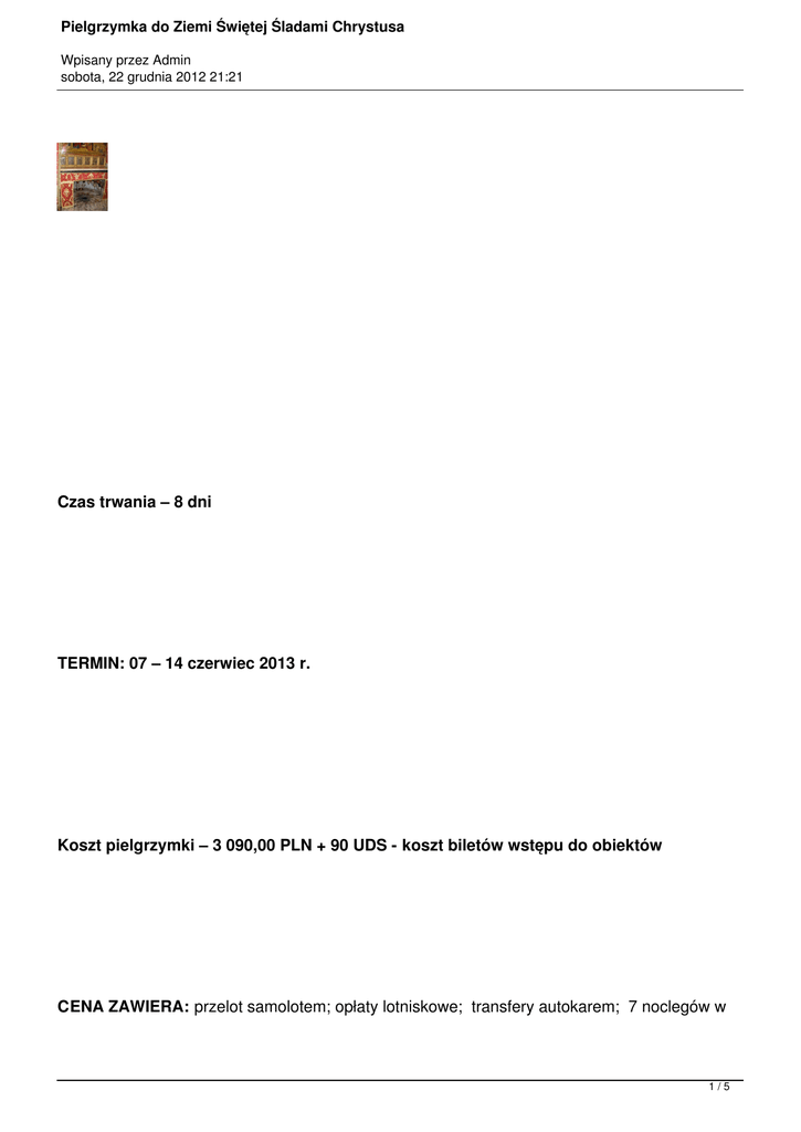 Koszt pielgrzymki – 3 090,00 PLN + 90 UDS - koszt biletów wstępu do obiektów