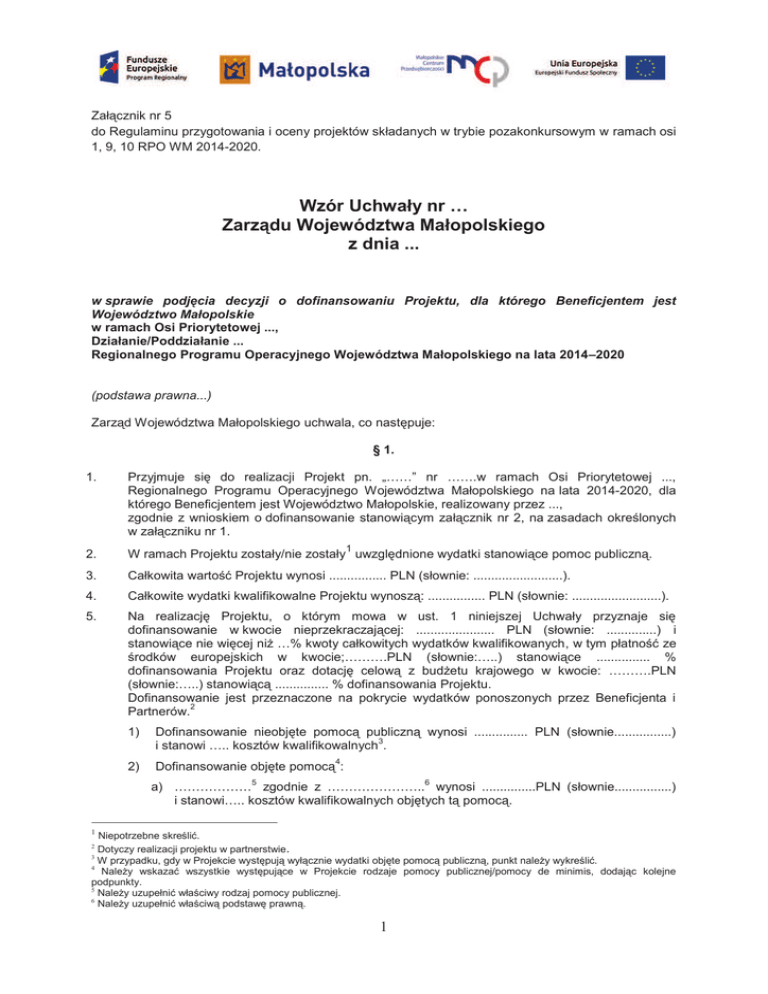 Załącznik nr 5 do Regulaminu przygotowania i oceny projektów składanych w trybie pozakonkursowym w ramach osi 1, 9, 10 RPO WM 2014-2020. Wzór Uchwały nr … Zarządu Województwa Małopolskiego z dnia ... w sprawie podjęcia decyzji o dofinansowaniu Projektu, dla którego Beneficjentem jest Województwo Małopolskie w ramach Osi Priorytetowej ..., Działanie/Poddziałanie ... Regionalnego Programu Operacyjnego Województwa Małopolskiego na lata 2014–2020 (podstawa prawna...) Zarząd Województwa Małopolskiego uchwala, co następuje: § 1. 1. Przyjmuje się do realizacji Projekt pn. „……” nr …….w ramach Osi Priorytetowej ..., Regionalnego Programu Operacyjnego Województwa Małopolskiego na lata 2014-2020, dla którego Beneficjentem jest Województwo Małopolskie, realizowany przez ..., zgodnie z wnioskiem o dofinansowanie stanowiącym załącznik nr 2, na zasadach określonych w załączniku nr 1. 2. W ramach Projektu zostały/nie zostały uwzględnione wydatki stanowiące pomoc publiczną. 3. Całkowita wartość Projektu wynosi ................ PLN (słownie: .........................). 4. Całkowite wydatki kwalifikowalne Projektu wynoszą: ................ PLN (słownie: .........................). 5. Na realizację Projektu, o którym mowa w ust. 1 niniejszej Uchwały przyznaje się dofinansowanie w kwocie nieprzekraczającej: ...................... PLN (słownie: ..............) i stanowiące nie więcej niż …% kwoty całkowitych wydatków kwalifikowanych, w tym płatność ze środków europejskich w kwocie;……….PLN (słownie:…..) stanowiące ............... % dofinansowania Projektu oraz dotację celową z budżetu krajowego w kwocie: ……….PLN (słownie:…..) stanowiącą ............... % dofinansowania Projektu. Dofinansowanie jest przeznaczone na pokrycie wydatków ponoszonych przez Beneficjenta i 2 Partnerów. 1 1) Dofinansowanie nieobjęte pomocą publiczną wynosi ............... PLN (słownie................) 3 i stanowi ….. kosztów kwalifikowalnych . 2) Dofinansowanie objęte pomocą : 4 5 6 a) ……………… zgodnie z ………………….. wynosi ...............PLN (słownie................) i stanowi….. kosztów kwalifikowalnych objętych tą pomocą. 1 Niepotrzebne skreślić. Dotyczy realizacji projektu w partnerstwie. 3 W przypadku, gdy w Projekcie występują wyłącznie wydatki objęte pomocą publiczną, punkt należy wykreślić. 4 Należy wskazać wszystkie występujące w Projekcie rodzaje pomocy publicznej/pomocy de minimis, dodając kolejne podpunkty. 5 Należy uzupełnić właściwy rodzaj pomocy publicznej. 6 Należy uzupełnić właściwą podstawę prawną. 2 1 6. Wkład własny Beneficjenta wynosi: ..................... PLN (słownie: .............................). 7. Beneficjent zobowiązuje się pokryć ze środków własnych wszelkie wydatki niekwalifikowalne w ramach Projektu. 8. Okres realizacji Projektu ustala się na: 1) 2) rozpoczęcie realizacji ………………(DD-MM-RRRR) zakończenie realizacji ………………(DD-MM-RRRR) §2 Udziela się pełnomocnictwa Panu/Pani … – (funkcja, nazwa jednostki) do realizacji Projektu zgodnie z wnioskiem o dofinansowanie projektu stanowiącym załącznik nr 2, na zasadach określonych w załączniku nr 1 do niniejszej Uchwały, w tym w szczególności do: 1) podpisywania wniosków o płatność wraz z wymaganymi załącznikami; 2) podpisywania wszelkich oświadczeń i dokumentów związanych z realizacją projektu; 3) potwierdzania za zgodność z oryginałem kopii dokumentów przygotowywanych w ramach projektu; 4) podpisywania wniosku o dofinansowanie wraz z załącznikami; 5) zgłaszania zmian zakresu rzeczowego projektu. §3 Załącznikami do niniejszej Uchwały są następujące dokumenty, przekazane za pośrednictwem systemu e-RPO, opatrzone podpisem kwalifikowanym: 1. Zasady realizacji projektów dla których Beneficjentem jest Województwo Małopolskie w ramach Regionalnego Programu Operacyjnego Województwa Małopolskiego na lata 2014 – 2020; 2. Wniosek o dofinansowanie; 3. Oświadczenie o kwalifikowalności podatku VAT; 4. Zasady przetwarzania danych osobowych; 5. Harmonogram płatności. §4 Wykonanie Uchwały powierza się ………... §5 Uchwała wchodzi w życie ………………. 2 UZASADNIENIE do Uchwały Nr … Zarządu Województwa Małopolskiego z dnia …. w sprawie realizacji Projektu pt. „...” w ramach Osi Priorytetowej ..., Działanie/Poddziałanie ... Regionalnego Programu Operacyjnego Województwa Małopolskiego na lata 2014–2020 (Należy wskazać uzasadnienie konieczności podjęcia uchwały). 3 Załącznik Nr 1 do Uchwały Nr …… Zarządu Województwa Małopolskiego z dnia ………………… Zasady realizacji projektów dla których Beneficjentem jest Województwo Małopolskie w ramach Regionalnego Programu Operacyjnego Województwa Małopolskiego na lata 2014-2020 § 1. Postanowienia ogólne Ilekroć w niniejszych zasadach jest mowa o: 1) „Beneficjencie” – należy przez to rozumieć Wnioskodawcę, którego projekt spełnia kryteria wyboru projektu i został wybrany do dofinansowania na podstawie Regulaminu przygotowania i oceny projektów składanych w trybie pozakonkursowym w ramach osi 1,9,10 RPO WM 2014-2020. W przypadku projektów, dla których Beneficjentem jest Województwo Małopolskie projekt zostaje przyjęty do realizacji Uchwałą ZWM w sprawie podjęcia decyzji o dofinansowaniu Projektu; 2) „Bezpiecznym podpisie elektronicznym” – należy przez to rozumieć podpis elektroniczny w rozumieniu art. 3 pkt. 2 ustawy z dnia 18 września 2001 r. o podpisie elektronicznym (Dz. U. z 2013 r. poz. 262 z późn. zm.), który jest przyporządkowany wyłącznie do osoby składającej ten podpis, jest sporządzany za pomocą podlegających wyłącznej kontroli osoby składającej podpis elektroniczny bezpiecznych urządzeń służących do składania podpisu elektronicznego i danych służących do skł