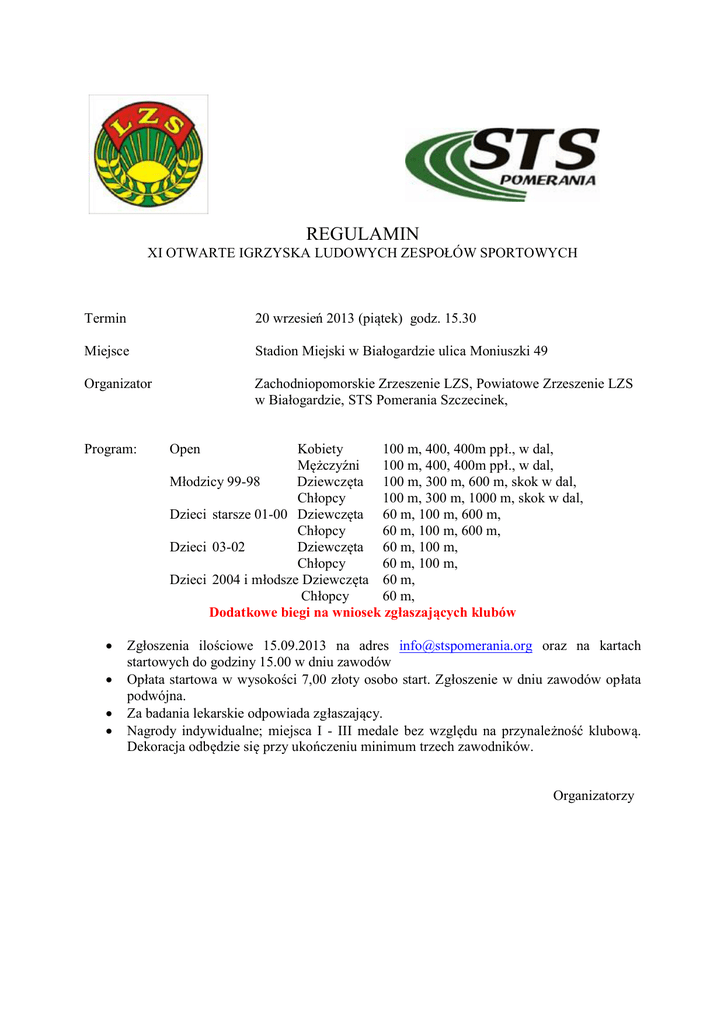 REGULAMIN XI OTWARTE IGRZYSKA LUDOWYCH ZESPOŁÓW SPORTOWYCH Termin 20 wrzesień 2013 (piątek) godz. 15.30 Miejsce Stadion Miejski w Białogardzie ulica Moniuszki 49 Organizator Zachodniopomorskie Zrzeszenie LZS, Powiatowe Zrzeszenie LZS w Białogardzie, STS Pomerania Szczecinek, Program: • • • • Open Kobiety 100 m, 400, 400m ppł., w dal, Mężczyźni 100 m, 400, 400m ppł., w dal, Młodzicy 99-98 Dziewczęta 100 m, 300 m, 600 m, skok w dal, Chłopcy 100 m, 300 m, 1000 m, skok w dal, Dzieci starsze 01-00 Dziewczęta 60 m, 100 m, 600 m, Chłopcy 60 m, 100 m, 600 m, Dzieci 03-02 Dziewczęta 60 m, 100 m, Chłopcy 60 m, 100 m, Dzieci 2004 i młodsze Dziewczęta 60 m, Chłopcy 60 m, Dodatkowe biegi na wniosek zgłaszających klubów Zgłoszenia ilościowe 15.09.2013 na adres [email protected] oraz na kartach startowych do godziny 15.00 w dniu zawodów Opłata startowa w wysokości 7,00 złoty osobo start. Zgłoszenie w dniu zawodów opłata podwójna. Za badania lekarskie odpowiada zgłaszający. Nagrody indywidualne; miejsca I - III medale bez względu na przynależność klubową. Dekoracja odbędzie się przy ukończeniu minimum trzech zawodników. Organizatorzy 15.45 60 m dz. skok w dal M 60 m chł. 400 m ppł. M 400 m ppł. K 400 m M 400 m K 100 m K 100 m M 600 m dz. 600 m ch. 1000 m chł. 300 m dz. 300 m ch. skok w dal K