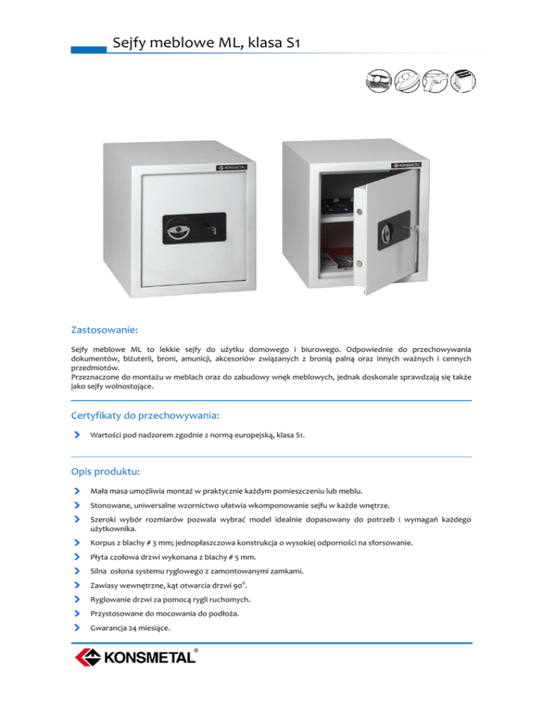 Sejfy meblowe ML, klasa S1 Zastosowanie: Sejfy meblowe ML to lekkie sejfy do użytku domowego i biurowego. Odpowiednie do przechowywania dokumentów, biżuterii, broni, amunicji, akcesoriów związanych z bronią palną oraz innych ważnych i cennych przedmiotów. Przeznaczone do montażu w meblach oraz do zabudowy wnęk meblowych, jednak doskonale sprawdzają się także jako sejfy wolnostojące. Certyfikaty do przechowywania: Wartości pod nadzorem zgodnie z normą europejską, klasa S1. Opis produktu: Mała masa umożliwia montaż w praktycznie każdym pomieszczeniu lub meblu. Stonowane, uniwersalne wzornictwo ułatwia wkomponowanie sejfu w każde wnętrze. Szeroki wybór rozmiarów pozwala wybrać model idealnie dopasowany do potrzeb i wymagań każdego użytkownika. Korpus z blachy # 3 mm; jednopłaszczowa konstrukcja o wysokiej odporności na sforsowanie. Płyta czołowa drzwi wykonana z blachy # 5 mm. Silna osłona systemu ryglowego z zamontowanymi zamkami. Zawiasy wewnętrzne, kąt otwarcia drzwi 900. Ryglowanie drzwi za pomocą rygli ruchomych. Przystosowane do mocowania do podłoża. Gwarancja 24 miesiące. Sejfy meblowe ML, klasa S1 Wyposażenie podstawowe: Zamek kluczowy kl. A z dwoma kluczami Półki z regulacją wysokości zawieszenia; maksymalne obciążenie półki 50 kg. Otwory umożliwiające kotwienie: 12 mm. Wyposażenie dodatkowe: Dodatkowy zamek szyfrowy, kluczowy lub elektroniczny (opcja dostępna dla modeli ML85-ML100); Trzeci klucz do zamka kluczowego; Otwór wrzutowy lub szuflada wrzutowa - sejf pełni funkcję wrzutni depozytowej; Wyprowadzenie instalacji alarmowej; Skrytki indywidualnie zamykane - dodatkowe zabezpieczenie; Dodatkowe półki ; Kotwy rozporowe do mocowania do podłoża; Uchwyt do plombowania Piankowy uchwyt na broń krótką: ML 30, ML 45 - uchwyt na 4 pistolety ML 67, ML 85, ML 100 - uchwyt na 6 pistoletów Rodzaje zamków: kluczowy szyfrowy elektroniczny Standardowe kolory: Jasnoszary RAL 7035 (domyślny przy zamówieniu, jeśli nie zaznaczono koloru) Jasnoszary RAL 9002 (należy zaznaczyć w zamówieniu, bezpłatny) Czarny RAL 9005 (należy zaznaczyć w zamówieniu, bezpłatny) *Na indywidualne zamówienie wszystkie kolory z palety RAL (lakier proszkowy) Sejfy meblowe ML, klasa S1 Dane techniczne: Wymiary zewnętrzne [mm] Wymiary wewnętrzne [mm] Model Waga Pojemność W S G W S G [kg] [l] ML 30 300 400 410 292 380 320 31 36 ML 45 450 400 440 442 380 350 42 60 ML 67 670 400 440 662 380 350 57 90 ML 85 850 490 440 842 470 350 63 141 ML 100 1000 490 440 992 470 350 86 166 Kombinacja Półki [szt.] Skrytka* ML 30, ML 45, ML 67 1 NIE NIE ML 85, ML 100 2 TAK TAK Model dwóch zamków* *Możliwość zastosowania jako wyposażenia dodatkowego Model Promień otwarcia drzwi R [mm] Prześwit drzwi [mm] W S ML 30 316 209 250 ML 45 316 359 250 ML 67 316 579 250 ML 85 406 759 340 ML 100 406 909 340 Model wrzutu* Maksymalne wymiary wrzucanego pakietu [mm] wysokość szerokość głębokość Otwór wrzutowy 38 170 - Szuflada wrzutowa 25 174 105 * opcje dostępne wyłącznie dla modeli ML 45 oraz ML 67. Sejfy meblowe ML, klasa S1 Montaż do podłoża: Kasy montowane są do podłoża dwoma stalowymi łącznikami rozporowymi (Rys.1). Rys. 1 Aby zamontować sejf do podłoża należy: 1. Ustawić sejf w miejscu przeznaczenia. 2. Zdjąć zaślepkę z otworów w dnie wyrobu. 3. Nawiercić otwory w podłożu przez otwory w wyrobie na głębokość odpowiadającą długości łącznika rozporowego. 4. Ustawić sejf tak, aby otwory w dnie sejfu i otwory w podłożu nachodziły na siebie. 5. Włożyć kotwę i dokręcić nakrętkę. W przypadku, gdy śruba łącznika rozporowego po dokręceniu nakrętki wystaje powyżej dna wewnątrz sejfu, należy poluzować nakrętkę, a następnie wkrętakiem wkręcić śrubę i dokręcić nakrętkę. 6. Przykryć otwory zaślepką. W przypadku, gdy sejf jest za mały aby nawiercić otwory przez otwory w sejfie (wiertarka nie mieści się do środka sejfu np. ze względu na wbudowane skarbczyki) należy: 1. 2. 3. 4. 5. Zmierzyć rozstaw otworów w sejfie. Natrasować usytuowanie otworów na podłożu. Nawiercić otwory w podłożu na głębokość odpowiadającą długości łącznika rozporowego. Ustawić sejf tak, aby otwory w dnie sejfu i otwory w podłożu nachodziły na siebie. Włożyć kotwę i dokręcić nakrętkę. W przypadku, gdy śruba łącznika rozporowego po dokręceniu nakrętki wystaje powyżej dna wewnątrz sejfu, należy poluzować nakrętkę, a następnie wkrętakiem wkręcić śrubę i dokręcić nakrętkę. 6. Przykryć otwory zaślepką. Obsługa sejfu – otwieranie*: Otwieranie wyrobów wyposażonych tylko w zamek kluczowy: 1. 2. Włożyć klucz do otworu zamka. Obrócić klucz o kąt pow. 90° (pow.1/4 obrotu) w prawą stronę, napotkany opór świadczy o otwarciu zamka, klucz musi pozostać w zamku (konstrukcja zamka kluczowego uniemożliwia wyjęcie klucza w pozycji otwartej zamka). 3. Obrócić pokrętło o około 30° (1/12 obrotu) w prawo , napotkany opór świadczy o odblokowaniu mechanizmów drzwi. 4. Po odciągnięciu drzwi do siebie następuje otwarcie wyrobu. Sejfy meblowe ML, klasa S1 Otwieranie wyrobów wyposażonych tylko w zamek szyfrowy: 1. Otworzyć zamek szyfrowy wykonując czynności opisane w dołączonej instrukcji obsługi zamka szyfrowego. 2. Obrócić pokrętło o około 30° (1/12 obrotu) w prawo, napotkany opór świadczy o odblokowaniu mechanizmów drzwi. 3. Po odciągnięciu drzwi do siebie następuje otwarcie wyrobu. Otwieranie wyrobów wyposażonych w zamki kluczowy i szyfrowy: 1. Otworzyć zamek szyfrowy zgodnie z dołączoną instrukcji obsługi zamka szyfrowego. 2. Włożyć klucz do otworu zamka. 3. Obrócić klucz o kąt pow. 90° (pow.1/4 obrotu) w prawą stronę, napotkany opór świadczy o otwarciu zamka, klucz musi pozostać w zamku (konstrukcja zamka kluczowego uniemożliwia wyjęcie klucza w pozycji otwartej zamka). 4. Obrócić pokrętło o około 30° (1/12 obrotu)