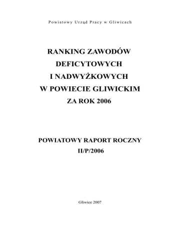 Powiatowy Urząd Pracy w Gliwicach RANKING ZAWODÓW DEFICYTOWYCH I NADWYŻKOWYCH W POWIECIE GLIWICKIM ZA ROK 2006 POWIATOWY RAPORT ROCZNY II/P/2006 Gliwice 2007 Monitoring zawodów deficytowych i nadwyżkowych w powiecie gliwickim w 2006 SPIS TREŚCI str Wstęp ....................................................................................................................................... 4 I. Założenia ogólne do monitoringu zawodów deficytowych i nadwyżkowych ...................... 5 II. Analiza i diagnoza ………………. .................................................................................... 10 1. Bezrobocie i oferty pracy ..……….......................................................................... 10 2. Edukacja ..…………................................................................................................ 13 3. Pracodawcy ………................................................................................................. 15 4. Zawody deficytowe i nadwyżkowe.......................................................................... 19 5. Podsumowanie........................................................................................................ 22 III. Prognoza ………….……………. .................................................................................... 25 IV. Wnioski . ………….……………. .................................................................................... 28 Załączniki ............................................................................................................................... 36 Załącznik nr 1. T-II/P-1. Bezrobotni według zawodów w powiecie gliwickim. Stan na koniec roku 2006 roku Załącznik nr 2. T-II/P-2. Napływ bezrobotnych według zawodów w powiecie gliwickim w 2006 roku. Załącznik nr 3. T-II/P-2. Napływ bezrobotnych według zawodów w powiecie gliwickim w 2006 roku Załącznik nr 4. Oferty pracy według zawodów w powiecie gliwickim w 2006 roku Załącznik nr 5. T-II/P-4. Zawody deficytowe i nadwyżkowe w powiecie gliwickim w 2006 roku Załącznik nr 6. T-II/P-5. Ranking zawodów deficytowych i nadwyżkowych w powiecie gliwickim w 2006 roku Załącznik nr 7. T-II/P-7. Ranking zawodów generujących długotrwałe bezrobocie w powiecie gliwickim w 2006 roku Załącznik nr 8. T-II/P-8. Ranking zawodów generujących długotrwałe bezrobocie w powiecie gliwickim w 2006 roku Załącznik nr 9. T-II/P-9. Bezrobotni wg rodzaju działalności ostatniego miejsca pracy oraz oferty pracy powiecie gliwickim w 2006 roku Załącznik nr 10. T-II/P-9a. Struktura bezrobotnych i ofert pracy według PKD w powiecie gliwickim w 2006 roku Powiatowy Urząd Pracy w Gliwicach 2 Monitoring zawodów deficytowych i nadwyżkowych w powiecie gliwickim w 2006 Załącznik nr 11. T-II/P-10. Ranking zawodów zgłoszonych w ofertach pracy w powiecie gliwickim w 2006 roku ze względu na wskaźnik szansy uzyskania oferty Załącznik nr 12. T-II/P-11. Ranking zawodów zgłoszonych w ofertach pracy w powiecie gliwickim w 2006 roku ze względu na wskaźnik szansy uzyskania oferty Załącznik nr 13. T-II/P-4.1. Absolwenci zarejestrowani w PUP w powiecie gliwickim według szkół i zawodów w roku 2006 oraz przewidywani absolwenci w roku 2007. Załącznik nr 14. T-II/P-4.2. Struktura zawodowa absolwentów według poziomu wykształcenia i zawodów w powiecie gliwickim w latach 2006 i 2007. Załącznik nr 15. T-II/P-3.1. Przewidywane przyjęcia i zwolnienia pracowników wg rodzaju prowadzonej według prowadzonej działalności w okresie od 31.10.2006 do 31.10.2070 Załącznik nr 16. T-II/P-3.4. Przewidywane przyjęcia i zwolnienia pracowników według grup zawodów w okresie od 31.10.2006 do 31.10.2070 Załącznik nr 17. T-II/P-4.1. Przewidywane przyjęcia i zwolnienia pracowników według grup zawodów w okresie od 31.10.2006 do 31.10.2070 Załącznik nr 18. T-II/P-5.1. katalog zawodów deficytowych i nadwyżkowych do raportu powiatowego. Powiatowy Urząd Pracy w Gliwicach 3 Monitoring zawodów deficytowych i nadwyżkowych w powiecie gliwickim w 2006 WSTĘP Ustawa z dnia 20 kwietnia 2004 r. o promocji zatrudnienia i instytucjach rynku pracy w artykule 8.1. mówi, iż do zadań samorządu województwa w zakresie polityki rynku pracy należy m.in.: opracowywanie analiz rynku pracy i badanie popytu na pracę, w tym prowadzenie monitoringu zawodów deficytowych i nadwyżkowych (pkt 3). Natomiast w artykule 9.1. jest mowa o zadaniach samorządu powiatu w zakresie polityki rynku pracy. Należy do nich m.in.: opracowywanie analiz i sprawozdań, w tym prowadzenie monitoringu zawodów deficytowych i nadwyżkowych oraz dokonywanie ocen dotyczących rynku pracy na potrzeby powiatowej rady zatrudnienia oraz organów zatrudnienia (pkt 9). Opierając się na powyższych zapisach ustawy oraz systemie statystyczno-sprawozdawczym z rynku pracy (sprawozdania: MPiPS-01, MPiPS-02, MPiPS-04, MPiPS-05 i MPiPS-06) wprowadzono „do praktyki działania powiatowych i wojewódzkich urzędów pracy oraz szkół ponadgimnazjalnych jednolitej metody, służącej bieżącej koordynacji szkolenia bezrobotnych oraz kierunków kształcenia zawodowego z potrzebami rynku pracy, o nazwie: „Monitoring zawodów deficytowych i nadwyżkowych”1. Wdrożenie monitoringu zawodów deficytowych i nadwyżkowych pozwala w szczególności na: określenie kierunków i natężenia zmian zachodzących w strukturze zawodowo-kwalifikacyjnej na lokalnych, regionalnych i krajowym rynku pracy, stworzenie bazy informacyjnej dla opracowania przyszłych struktur zawodowo- kwalifikacyjnych w układzie lokalnym, regionalnym i krajowym, określenie odpowiednich kierunków szkolenia bezrobotnych, zapewniając większą efektywność organizowanych szkoleń, bieżącą korektę poziomu, struktury i treści kształcenia zawodowego (dotyczy władz oświatowych oraz dyrekcji szkół), usprawnienie poradnictwa zawodowego poprzez wskazanie zawo
