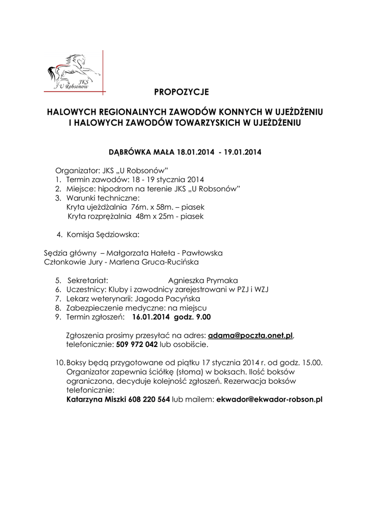 PROPOZYCJE HALOWYCH REGIONALNYCH ZAWODÓW KONNYCH W UJEŻDŻENIU I HALOWYCH ZAWODÓW TOWARZYSKICH W UJEŻDŻENIU DĄBRÓWKA MAŁA 18.01.2014 - 19.01.2014 Organizator: JKS „U Robsonów” 1. Termin zawodów: 18 - 19 stycznia 2014 2. Miejsce: hipodrom na terenie JKS „U Robsonów” 3. Warunki techniczne: Kryta ujeżdżalnia 76m. x 58m. – piasek Kryta rozprężalnia 48m x 25m - piasek 4. Komisja Sędziowska: Sędzia główny – Małgorzata Hałeła - Pawłowska Członkowie Jury - Marlena Gruca-Rucińska 5. 6. 7. 8. 9. Sekretariat: Agnieszka Prymaka Uczestnicy: Kluby i zawodnicy zarejestrowani w PZJ i WZJ Lekarz weterynarii: Jagoda Pacyńska Zabezpieczenie medyczne: na miejscu Termin zgłoszeń: 16.01.2014 godz. 9.00 Zgłoszenia prosimy przesyłać na adres: [email protected], telefonicznie: 509 972 042 lub osobiście. 10. Boksy będą przygotowane od piątku 17 stycznia 2014 r. od godz. 15.00. Organizator zapewnia ściółkę (słoma) w boksach. Ilość boksów ograniczona, decyduje kolejność zgłoszeń. Rezerwacja boksów telefonicznie: Katarzyna Miszki 608 220 564 lub mailem: [email protected] 11. Program zawodów: RUNDA 1 RUNDA 2 RUNDA 3 RUNDA 4 RUNDA 5 RUNDA 6 RUNDA 7 RUND8 Sobota 18.01.2014 rozpoczęcie konkursów godz. 1100 Niedziela 19.01.2014 r. rozpoczęcie konkursów godz. 1000 L-1 P-1 N-7 C-3 CC-1 N-1 (KUCE) P-2 CS-2 L-2 P-4 N-8 C-4 CC-2 N-2 (KUCE) P-3 CS-4 W Rundzie L dopuszcza się start zawodników i koni niezarejestrowanych w WZJ 12. Obowiązują przepisy PZJ. 13. Warunkiem startu w Zawodach Towarzyskich - Amatorów bez licencji jest: • Posiadanie aktualnych badań lekarskich przez zawodników, wydanych przez lekarza sportowego • W przypadku osób niepełnoletnich pisemna zgoda rodziców na start w zawodach jeździeckich • Minimalny wiek jeźdźca 10 lat. • Dla konia paszport hodowlany oraz aktualne szczepienia przeciwko grypie. • Minimalny wiek konia 4 lata, a dla jeźdźców do 11 lat – minimalny wiek konia 6 lat. • Ubezpieczenie NNW 14. Opłaty od jednego konia: • wpisowe 100 zł; • startowe: 20 zł; w całości przeznaczone na fundusz nagród w konkursie • opłata za boks stajnia 200 zł, wiata 150 zł. 15. NAGRODY: - puchary, flot’s dla koni, nagrody pieniężne dla zwycięzców rund: (100% ze startowego dla 25% startujących) - warunkiem wypłaty nagród pieniężnych jest udział co najmniej 3 koni w konkursie 16. Organizator zastrzega sobie prawo dokonania zmian w programie zawodów. 17. Za ewentualne kradzieże, wypadki, szkody i zdarzenia losowe powstałe w czasie trwania zawodów lub podczas transportu organizator nie ponosi odpowiedzialności. 18. Dojazd i transport koni na własny koszt. 19. Zakwaterowanie na terenie JKS U ROBSONÓW: Rezerwacja telefonicznie: Katarzyna Maczuga – Mękal 697-838-625, 502-737-825 lub mailem: [email protected] Decyduje kolejność zgłoszeń. 20. Istnieje możliwość podłączenia koniowozu do prądu. Cena 4zł/kWh +VAT (według wskazań licznika) Strona JKS U Robsonów z propozycjami i wynikami zawodów www.ekwador- robson.pl