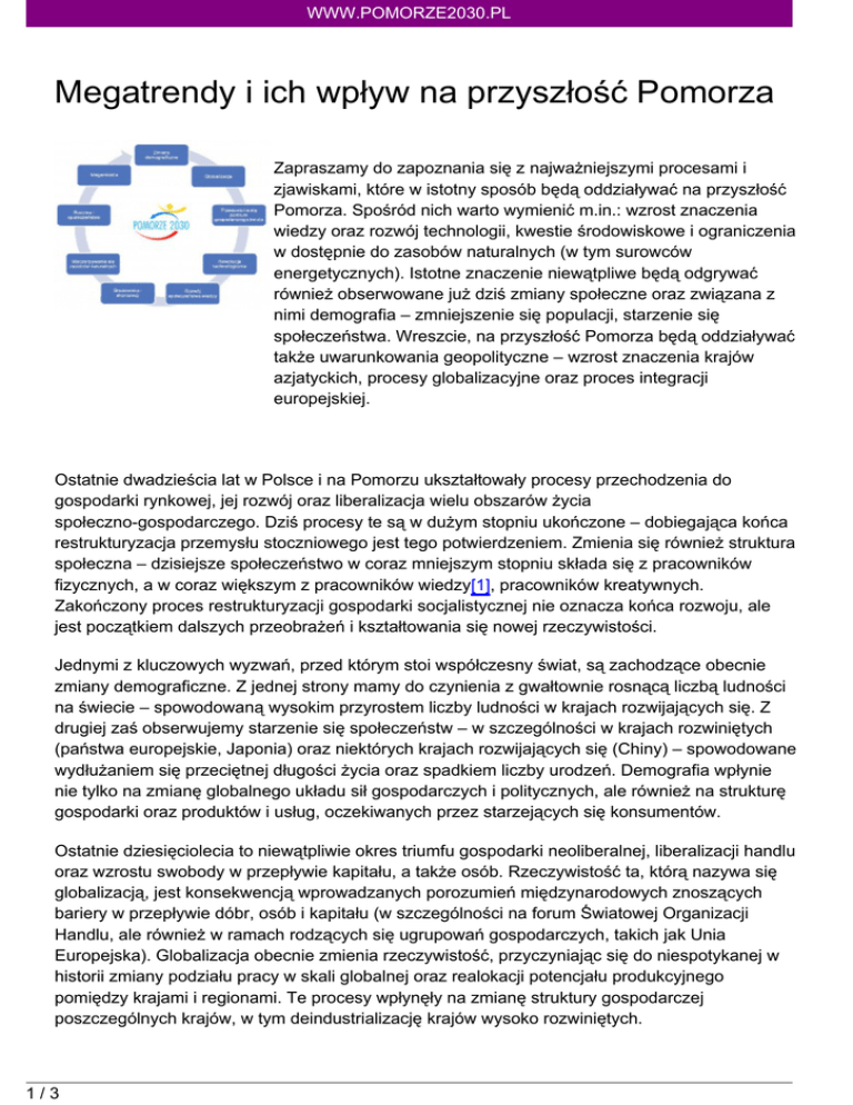 WWW.POMORZE2030.PL Megatrendy i ich wpływ na przyszłość Pomorza Zapraszamy do zapoznania się z najważniejszymi procesami i zjawiskami, które w istotny sposób będą oddziaływać na przyszłość Pomorza. Spośród nich warto wymienić m.in.: wzrost znaczenia wiedzy oraz rozwój technologii, kwestie środowiskowe i ograniczenia w dostępnie do zasobów naturalnych (w tym surowców energetycznych). Istotne znaczenie niewątpliwe będą odgrywać również obserwowane już dziś zmiany społeczne oraz związana z nimi demografia – zmniejszenie się populacji, starzenie się społeczeństwa. Wreszcie, na przyszłość Pomorza będą oddziaływać także uwarunkowania geopolityczne – wzrost znaczenia krajów azjatyckich, procesy globalizacyjne oraz proces integracji europejskiej. Ostatnie dwadzieścia lat w Polsce i na Pomorzu ukształtowały procesy przechodzenia do gospodarki rynkowej, jej rozwój oraz liberalizacja wielu obszarów życia społeczno-gospodarczego. Dziś procesy te są w dużym stopniu ukończone – dobiegająca końca restrukturyzacja przemysłu stoczniowego jest tego potwierdzeniem. Zmienia się również struktura społeczna – dzisiejsze społeczeństwo w coraz mniejszym stopniu składa się z pracowników fizycznych, a w coraz większym z pracowników wiedzy[1], pracowników kreatywnych. Zakończony proces restrukturyzacji gospodarki socjalistycznej nie oznacza końca rozwoju, ale jest początkiem dalszych przeobrażeń i kształtowania się nowej rzeczywistości. Jednymi z kluczowych wyzwań, przed którym stoi współczesny świat, są zachodzące obecnie zmiany demograficzne. Z jednej strony mamy do czynienia z gwałtownie rosnącą liczbą ludności na świecie – spowodowaną wysokim przyrostem liczby ludności w krajach rozwijających się. Z drugiej zaś obserwujemy starzenie się społeczeństw – w szczególności w krajach rozwiniętych (państwa europejskie, Japonia) oraz niektórych krajach rozwijających się (Chiny) – spowodowane wydłużaniem się przeciętnej długości życia oraz spadkiem liczby urodzeń. Demografia wpłynie nie tylko na zmianę globalnego układu sił gospodarczych i politycznych, ale również na strukturę gospodarki oraz produktów i usług, oczekiwanych przez starzejących się konsumentów. Ostatnie dziesięciolecia to niewątpliwie okres triumfu gospodarki neoliberalnej, liberalizacji handlu oraz wzrostu swobody w przepływie kapitału, a także osób. Rzeczywistość ta, którą nazywa się globalizacją, jest konsekwencją wprowadzanych porozumień międzynarodowych znoszących bariery w przepływie dóbr, osób i kapitału (w szczególności na forum Światowej Organizacji Handlu, ale również w ramach rodzących się ugrupowań gospodarczych, takich jak Unia Europejska). Globalizacja obecnie zmienia rzeczywistość, przyczyniając się do niespotykanej w historii zmiany podziału pracy w skali globalnej oraz realokacji potencjału produkcyjnego pomiędzy krajami i regionami. Te procesy wpłynęły na zmianę struktury gospodarczej poszczególnych krajów, w tym deindustrializację krajów wysoko rozwiniętych. 1/3 WWW.POMORZE2030.PL Zachodzące procesy demograficzne, globalizacja oraz szybszy rozwój gospodarczy określonych regionów przyczyniają się również do masowych migracji ludności, zarówno wewnątrz poszczególnych krajów, jak i w układzie międzynarodowym. Jedną z istotnych konsekwencji tych procesów jest dynamiczny rozwój dużych aglomeracji – megamiast, które koncentrują coraz większy potencjał gospodarczy i ludnościowy oraz stają się kluczowymi węzłami (hubami) globalnej gospodarki. W przyszłości można zakładać, że znaczenie takich centrów będzie jeszcze rosło, te miasta zaś, które znajdą się poza siecią globalnych powiązań, będą szybko ulegać peryferyzacji. Zbliżająca się rewolucja technologiczna będzie również w istotny sposób wpływać na poziom życia w nadchodzących dziesięcioleciach. Z jednej strony przełom technologiczny, bądź jego brak, będzie decydował o tym, czy uda się rozwiązać wyzwania, przed którymi stoi dziś świat: wyczerpywanie się surowców energetycznych, zanieczyszczenie środowiska i katastrofy naturalne, brak rąk do pracy czy bezpieczeństwo żywnościowe. Z drugiej strony jeśli nastąpi oczekiwany przełom technologiczny, kraje i przedsiębiorstwa, które będą w nim uczestniczyć (lub będą w stanie za nim nadążyć), uzyskają niewątpliwie istotną przewagę konkurencyjną. Współcześnie obserwuje się również zmiany społeczne, które istotnie wpłyną na rzeczywistość w przyszłości. Jedną z kluczowych przeobrażeń jest zmiana roli i znaczenia kobiet. Obecnie obserwuje się wzrost aktywności zawodowej kobiet oraz opóźnianie decyzji o urodzeniu pierwszego dziecka. Zmienia się również model rodziny – rośnie liczba związków pozamałżeńskich, rodziny stają się mniej liczne, a więzi międzypokoleniowe istotnie się rozluźniają. Procesy te – jeśli trendy te się nie zmienią – będą prowadzić do mniejszego przyrostu naturalnego oraz dalszego starzenia się społeczeństwa. Będą one wywierały presję na finanse publiczne, a w konsekwencji mogą prowadzić do zaostrzenia się konfliktów międzypokoleniowych. Poza wspomnianymi trendami warto również podkreślić znaczenie zachodzących obecnie zmian geopolitycznych. Dwa obserwowane zjawiska będą miały kluczowy wpływ na uwarunkowania, które ukształtują życie w społeczeństwach w nadchodzących dekadach. Pierwszym z nich jest niewątpliwie obserwowany obecnie wyraźny wzrost znaczenia gospodarek krajów rozwijających się (azjatyckich/BRIC[2]), czego przejawem jest chociażby powstanie grupy G20 i de facto przejęcie przez nią roli odgrywanej poprzednio przez G8. Czy ten trend jest nieodwracalny, a tym bardziej, czy kraje rozwinięte zastąpią dzisiejszych liderów gospodarczych świata (Stany Zjednoczone, Euro