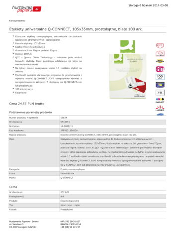 Starogard Gdański 2017-03-08 Karta produktu: Etykiety uniwersalne Q-CONNECT, 105x35mm, prostokątne, białe 100 ark. Klasyczne etykiety samoprzylepne, odpowiednie do drukarek laserowych, atramentowych i kserokopiarek Rozmiar etykiety: 105x35mm Liczba etykiet na arkuszu: 16 Gramatura: front 70gsm, podkład 55gsm Białość: 150 CIE QCT - Quatro Clean Technology - ochronne pole wzdłuż krawędzi etykiety, które zapobiega odkładaniu się kleju na mechanizmie drukarki Na tylnej stronie opakowania widok 1:1 rozkładu etykiet na arkuszu Możliwość pobrania darmowego programu do projektowania i wydruku etykiet Q-CONNECT SOFT kompatybilny również z oprogramowaniem Windows 7 dostępny na Q-CONNECT.com lub pbspolska.eu 100 arkuszy w j.s. Kolor biały Cena 24,37 PLN brutto Podstawowe parametry produktu Numer produktu w systemie 16624 Nr dostawcy KF10653 Nr Celcen 14-00312-3 Kod kreskowy 5705831106536 Nazwa produktu Etykiety uniwersalne Q-CONNECT, 105x35mm, prostokątne, białe 100 ark. Opis Klasyczne etykiety samoprzylepne, odpowiednie do drukarek laserowych, atramentowych i kserokopiarek; rozmiar etykiety: 105x35mm; liczba etykiet na arkuszu: 16; gramatura: front 70gsm, podkład 55gsm; białość: 150 CIE; QCT - Quatro Clean Technology - ochronne pole wzdłuż krawędzi etykiety, które zapobiega odkładaniu się kleju na mechanizmie drukarki; na tylnej stronie opakowania widok 1:1 rozkładu etykiet na arkuszu; możliwość pobrania darmowego programu do projektowania i wydruku etykiet Q-CONNECT SOFT kompatybilny również z oprogramowaniem Windows 7 dostępny na Q-CONNECT.com lub pbspolska.eu; 100 arkuszy w j.s.; kolor biały Kategoria Etykiety samoprzylepne Klasa Ekonomiczne Marka Q-CONNECT Cecha W ofercie od 2013-01 Ekologiczność B.d. Produkt Etykiety klasyczne Typ Inkjet, laser, copier Kształt Prostokątne Hurtowania Papieru - Borma ul. Sambora 3 83-200 Starogard Gdański NIP: 592 10 36 627 REGON: 190916154 +48 (58) 56 221 37 Starogard Gdański 2017-03-08 Karta katalogowa produktu cd. Etykiety uniwersalne Q-CONNECT, 105x35mm, prostokątne, białe 100 ark. Materiał Papier Wymiary Gramatura (g/m2) 70/55 Wymiary (mm) 105x35 Wspólny słownik zamówień CPV 30192800-9 Etykiety samoprzylepne Certyfikaty Hit Hit Nowy produkt w ofercie Standard Ilość Ilość arkuszy 100 Ilość etykiet na arkuszu 16 Kolor Kolor Biały Pozostałe zdjęcia produktu Serdecznie zapraszamy do współpracy Hurtowania Papieru - Borma zespół. Hurtowania Papieru - Borma ul. Sambora 3 83-200 Starogard Gdański NIP: 592 10 36 627 REGON: 190916154 +48 (58) 56 221 37