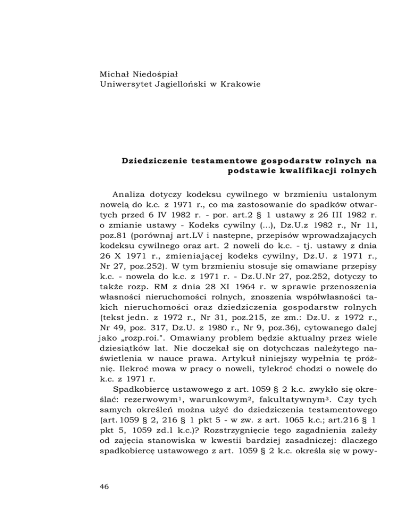Michał Niedośpiał Uniwersytet Jagielloński w Krakowie Dziedziczenie testamentowe gospodarstw rolnych na podstawie kwalifikacji rolnych Analiza dotyczy kodeksu cywilnego w brzmieniu ustalonym nowelą do k.c. z 1971 r., co ma zastosowanie do spadków otwartych przed 6 IV 1982 r. - por. art.2 § 1 ustawy z 26 III 1982 r. o zmianie ustawy - Kodeks cywilny (...), Dz.U.z 1982 r., Nr 11, poz.81 (porównaj art.LV i następne, przepisów wprowadzających kodeksu cywilnego oraz art. 2 noweli do k.c. - tj. ustawy z dnia 26 X 1971 r., zmieniającej kodeks cywilny, Dz.U. z 1971 r., Nr 27, poz.252). W tym brzmieniu stosuje się omawiane przepisy k.c. - nowela do k.c. z 1971 r. - Dz.U.Nr 27, poz.252, dotyczy to także rozp. RM z dnia 28 XI 1964 r. w sprawie przenoszenia własności nieruchomości rolnych, znoszenia współwłasności takich nieruchomości oraz dziedziczenia gospodarstw rolnych (tekst jedn. z 1972 r., Nr 31, poz.215, ze zm.: Dz.U. z 1972 r., Nr 49, poz. 317, Dz.U. z 1980 r., Nr 9, poz.36), cytowanego dalej jako „rozp.roi.". Omawiany problem będzie aktualny przez wiele dziesiątków lat. Nie doczekał się on dotychczas należytego naświetlenia w nauce prawa. Artykuł niniejszy wypełnia tę próżnię. Ilekroć mowa w pracy o noweli, tylekroć chodzi o nowelę do k.c. z 1971 r. Spadkobiercę ustawowego z art. 1059 § 2 k.c. zwykło się określać: rezerwowym 1 , warunkowym 2 , fakultatywnym 3 . Czy tych samych określeń można użyć do dziedziczenia testamentowego (art. 1059 § 2, 216 § 1 pkt 5 - w zw. z art. 1065 k.c.; art.216 § 1 pkt 5, 1059 zd.l k.c.)? Rozstrzygnięcie tego zagadnienia zależy od zajęcia stanowiska w kwestii bardziej zasadniczej: dlaczego spadkobiercę ustawowego z art. 1059 § 2 k.c. określa się w powy- 46 Dziedziczenie testamentowe gospodarstw.. ższy sposób? I tu często doktryna nie zajmuje jednoznacznego stanowiska. 1) Nieraz rzecz ujmuje się tak, jakby o spadkobiercy rezerwowym (powyższe określenia należy traktować zamiennie) można mówić tylko wtedy, gdy zostanie zrealizowany cały stan faktyczny art.1059 § 2 k.c. i przez wzgląd na ów pełny stan faktyczny (kwalifikacje rolne, stosowne oświadczenie, brak współspadkobierców ustawowych z art. 1059 § 1 pkt. 1 - 3 k.c.) określa się takiego spadkobiercę powyższym mianem. 2) Innym razem zagadnienie ujmuje się tak, jakby tego określenia używano tylko ze względu na wymóg nieistnienia współspadkobiercy ustawowego z art.1059 § 1 pkt.l -3 k.c.4 3) Inni z kolei używają tego określenia ze względu na dwie dodatkowe przesłanki, występujące w art.1059 § 2 k.c. (oświadczenie, nieistnienia spadkobierców ustawowych z art. 1059 § 1 pkt. 1-3), zaś nie ma ich w artykule 1059 § 1 k.c.5 Należy przyjąć trzecie rozwiązanie, ale obojętnie, jak tę rzecz rozstrzygnąć, wspomniane zasady nie są aktualne przy dziedziczeniu testamentowym. De lege lata niewątpliwe jest, że w przypadku osób nie powołanych z ustawy do dziedziczenia gospodarstwa rolnego (art.216 § 1 pkt 5 w zw. z art.1065 zd.l k.c.) nie stosuje się przesłanki negatywnej (nieistnienie spadkobierców, spełniających wymogi z art. 1059 § 1 pkt. 1-3 k.c.), a jak zostanie wykazane dalej, tak samo jest przy osobach powołanych z ustawy do gospodarstwa rolnego (choć w tym ostatnim przypadku niektórzy przyjmują inne rozwiązanie). Dlatego nazwa: „spadkobierca rezerwowy" nie jest adekwatna na tle dziedziczenia testamentowego (to samo odnosi się do innych przytoczonych określeń). Jeśli używa się jej, to należy pamiętać, że ma ona trochę inną treść niż art.1059 § 2 k.c. (zwłaszcza brak tutaj przesłanki negatywnej, tam wymienionej). Dlatego lepiej używać sformułowania: dziedziczenia na podstawie kwalifikacji rolnych, które jest adekwatne zarówno na tle dziedziczenia ustawowego, jak i testamentowego. W analizowanej sytuacji pewne zagadnienia są w doktrynie niewątpliwie (ko- 47 REJENT Nr 1 - styczeń 1993 r. nieczność złożenia przez takiego spadkobiercę testamentowego stosownego oświadczenia w określonym terminie, wymóg kwalifikacji rolnych). Jednak są również zagadnienia dyskusyjne, zwłaszcza to - czy sformułowana w art. 1059 § 2 k.c. przesłanka negatywna ma zastosowanie także do dziedziczenia testamentowego. Oczywiście, są również inne kwestie dyskusyjne, czego ma dotyczyć oświadczenie (pracy czy indywidualnego gospodarstwa rolnego) i jaki jest zakres przedmiotowy tego oświadczenia (ma ono dotyczyć spadkowego gospodarstwa rolnego czy też każdego indywidualnego gospodarstwa rolnego). Występuje nadto cały szereg zagadnień bardzo szczegółowych. Wszystkie one zostaną omówione w dalszej części, tu należy zatrzymać się przede wszystkim nad przesłanką negatywną oraz tak ująć inne przesłanki, aby dać podstawę do uogólnień zarówno dla okresu sprzed, jak i po noweli k.c. Zanim przedstawione zostanie stanowisko doktryny, orzecznictwa - przed i po noweli k.c. - należy rozważyć pewne zagadnienia teoretyczne, starając się stworzyć model konstrukcyjny, przydatny do klasyfikacji poglądów doktryńy i orzecznictwa. Wariant I. Spadkobierca testamentowy może dziedziczyć gospodarstwo rolne, jeżeli ma (x) kwalifikacje rolne i (y) złoży stosowne oświadczenie (w przepisanym terminie), a nadto: (z) żaden współspadkobierca gospodarstwa rolnego, testamentowy lub ustawowy (art.926 § 3 w zw. z art. 1058 k.c.), jak również żaden ze spadkobierców ustawowych gospodarstwa rolnego, który by to gospodarstwo dziedziczył, gdyby doszło do dziedziczenia ustawowego - nie odpowiada przesłankom z art. 1059 § 1 pkt. 1-3 k.c. Wariant II. Przyjmuje się tylko przesłanki x, y, natomiast nie uwzględnia się przesłanki z. Spadkobiercą testamentowym może być zatem osoba, która ma kwalifikacje rolne oraz złoży stosowne oświadczenie (w przepisanym terminie); natomiast nie jest istotne, czy współspadkobierca testamentowy, ustawowy (art. 926 § 3 w zw.z 