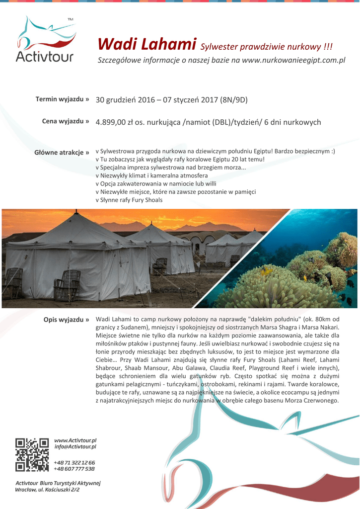 Wadi Lahami Sylwester prawdziwie nurkowy !!! Szczegółowe informacje o naszej bazie na www.nurkowanieegipt.com.pl Termin wyjazdu » 30 grudzień 2016 – 07 styczeń 2017 (8N/9D) Cena wyjazdu » 4.899,00 zł os. nurkująca /namiot (DBL)/tydzień/ 6 dni nurkowych Główne atrakcje » v Sylwestrowa przygoda nurkowa na dziewiczym południu Egiptu! Bardzo bezpiecznym :) v Tu zobaczysz jak wyglądały rafy koralowe Egiptu 20 lat temu! v Specjalna impreza sylwestrowa nad brzegiem morza... v Niezwykły klimat i kameralna atmosfera v Opcja zakwaterowania w namiocie lub willi v Niezwykłe miejsce, które na zawsze pozostanie w pamięci v Słynne rafy Fury Shoals Opis wyjazdu » Wadi Lahami to camp nurkowy położony na naprawdę "dalekim południu" (ok. 80km od granicy z Sudanem), mniejszy i spokojniejszy od siostrzanych Marsa Shagra i Marsa Nakari. Miejsce świetne nie tylko dla nurków na każdym poziomie zaawansowania, ale także dla miłośników ptaków i pustynnej fauny. Jeśli uwielbiasz nurkować i swobodnie czujesz się na łonie przyrody mieszkając bez zbędnych luksusów, to jest to miejsce jest wymarzone dla Ciebie… Przy Wadi Lahami znajdują się słynne rafy Fury Shoals (Lahami Reef, Lahami Shabrour, Shaab Mansour, Abu Galawa, Claudia Reef, Playground Reef i wiele innych), będące schronieniem dla wielu gatunków ryb. Często spotkać się można z dużymi gatunkami pelagicznymi - tuńczykami, ostrobokami, rekinami i rajami. Twarde koralowce, budujące te rafy, uznawane są za najpiękniejsze na świecie, a okolice ecocampu są jednymi z najatrakcyjniejszych miejsc do nurkowania w obrębie całego basenu Morza Czerwonego. RAMOWY PROGRAM IMPREZY w opcji 30.12.2016 - 07.01.2017 Dzień 1 - 30.12 » Zbiórka na lotniku na 2 godziny przed wylotem: KTW lub WAW, Odprawa paszportowo-bagażowa, Wylot do Marsa Alam, Przylot do Egiptu, Transfer z lotniska do campu (ok. 2-2,5h z lotniska w Marsa Alam), Zakwaterowanie w namiotach/willach, zapoznanie z bazą, Czas wolny, kolacja, nocleg. Dzień 2 - 31.12 » Śniadanie ok. 07:00, Przygotowanie do wypłynięcia na 2 nurkowania (nurkowanie z RIB – u), Dwa nurkowania na rafach Fury Shoals (w przerwie można napić się kawy/herbaty i zjeść ciasto), Powrót do campu na lunch, Czas wolny, Przygotowanie do imprezy sylwestrowej nad brzegiem morza, Powitanie roku 2017 i zabawa do białego rana w scenerii gór, pustyni oraz morza:) Dzień 3 – 01.01 » Śniadanie w godzinach późno porannych, Wolne przedpołudnie, Lunch, Nurkowanie na powitanie Nowego Roku 2017 na pobliskich rafach (nurkowanie z RIB – u), Powrót do bazy, Drugie nurkowanie nocne (nurkowanie z RIB – u), Powrót na kolację, czas wolny, nocleg. Dzień 4, 5, 6, 7 Śniadanie ok. 06:00, 02.01 - 5.01 » Przygotowanie do wypłynięcia na 2 nurkowania (nurkowanie z RIB – u), Dwa nurkowania na rafach Fury Shoals (w przerwie można napić się kawy/herbaty i zjeść ciasto), Powrót do campu na lunch, Trzecie nurkowanie na pobliskich rafach (nurkowanie z RIB – u), Powrót do bazy, Czwarte nurkowanie nocne (nurkowanie z RIB – u), Powrót na kolację, czas wolny, nocleg. Dzień 8 - 06.01 » Śniadanie, Czas wolny – możliwość dokupienia dodatkowych nurkowań, Lunch, W OPCJI - Popołudniowa wycieczka na Quadach przez pustynię (3h), Kolacja pożegnalna i czas wolny. Dzień 9 - 07.01 » Śniadanie, Wykwaterowanie z campu, Transfer na lotnisko w Marsa Alam, Odprawa paszportowo-bagażowa, Przelot do Polski, Zakończenie imprezy. OPIS ECOCAMPU NURKOWEGO WADI LAHAMI Opis główny campu » Do miejsc nurkowych dociera się pontonami typu RIB. Przewodnicy opracowali program podwodnych wycieczek, trwających z reguły 60 minut każda. Wymagane jest minimum 20 zalogowanych nurkowań i obowiązkowe posiadanie komputera nurkowego (można go wypożyczyć na miejscu za 10 EUR/dzień). Jedynie dwa pierwsze nurkowania w ciągu dnia odbywają się w asyście przewodnika. Trzecie nurkowanie wykonywane jest samodzielnie (w parach), podobnie jak nocne. Zaplecze nurkowe wyposażone jest w zbiorniki ze słodką wodą do płukania sprzętu i wieszaki na sprzęt, a także w dostęp do elektryczności 220 V do ładowania akumulatorów latarek i sprzętu fotograficznego. Zaleca się, by korzystający z elektryczności goście posiadali szybkie ładowarki (max. 6 godzin). Butle nurkowe, znajdujące się na wyposażeniu campu są aluminiowe o pojemności 12l. Po każdym nurkowaniu można skorzystać z pryszniców. Podczas pobytu w Wadi Lahami zapewniane jest pełne wyżywienie - 3 posiłki w ciągu dnia oraz słodka przekąska na podwieczorek. Ci z gości, którzy wymagają specjalnej diety, proszeni są o zgłoszenie tego faktu w momencie dokonywania rezerwacji. W przypadku wykonywania nurkowań nocnych, nurkowie proszeni są o zgłaszanie, czy kolacja ma być podana przed czy po nurkowaniu. Do posiłków przewidziane są zimne napoje, woda, kawa i herbata, piwo dostępne za opłatą. Wszystkie płatne napoje i usługi zostaną rozliczone zbiorczym rachunkiem pod koniec pobytu. Zaleca się, by goście mieli przy sobie gotówkę lub czeki podróżne, bowiem przy płatnością kartą doliczana jest dopłata transakcyjna w wysokości 3%. Rzeczy wartościowe można zamknąć w sejfie na cały okres pobytu w obozie. OPIS ECOCAMPU NURKOWEGO WADI LAHAMI Opis namiotów» Namioty w Wadi Lahami stoją tuż przy plaży, jest ich w sumie 30, powierzchnia każdego z nich wynosi 12m². W każdym z namiotów znajdują się dwa łóżka ustawione w odległości 2m od siebie. Na wyposażeniu są: dwa prześcieradła, koce i poduszki (dla każdego z gości). Obsługa w obozie zawsze służy pomocą, jeśli potrzebny jest dodatkowy materac lub pościel. Namioty mają dostęp do elektryczności, jednak przydaje się latarka czołowa, żeby bezpiecznie poruszać się po terenie campu w godzinach wieczornych. Prysznice i toalety zlokalizowane są w głównym budynku. Goście muszą zabrać ze sobą ręczniki (zarówno te do c