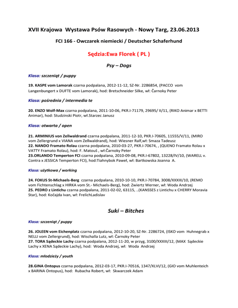 XVII Krajowa Wystawa Psów Rasowych - Nowy Targ, 23.06.2013 FCI 166 - Owczarek niemiecki / Deutscher Schaferhund Sędzia:Ewa Florek ( PL ) Psy – Dogs Klasa: szczeniąt / puppy 19. KASPE vom Lamorak czarna podpalana, 2012-11-12, SZ-Nr. 2286854, (PACCO vom Langenbungert x DUFTE vom Lamorak), hod: Bretschneider Silke, wł: Čarnoky Peter Klasa: pośrednia / intermedia te 20. ENZO Wolf-Max czarna podpalana, 2011-10-06, PKR.I-71179, 29695/ II/11, (RIKO Animar x BETTI Animar), hod: Studzinski Piotr, wł.Starzec Janusz Klasa: otwarta / open 21. ARMINIUS von Zellwaldrand czarna podpalana, 2011-12-10, PKR.I-70605, 11555/V/11, (MIRO vom Zellergrund x VIANA vom Zellwaldrand), hod: Wiesner Ralf,wł: Smaza Tadeusz 22. NANDO Framato Rolau czarna podpalana, 2010-03-27, PKR.I-70674, , (QUENO Framato Rolau x VATTY Framato Rolau), hod: F. Matouš , wł:Čarnoky Peter 23.ORLANDO Temperton FCI czarna podpalana, 2010-09-08, PKR.I-67802, 13228/IV/10, (WARELL v. Contra x JESSICA Temperton FCI), hod:Tiahnybok Paweł, wł: Bartkowska Joanna A. Klasa: użytkowa / working 24. FOKUS St-Michaels-Berg czarna podpalana, 2010-10-10, PKR.I-70784, 3008/XXXIII/10, (REMO vom Fichtenschlag x HIRKA vom St.- Michaels-Berg), hod: Zwiertz Werner, wł: Woda Andrzej 25. PEDRO z Lintichu czarna podpalana, 2011-02-02, 63115, ..(KANSSES z Lintichu x CHERRY Moravia Star), hod: Kočajda Ivan, wł: FrelichLadislav Suki – Bitches Klasa: szczeniąt / puppy 26. JOLEEN vom Eichenplatz czarna podpalana, 2012-10-20, SZ-Nr. 2286724, (ISKO vom Huhnegrab x NELLI vom Zellergrund), hod: Wischalla Lutz, wł: Čarnoky Peter 27. TORA Sądeckie Lachy czarna podpalana, 2012-11-20, w przyg, 3100/XXXIII/12, (MAX Sądeckie Lachy x XENA Sądeckie Lachy), hod: Woda Andrzej, wł: Woda Andrzej Klasa: młodzieży / youth 28.GINA Ontopus czarna podpalana, 2012-03-17, PKR.I-70516, 1347/XLVI/12, (GIO vom Muhlenteich x BARINA Ontopus), hod: Rubacha Robert, wł: Skwarczek Adam 29. LARA Padaroko czarna podpalana, 2012-01-27, PKR.I-70680, 1361/XLVI/12, (XAVAIR vom Christinen Brunnen x SANDRA Vitaxis), hod: Reuter- Sobczak Renata, wł: Sudoł Krzysztof 30. NELLY Marko Carras czarna podpalana, 2012-08-16, PKR.I-71594, 14619/XV/12, (NELSON vom Frankengold x IRA Marko Carras), hod: Wencel Marek, wł: Famuła Bernard 31. OMEGA z Tomickich Lasów czarna podpalana, 2012-01-15, PKR.I-70416, 1341/XLVI/12, (SILAS Tensor x CHAKIRA z Tomickich Lasów), hod: RokitkaRadosław, wł: Gorczyca Zygmunt 32. PEGY Dżako czarna podpalana, 2012-04-20, Ć.z. 65537/12, (SIRIO vom Rauhtal x HASEl Dżako), hod: Žanony Marian, wł: ČarnokyPeter Klasa: pośrednia / intermedia te 33.ILVI vom Adelschlag czarna podpalana, 2012-03-20, PKR.I-71909, 14657/XV/12, (OMEN vom Radhaus x GILA vom Hause Kampenhuber),hod: Willeitner Manfred, wł: Famuła Bernard 34. MEGAN Sądeckie Lachy czarna podpalana, 2011-07-15, PKR.I-69961, 2975/XXXIII/11, (UXAN v.d.Grafenburg x LEDA Sądeckie Lachy), hod: Woda Andrzej, wł: Woda Andrzej Klasa: otwarta / open 35. CALYPSO Emitom czarna, 2010-01-28, PKR.I-65657, 1365/XLVI/10, (BONGO Vikar x CANDY Rapacov), hod: Strojek Radosław, wł: Strojek Radosław FCI 166 - Owczarek niemiecki długowłosy / Deutscher Schaferhund Lang. Psy – Dogs Klasa: championów / champion 36. GUIDO Team Gleisenauer SchloB czarna podpalana, 2010-05-30, PKR.I-67972, 1242/XLVI/10, (QUATTRO v.d.Partnachllann x FANNY Team Gleisenauer SchloB), hod: Wikar Robert, wł: Wikar Robert Suki – Bitches Klasa: baby / baby 37.Al-grom LISSA czarna podpalana, 2013-03-14, w przyg, 29992/II/13, (LUGER vom Aspenhaus x Algrom YOKO), hod: Zawiślak Marzena Mirosław, wł: Kordys Piotr Klasa: szczeniąt / puppy 38. KORINA Siła Serca czarna podpalana, 2012-11-07, w przyg, 1413/XLVI/12, (GUIDO Team Gleisenauer SchloB x FANTA z Grodu Tytana),hod: Wikar Robert, wł: Wikar Robert