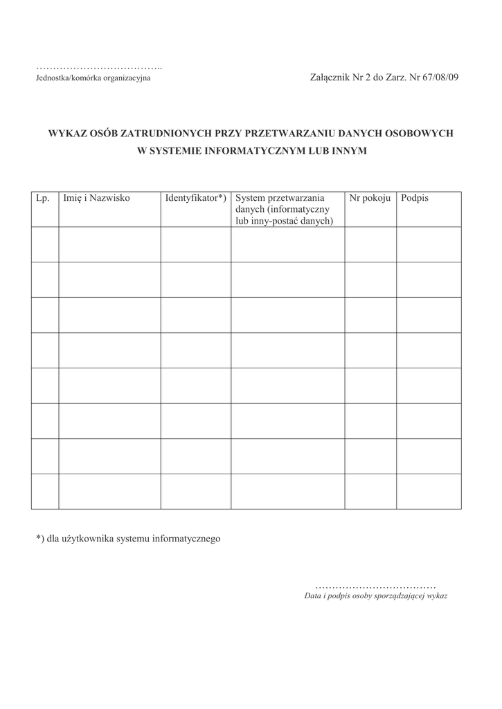……………………………….. Załącznik Nr 2 do Zarz. Nr 67/08/09 Jednostka/komórka organizacyjna WYKAZ OSÓB ZATRUDNIONYCH PRZY PRZETWARZANIU DANYCH OSOBOWYCH W SYSTEMIE INFORMATYCZNYM LUB INNYM Lp. Imię i Nazwisko Identyfikator*) System przetwarzania danych (informatyczny lub inny-postać danych) Nr pokoju Podpis *) dla użytkownika systemu informatycznego ……………………………… Data i podpis osoby sporządzającej wykaz