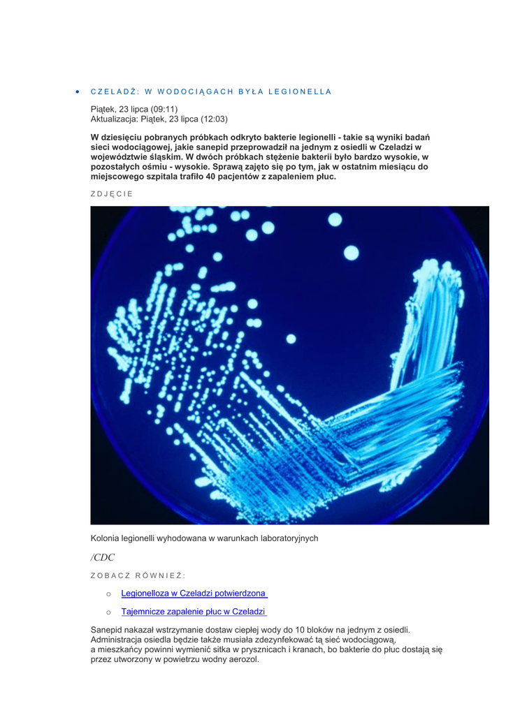 • CZELADŹ: W WODOCIĄGACH BYŁA LEGIONELLA Piątek, 23 lipca (09:11) Aktualizacja: Piątek, 23 lipca (12:03) W dziesięciu pobranych próbkach odkryto bakterie legionelli - takie są wyniki badań sieci wodociągowej, jakie sanepid przeprowadził na jednym z osiedli w Czeladzi w województwie śląskim. W dwóch próbkach stężenie bakterii było bardzo wysokie, w pozostałych ośmiu - wysokie. Sprawą zajęto się po tym, jak w ostatnim miesiącu do miejscowego szpitala trafiło 40 pacjentów z zapaleniem płuc. ZDJĘCIE Kolonia legionelli wyhodowana w warunkach laboratoryjnych /CDC ZOBACZ RÓWNIEŻ: o Legionelloza w Czeladzi potwierdzona o Tajemnicze zapalenie płuc w Czeladzi Sanepid nakazał wstrzymanie dostaw ciepłej wody do 10 bloków na jednym z osiedli. Administracja osiedla będzie także musiała zdezynfekować tą sieć wodociągową, a mieszkańcy powinni wymienić sitka w prysznicach i kranach, bo bakterie do płuc dostają się przez utworzony w powietrzu wodny aerozol. Po serii zachorowań na zapalenie płuc od kilku pacjentów pobrano próbki krwi. Badania potwierdziły teraz obecność bakterii u kolejnej, trzeciej już osoby. W tej chwili z zapaleniem płuc w szpitalu w Czeladzi leży 8 osób. Ale na szczęście u nikogo z przyjętych w ciągu ostatniego miesiąca nie było żadnych poważniejszych powikłań. Artykuł pochodzi z kategorii: Polska Przejdź na początek artykułu