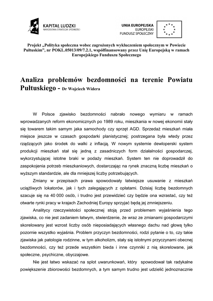 Analiza problemów bezdomności na terenie Powiatu Pułtuskiego