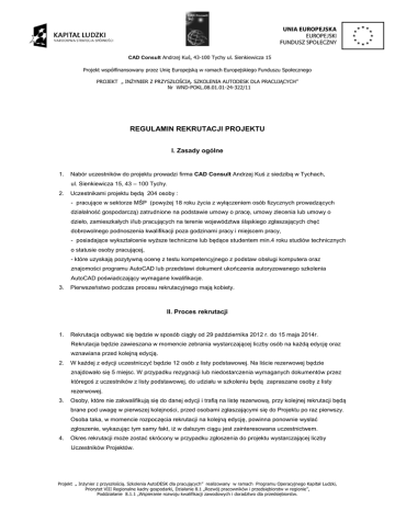 CAD Consult Andrzej Kuś, 43-100 Tychy ul. Sienkiewicza 15 Projekt współfinansowany przez Unię Europejską w ramach Europejskiego Funduszu Społecznego PROJEKT „ INŻYNIER Z PRZYSZŁOŚCIĄ. SZKOLENIA AUTODESK DLA PRACUJĄCYCH” Nr WND-POKL.08.01.01-24-322/11 REGULAMIN REKRUTACJI PROJEKTU I. Zasady ogólne 1. Nabór uczestników do projektu prowadzi firma CAD Consult Andrzej Kuś z siedzibą w Tychach, ul. Sienkiewicza 15, 43 – 100 Tychy. 2. Uczestnikami projektu będą 204 osoby : - pracujące w sektorze MŚP (powyżej 18 roku życia z wyłączeniem osób fizycznych prowadzących działalność gospodarczą) zatrudnione na podstawie umowy o pracę, umowy zlecenia lub umowy o dzieło, zamieszkałych i/lub pracujących na terenie województwa śląskiego zgłaszających chęć dobrowolnego podnoszenia kwalifikacji poza godzinami pracy i miejscem pracy, - posiadające wykształcenie wyższe techniczne lub będące studentem min.4 roku studiów technicznych o statusie osoby pracującej, - które uzyskają pozytywną ocenę z testu kompetencyjnego z podstaw obsługi komputera oraz znajomości programu AutoCAD lub przedstawi dokument ukończenia autoryzowanego szkolenia AutoCAD poświadczający wymagane kwalifikacje. 3. Pierwszeństwo podczas procesu rekrutacyjnego mają kobiety. II. Proces rekrutacji 1. Rekrutacja odbywać się będzie w sposób ciągły od 29 października 2012 r. do 15 maja 2014r. Rekrutacja będzie zawieszana w momencie zebrania wystarczającej liczby osób na każdą edycję oraz wznawiana przed kolejną edycją. 2. W każdej z edycji uczestniczyć będzie 12 osób z listy podstawowej. Na liście rezerwowej będzie znajdowało się 5 miejsc. W przypadku rezygnacji lub niedostarczenia wymaganych dokumentów przez któregoś z uczestników z listy podstawowej, do udziału w szkoleniu będą zapraszane osoby z listy rezerwowej. 3. Osoby, które nie zakwalifikują się do danej edycji i trafią na listę rezerwową, przy kolejnej rekrutacji będą brane pod uwagę w pierwszej kolejności, przed osobami zgłaszającymi się do Projektu po raz pierwszy. Osoba taka, w momencie rozpoczęcia rekrutacji na kolejną edycję, powinna ponownie wysłać zgłoszenie, wykazując tym samy fakt, iż w dalszym ciągu jest zainteresowana uczestnictwem. 4. Okres rekrutacji może zostać skrócony w przypadku zgłoszenia do projektu wystarczającej liczby Uczestników Projektów. Projekt „ Inżynier z przyszłością. Szkolenia AutoDESK dla pracujących” realizowany w ramach Programu Operacyjnego Kapitał Ludzki, Priorytet VIII Regionalne kadry gospodarki, Działanie 8.1 „Rozwój pracowników i przedsiębiorstw w regionie”, Poddziałanie 8.1.1 „Wspieranie rozwoju kwalifikacji zawodowych i doradztwo dla przedsiębiorstw. CAD Consult Andrzej Kuś, 43-100 Tychy ul. Sienkiewicza 15 Projekt współfinansowany przez Unię Europejską w ramach Europejskiego Funduszu Społecznego PROJEKT „ INŻYNIER Z PRZYSZŁOŚCIĄ. SZKOLENIA AUTODESK DLA PRACUJĄCYCH” Nr WND-POKL.08.01.01-24-322/11 5. Okres rekrutacji może zostać wydłużony na wniosek koordynatora projektu do czasu zebrania pełnej listy Uczestników Projektów. 6. Warunkiem udziału w projekcie jest złożenie w Biurze Projektu podpisanych przez Uczestnika Projektu i poprawnie wypełnionych i czytelnie podpisanych dokumentów: formularza zgłoszeniowego zaświadczenia o zatrudnieniu w sektorze MŚP w woj. Śląskim lub zaświadczenie lub Uczelni oświadczenie o wyrażeniu zgody na przetwarzanie danych osobowych deklaracji uczestnictwa w projekcie regulaminu rekrutacji projektu, regulaminu uczestnictwa w projekcie, wypełnienie testu z podstaw obsługi komputera lub złożenie dokumentu ukończenia autoryzowanego szkolenia AutoCAD poświadczającego wymagane kwalifikacje. 7. Dokumenty złożone przez kandydatów do projektu podlegają weryfikacji przez członków zespołu projektowego. 8. W przypadku stwierdzenia braków kandydat do projektu informowany jest drogą telefoniczną lub mailową o konieczności wniesienia poprawek w terminie 3 dni od daty powiadomienia. 9. O przyjęciu do projektu decyduje spełnienie kryterium kwalifikowalności, o którym mowa w pkt. I.2–3, oraz kolejność zgłoszeń. 10. Rezygnację z udziału w projekcie zakwalifikowany Uczestnik Projektu zobowiązany jest złożyć pisemnie. III. Postanowienia końcowe 1. Projektodawca zastrzega sobie prawo do zmian w niniejszym Regulaminie lub wprowadzenia dodatkowych postanowień. 2. W kwestiach nieuregulowanych Regulaminem prawo do podjęcia ostatecznej decyzji posiada koordynator projektu. 3. Regulamin wchodzi w życie z dniem 15 października 2012 roku i obowiązuje przez cały czas trwania Projektu. Dnia ................................................... Miejscowość, data ................................................... Czytelny podpis uczestnika Projekt „ Inżynier z przyszłością. Szkolenia AutoDESK dla pracujących” realizowany w ramach Programu Operacyjnego Kapitał Ludzki, Priorytet VIII Regionalne kadry gospodarki, Działanie 8.1 „Rozwój pracowników i przedsiębiorstw w regionie”, Poddziałanie 8.1.1 „Wspieranie rozwoju kwalifikacji zawodowych i doradztwo dla przedsiębiorstw.