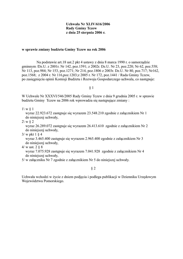 Uchwała Nr XLIV/616/2006 Rady Gminy Tczew z dnia 25 sierpnia 2006 r. w sprawie zmiany budżetu Gminy Tczew na rok 2006 Na podstawie art.18 ust.2 pkt 4 ustawy z dnia 8 marca 1990 r. o samorządzie gminnym /Dz.U. z 2001r. Nr 142, poz.1591; z 2002r. Dz.U. Nr 23, poz.220; Nr 62, poz.558; Nr 113, poz.984; Nr 153, poz.1271; Nr 214, poz.1806 z 2003r. Dz.U. Nr 80, poz.717; Nr162, poz.1568; z 2004 r. Nr 116,poz.1203;z 2005 r. Nr 172, poz.1441 / Rada Gminy Tczew, po zasięgnięciu opinii Komisji Budżetu i Rozwoju Gospodarczego uchwala, co następuje: §1 W Uchwale Nr XXXVI/546/2005 Rady Gminy Tczew z dnia 9 grudnia 2005 r. w sprawie budżetu Gminy Tczew na 2006 rok wprowadza się następujące zmiany : 1\ w § 1 wyraz 22.923.672 zastępuje się wyrazem 23.548.210 zgodnie z załącznikiem Nr 1 do niniejszej uchwały, 2\ w § 2 wyraz 26.289.072 zastępuje się wyrazem 26.413.610 zgodnie z załącznikiem Nr 2 do niniejszej uchwały, 3/ w pkt 1 § 4 wyraz 3.465.400 zastępuje się wyrazem 2.965.400 zgodnie z załącznikiem Nr 3 do niniejszej uchwały, 4/ w ust. 2 § 8 wyraz 7.075.928 zastępuje się wyrazem 7.041.928 zgodnie z załącznikiem Nr 4 do niniejszej uchwały, 5/ w załączniku Nr 7 zgodnie z załącznikiem Nr 5 do niniejszej uchwały. §2 Uchwała wchodzi w życie z dniem podjęcia i podlega publikacji w Dzienniku Urzędowym Województwa Pomorskiego. U ZASADN IE N IE Zmiany w budżecie dokonuje się w związku z : 1.sprzedażą sieci gazowej PSG gazociągu średniego ciśnienia wraz z przyłączami położonego w miejscowości Turze-Damaszka za cenę netto 618.538,72 zł oraz podatek VAT w kwocie 136.078,52 zł zgodnie z umową Nr 500/EP/RU/2006 z dnia 25.07.2006r. i fakturą VAT Nr 2/P/2006 z dnia 25.07.2006r., 2.otrzymaniem darowizny z Banku Spółdzielczego w Tczewie w kwocie 6.000,- zł z przeznaczeniem na: * wyposażenie świetlic w Maleninie i Szczerbięcinie po 800,- zł oraz w Lubiszewie w kwocie 1.000,- zł *wyposażenie remiz /świetlic/ w Małżewie, Miłobądzu i Swarożynie po 800,- zł *Dożynki Gminne w kwocie 1.000,- zł, 3.zwiększeniem planu na dofinansowanie zadań w zakresie: a)wydatków bieżących i tak na: -zakup materiałów, usług na utrzymanie i remont dróg gminnych oraz na wynagrodzenia z tytułu umów o dzieło o kwotę 41.088,- zł -remont pieca w budynku komunalnym w miejscowości Miłobądz w kwocie 6.500,- zł -zakup wyposażenia, materiałów do remiz oraz na wynagrodzenia bezosobowe o kwotę 4.900,- zł -remont budynku Szkoły Podstawowej w Lubiszewie o kwotę 22.450,- zł -wyposażenie świetlic o kwotę 2.600,- zł -organizację Dożynek Gminnych o kwotę 7.000,- zł -szkolenia dla społeczności wiejskiej w kwocie 2.000,- zł -remont świetlicy w Maleninie w kwocie 26.000,- zł i remont świetlicy w Bałdowie o kwotę 115.000,- zł -zakup energii do świetlic o kwotę 3.000,- zł b)wydatków majątkowych na: -wykonanie odpływu wód popłucznych z hydrofornii w Szczerbięcinie w kwocie 22.000,- zł -rozbudowę stacji uzdatniania wody w Swarożynie o kwotę 85.000,- zł -budowę sieci kanalizacyjnej w Wędkowach o kwotę 6.000,- zł -zakup dmuchawy do oczyszczalni ścieków w Turzu oraz pompy do ścieków o kwotę 17.000,- zł -wykonanie bramy wjazdowej przy ogrodzeniu remizy OSP w Turzu w kwocie 5.000,- zł -projekt budowy świetlicy w Tczewskich Łąkach o kwotę 13.000,- zł -wykonanie ogrodzenia wokół budynku socjalnego w Boroszewie w kwocie 34.000,- zł -zakupy inwestycyjne dla urzędu o kwotę 10.000,- zł, 4.zmniejszeniem planowanych wydatków na rozbudowę systemu wodociągowego Lubiszewo-Dąbrówka o kwotę 220.000,- zł, 5.Uchwałą Nr 767/313/06 Zarządu Województwa Pomorskiego z dnia 8 sierpnia 2006r. w sprawie przyjęcia wzoru wniosku o wypłatę pomocy finansowej na realizację projektu w ramach Pomorskiego Programu Odnowy Wsi na rok 2006 oraz Uchwałą Nr 919/XLVIII/06 Sejmiku Województwa Pomorskiego należy udzieloną pomoc finansową przyjąć w dziale 010, rozdziale 01036 zarówno po stronie dochodów jak i wydatków wobec powyższego należało zaplanowane środki na zadanie pn."Budowa boiska do koszykówki i siatkówki w Turzu" przenieść z rozdziału 92605 na rozdział 01036, 6.dokonano przeniesień planowanych wydatków .