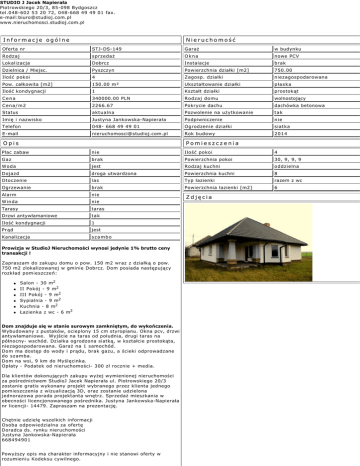 STUDIO J Jacek Napierała Piotrowskiego 20/3, 85-098 Bydgoszcz tel.048-602 53 20 72, 048-668 49 49 01 fax. e-mail:[email protected] www.nieruchomosci.studioj.com.pl Informacje ogólne Nieruchomość Oferta nr STJ-DS-149 Garaż w budynku Rodzaj sprzedaż Okna nowe PCV Lokalizacja Dobrcz Instalacje brak Dzielnica / Miejsc. Pyszczyn Powierzchnia działki [m2] 750.00 Ilość pokoi 4 Zagosp. działki niezagospodarowana Pow. całkowita [m2] 150.00 m² Ukształtowanie działki płaska Ilość kondygnacji 1 Kształt działki prostokąt Cena 340000.00 PLN Rodzaj domu wolnostojący Cena/m2 2266.67 Pokrycie dachu dachówka betonowa Status aktualna Pozwolenie na użytkowanie tak Imię i nazwisko Justyna Jankowska-Napierała Podpiwniczenie nie Telefon 048- 668 49 49 01 Ogrodzenie działki siatka E-mail [email protected] Rok budowy 2014 Opis Pomieszczenia Plac zabaw nie Ilość pokoi 4 Gaz brak Powierzchnia pokoi 30, 9, 9, 9 Woda jest Rodzaj kuchni oddzielna Dojazd droga utwardzona Powierzchnia kuchni 8 Otoczenie las Typ łazienki razem z wc Ogrzewanie brak Powierzchnia łazienki [m2] 6 Alarm nie Winda nie Tarasy taras Drzwi antywłamaniowe tak Ilość kondygnacji 1 Prąd jest Kanalizacja szambo Prowizja w StudioJ Nieruchomości wynosi jedynie 1% brutto ceny transakcji ! Zapraszam do zakupu domu o pow. 150 m2 wraz z działką o pow. 750 m2 zlokalizowanej w gminie Dobrcz. Dom posiada następujący rozkład pomieszczeń: Salon - 30 m2 II Pokój - 9 m2 III Pokój - 9 m2 Sypialnia - 9 m2 Kuchnia - 8 m2 Łazienka z wc - 6 m2 Dom znajduje się w stanie surowym zamkniętym, do wykończenia. Wybudowany z pustaków, ocieplony 15 cm styropianu. Okna pcv, drzwi antywłamaniowe. Wyjście na taras od południa, drugi taras na północny- wschód. Działka ogrodzona siatką, w kształcie prostokąta, niezagospodarowana. Garaż na 1 samochód. Dom ma dostęp do wody i prądu, brak gazu, a ścieki odprowadzane do szamba. Dom na wsi, 9 km do Myślęcinka. Opłaty - Podatek od nieruchomości- 300 zł rocznie + media. Dla klientów dokonujących zakupu wyżej wymienionej nieruchomości za pośrednictwem StudioJ Jacek Napierała ul. Piotrowskiego 20/3 zostanie gratis wykonany projekt wybranego przez klienta jednego pomieszczenia z wizualizacją 3D, oraz zostanie udzielona jednorazowa porada projektanta wnętrz. Sprzedaż mieszkania w obecności licencjonowanego pośrednika. Justyna Jankowska-Napierała nr licencji- 14479. Zapraszam na prezentację. Chętnie udzielę wszelkich informacji Osoba odpowiedzialna za ofertę Doradca ds. rynku nieruchomości Justyna Jankowska-Napierała 668494901 Powyższy opis ma charakter informacyjny i nie stanowi oferty w rozumieniu Kodeksu cywilnego. Zdjęcia © Wszelkie prawa zastrzeżone - STUDIO J Jacek Napierała