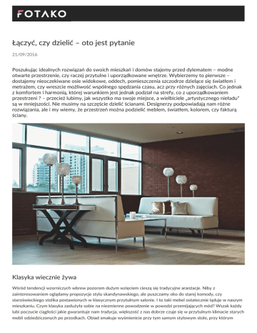 Łączyć, czy dzielić – oto jest pytanie 21/09/2016 Poszukując idealnych rozwiązań do swoich mieszkań i domów stajemy przed dylematem – modne otwarte przestrzenie, czy raczej przytulne i uporządkowane wnętrze. Wybierzemy to pierwsze – dostajemy nieoczekiwane osie widokowe, oddech, pomieszczenia szczodrze dzielące się światłem i metrażem, czy wreszcie możliwość wspólnego spędzania czasu, acz przy różnych zajęciach. Co jednak z komfortem i harmonią, której warunkiem jest jednak podział na strefy, co z uporządkowaniem przestrzeni ? – przecież lubimy, jak wszystko ma swoje miejsce, a wielbiciele „artystycznego nieładu” są w mniejszości. Nie musimy na szczęście dzielić ścianami. Designerzy podpowiadają nam różne rozwiązania, ale i my wiemy, że przestrzeń można podzielić meblem, światłem, kolorem, czy fakturą ściany. Klasyka wiecznie żywa Wśród tendencji wzorniczych wbrew pozorom dużym wzięciem cieszą się tradycyjne aranżacje. Niby z zainteresowaniem oglądamy propozycje stylu skandynawskiego, ale puszczamy oko do starej komody, czy staroświeckiego stolika postawionych w klasycznym przytulnym salonie. I to taki mebel ostatecznie ląduje w naszym mieszkaniu. Czym klasyka zasłużyła sobie na niezmienne powodzenie w powodzi przemijających mód? Wszak każdy lubi poczucie ciągłości jakie gwarantuje nam tradycja, większość z nas dobrze czuje się w przytulnym klimacie starych mebli odziedziczonych po przodkach. Obiad smakuje wyśmienicie przy tym samym stylowym stole, przy którym siadaliśmy jako dzieci z rodzicami do wigilijnej kolacji. To poszanowanie i hołubienie tradycyjnych wnętrz nie skazuje nas na szczęście na monotonię. Historyczny salon nie musi być przyciężki i nudny. Przebogaty wybór tkanin tapicerskich, wykwintnych żyrandoli i mebli z epoki (to prawda trochę kosztują i są rzadkie, ale dzięki Bogu po świecie chodzą mistrzowie znakomitych replik) pomoże nam stworzyć wnętrze tak samo przytulne, co funkcjonalne. Doskonałe? Dla każdego będzie to oznaczało coś innego. Czasem wystarczy drobny ukłon w stronę klasyki, jak pojedynczy fotel, czy stylowa lampa. Przykuwający uwagę tradycyjny mebel będzie jak kontrapunkt w minimalistycznym salonie. Dwie złote zasady Klasyczny wystrój wnętrz cechuje prostota idąca w parze z elegancją i wygodą. Dwa przykazania które nas prowadzą przy urządzaniu salonu klasycznego to symetria i równowaga. Mebel postawiony pod jedną ze ścian musiał być zrównoważony przez inny pod ścianą przeciwległą. Klasyka oznacza również odpowiednią paletę kolorów – kremy, beże, brązy, szarości a nawet biel mebli i ścian ożywiały tkaniny zielone i niebieskie. Plus naturalnie naturalne, solidne materiały. Jeśli drewno to orzech, mahoń, dąb. Jeśli kamień to marmur na blaty i kominki. Klasyczne, czy raczej klasycyzujące meble ( choć oczywiście można zamówić replikę Ludwika XIV) to wzory eleganckie i proste zarazem. Powrót do źródeł najczęściej wychodzi na zdrowie. Staroświecki wystrój połączony z nowoczesnym otwartym układem, czyli kuchnia otwarta na salon i niezobowiązujący rozdział funkcji to może być strzał w dziesiątkę. Foto: Pexels / Scott Webb Źródło: Serwis fotako.pl zajmujący się od 2012 roku produkcją spersonalizowanych foto dekoracji ze zdjęć, obrazów, plakatów, boardów, naklejek, tapet.