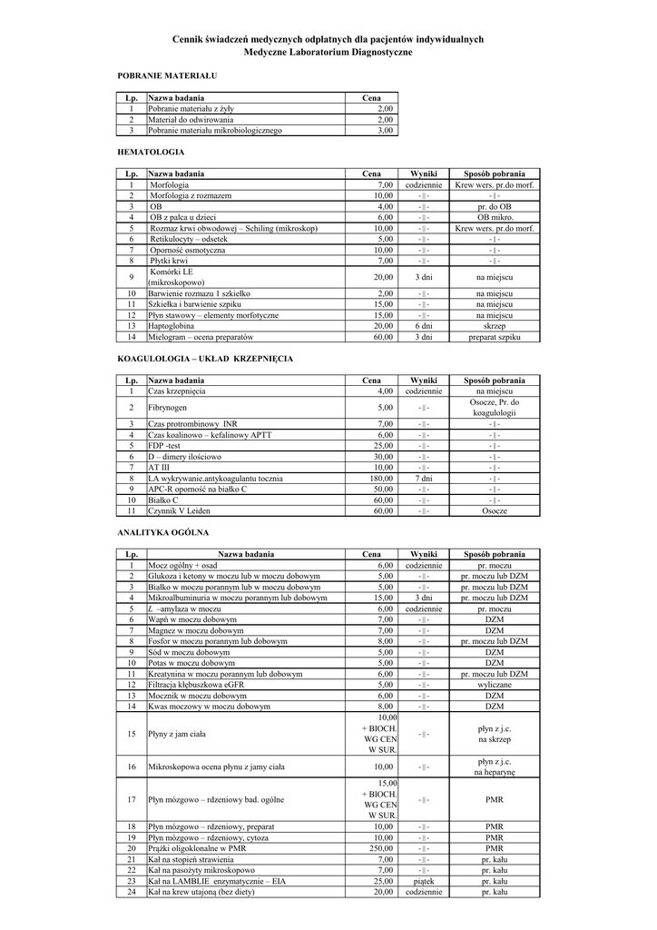 Cennik świadczeń medycznych odpłatnych dla pacjentów indywidualnych Medyczne Laboratorium Diagnostyczne POBRANIE MATERIAŁU Lp. 1 2 3 Nazwa badania Pobranie materiału z żyły Materiał do odwirowania Pobranie materiału mikrobiologicznego Cena 2,00 2,00 3,00 HEMATOLOGIA Lp. 1 2 3 4 5 6 7 8 9 10 11 12 13 14 Nazwa badania Morfologia Morfologia z rozmazem OB OB z palca u dzieci Rozmaz krwi obwodowej – Schiling (mikroskop) Retikulocyty – odsetek Oporność osmotyczna Płytki krwi Komórki LE (mikroskopowo) Barwienie rozmazu 1 szkiełko Szkiełka i barwienie szpiku Płyn stawowy – elementy morfotyczne Haptoglobina Mielogram – ocena preparatów Cena 7,00 10,00 4,00 6,00 10,00 5,00 10,00 7,00 Wyniki codziennie Sposób pobrania Krew wers. pr.do morf. - || - - || - - || - || - pr. do OB OB mikro. Krew wers. pr.do morf. - || - - || - - || - - || - - || - - || - 20,00 3 dni na miejscu 2,00 15,00 15,00 20,00 60,00 - || - na miejscu na miejscu na miejscu skrzep preparat szpiku - || - - || - || - 6 dni 3 dni KOAGULOLOGIA – UKŁAD KRZEPNIĘCIA Lp. 1 Nazwa badania Czas krzepnięcia 2 Fibrynogen 3 4 5 6 7 8 9 10 11 Czas protrombinowy INR Czas koalinowo – kefalinowy APTT FDP -test D – dimery ilościowo AT III LA wykrywanie.antykoagulantu tocznia APC-R oporność na białko C Białko C Czynnik V Leiden Cena 4,00 Wyniki codziennie Sposób pobrania na miejscu Osocze, Pr. do koagulologii 5,00 - || - 7,00 6,00 25,00 30,00 10,00 180,00 50,00 60,00 60,00 - || - - || - - || - - || - - || - - || - - || - - || - - || - - || - 7 dni - || - - || - - || - - || - - || - - || - Osocze ANALITYKA OGÓLNA Lp. 1 2 3 4 5 6 7 8 9 10 11 12 13 14 Nazwa badania Mocz ogólny + osad Glukoza i ketony w moczu lub w moczu dobowym Białko w moczu porannym lub w moczu dobowym Mikroalbuminuria w moczu porannym lub dobowym L –amylaza w moczu Wapń w moczu dobowym Magnez w moczu dobowym Fosfor w moczu porannym lub dobowym Sód w moczu dobowym Potas w moczu dobowym Kreatynina w moczu porannym lub dobowym Filtracja kłębuszkowa eGFR Mocznik w moczu dobowym Kwas moczowy w moczu dobowym 15 Płyny z jam ciała 16 Mikroskopowa ocena płynu z jamy ciała 17 Płyn mózgowo – rdzeniowy bad. ogólne 18 19 20 21 22 23 24 Płyn mózgowo – rdzeniowy, preparat Płyn mózgowo – rdzeniowy, cytoza Prążki oligoklonalne w PMR Kał na stopień strawienia Kał na pasożyty mikroskopowo Kał na LAMBLIE enzymatycznie – EIA Kał na krew utajoną (bez diety) Cena Wyniki 6,00 codziennie - || 5,00 - || 5,00 15,00 3 dni 6,00 codziennie - || 7,00 - || 7,00 - || 8,00 - || 5,00 - || 5,00 - || 6,00 - || 5,00 - || 6,00 - || 8,00 10,00 + BIOCH. - || WG CEN W SUR. 10,00 - || - 15,00 + BIOCH. - || WG CEN W SUR. - || 10,00 - || 10,00 - || 250,00 - || 7,00 - || 7,00 25,00 piątek 20,00 codziennie Sposób pobrania pr. moczu pr. moczu lub DZM pr. moczu lub DZM pr. moczu lub DZM pr. moczu DZM DZM pr. moczu lub DZM DZM DZM pr. moczu lub DZM wyliczane DZM DZM płyn z j.c. na skrzep płyn z j.c. na heparynę PMR PMR PMR PMR pr. kału pr. kału pr. kału pr. kału 25 26 27 28 29 30 31 32 33 Kał na Rota i Adeno wirusy Narkotyki w moczu (10 parametrów) Białko Bence-Jonesa w moczu (łańcuchy lekkie) Beta 2 mikroglobulina Liczba Addisa Antygen Helicobacter pylori w kale Helicobacter pylori przeciwciała w surowicy jakościowo Helicobacter pylori p/c IgG ilościowo Wymaz z pochwy na obecność plemników 20,00 50,00 20,00 30,00 5,00 32,00 20,00 30,00 10,00 - || - pr. kału pr.moczu DZM surowica DZM pr. kału skrzep 4 dni codziennie szkiełko z wydzieliną - || - || - || - 4 dni codziennie - || - - || - BADANIA BIOCHEMICZNE Lp. 1 2 3 4 5 6 7 8 9 10 11 12 13 14 15 16 17 18 19 20 21 22 23 24 25 26 27 28 29 30 31 32 33 34 35 36 37 38 39 40 41 42 43 44 45 46 47 48 49 50 51 52 53 54 Nazwa badania Białko całkowite Proteinogram (elektroforeza) Albumina w surowicy Glukoza w surowicy Bilirubina całkowita Bilirubina pośrednia i bezpośrednia Cholesterol całkowity Cholesterol HDL Cholesterol LDL wyliczany Triglicerydy Profil CHOL - TG – HDL – LDL Kwas moczowy w surowicy Mocznik Kreatynina Clearance kreatyniny w DZM Fosfataza alkaliczna Fosfataza alkaliczna frakcja kostna Fosfataza kwaśna całkowita Fosfataza kwaśna + sterczowa ASPAT – aminotransferaza asparaginanowa ALAT – aminotransferaza alaminowa GGTP – gamma-glutamylotransferaza CPK (CK – NAC) – kinaza kreatynowa CPK – MB MASS (izoenzym sercowy) CPK – MB (izoenzym sercowy) Troponina BNP- peptyd natiuretyczny Jonogram (Na,K) Jonogram (Na,K,Cl) Fosfor w surowicy Żelazo w surowicy UIBC w surowicy Wapń całkowity w surowicy Wapń zjonizowany Magnez w surowicy Amylaza (diastaza w surowicy) LDH – dehydrogenazy mleczanowa Lipaza Krzywa cukrowa 2-punktowa Krzywa cukrowa 3-punktowa HBA 1 C Hemoglobina glikowana Ołów we krwi Miedź w surowicy Miedź w moczu DZM Cynk we krwi Lit w surowicy TBG białko wiążące tyroksynę Gazometria Hemoglobina tlenkowęglowa HbCO Cholinesteraza Homocysteina Etanol Ferrytyna Kwasy żółciowe Cena 5,00 15,00 4,00 5,00 5,00 10,00 5,00 6,00 4,00 5,00 15,00 6,00 5,00 5,00 10,00 5,00 10,00 6,00 12,00 5,00 5,00 6,00 10,00 Wyniki codziennie 1 x w tyg. codziennie - || - || - || - || - || - || - || - || - || - || - || - || - || - 3 dni piątek Sposób pobrania skrzep skrzep skrzep skrzep skrzep skrzep skrzep skrzep skrzep skrzep skrzep skrzep skrzep skrzep DZM + krew na skrzep skrzep - || - || - - || - - || - codziennie - || - - || - - || - - || - - || - - || - - || - 25,00 - || - - || - 10,00 - || - - || - 25,00 40,00 15,00 15,00 5,00 5,00 10,00 5,00 10,00 5,00 6,00 5,00 15,00 10,00 15,00 20,00 60,00 20,00 50,00 40,00 10,00 32,00 15,00 15,00 30,00 45,00 50,00 20,00 60,00 - || - - || - - || - || - Krew wers. pr.do morf. skrzep - || - - || - - || - - || - - || - - || - piątek codziennie - || - - || - || - na czczo skrzep skrzep - || - - || - - || - - || - - || - 2 dni codziennie - || - || - - || - - || - piątek 10 dni 7 dni codziennie 2 dni 4 dni Krew wers. pr.d