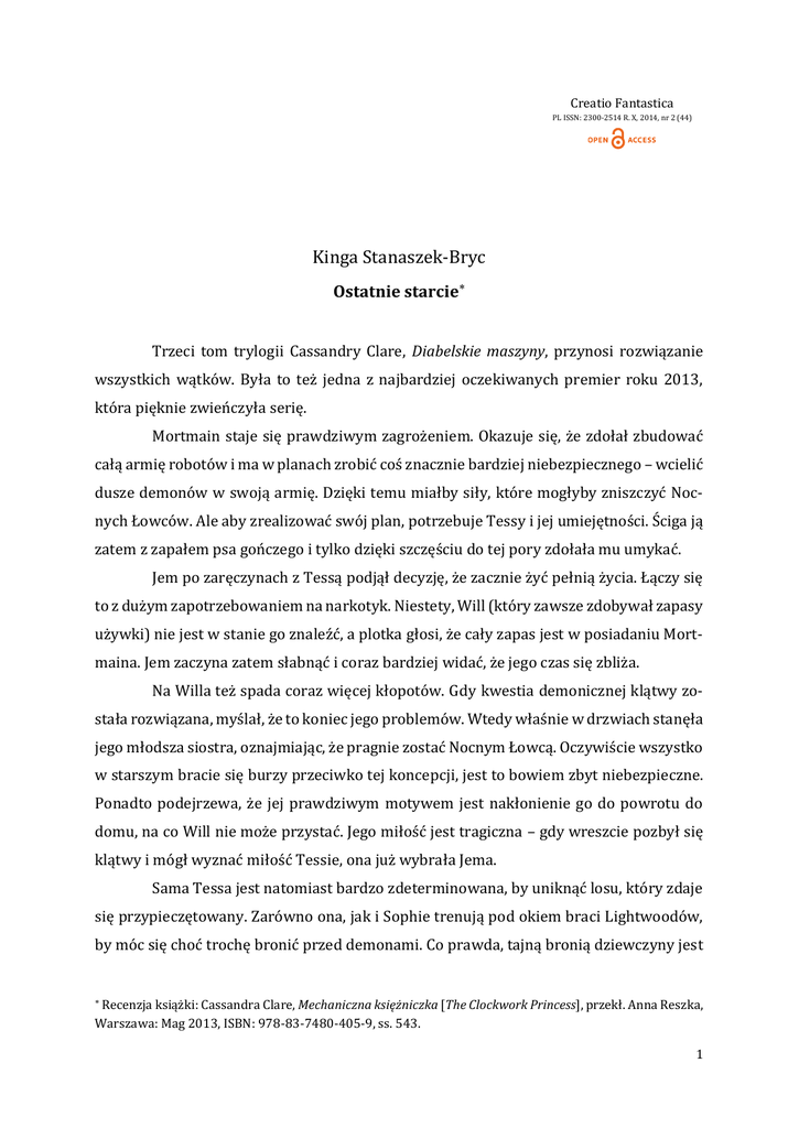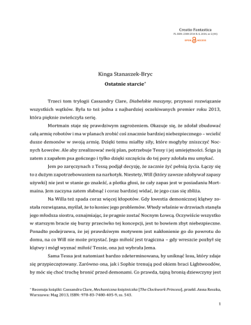 Creatio Fantastica PL ISSN: 2300-2514 R. X, 2014, nr 2 (44) Kinga Stanaszek-Bryc Ostatnie starcie Trzeci tom trylogii Cassandry Clare, Diabelskie maszyny, przynosi rozwiązanie wszystkich wątków. Była to też jedna z najbardziej oczekiwanych premier roku 2013, która pięknie zwieńczyła serię. Mortmain staje się prawdziwym zagrożeniem. Okazuje się, że zdołał zbudować całą armię robotów i ma w planach zrobić coś znacznie bardziej niebezpiecznego – wcielić dusze demonów w swoją armię. Dzięki temu miałby siły, które mogłyby zniszczyć Nocnych Łowców. Ale aby zrealizować swój plan, potrzebuje Tessy i jej umiejętności. Ściga ją zatem z zapałem psa gończego i tylko dzięki szczęściu do tej pory zdołała mu umykać. Jem po zaręczynach z Tessą podjął decyzję, że zacznie żyć pełnią życia. Łączy się to z dużym zapotrzebowaniem na narkotyk. Niestety, Will (który zawsze zdobywał zapasy używki) nie jest w stanie go znaleźć, a plotka głosi, że cały zapas jest w posiadaniu Mortmaina. Jem zaczyna zatem słabnąć i coraz bardziej widać, że jego czas się zbliża. Na Willa też spada coraz więcej kłopotów. Gdy kwestia demonicznej klątwy została rozwiązana, myślał, że to koniec jego problemów. Wtedy właśnie w drzwiach stanęła jego młodsza siostra, oznajmiając, że pragnie zostać Nocnym Łowcą. Oczywiście wszystko w starszym bracie się burzy przeciwko tej koncepcji, jest to bowiem zbyt niebezpieczne. Ponadto podejrzewa, że jej prawdziwym motywem jest nakłonienie go do powrotu do domu, na co Will nie może przystać. Jego miłość jest tragiczna – gdy wreszcie pozbył się klątwy i mógł wyznać miłość Tessie, ona już wybrała Jema. Sama Tessa jest natomiast bardzo zdeterminowana, by uniknąć losu, który zdaje się przypieczętowany. Zarówno ona, jak i Sophie trenują pod okiem braci Lightwoodów, by móc się choć trochę bronić przed demonami. Co prawda, tajną bronią dziewczyny jest Recenzja książki: Cassandra Clare, Mechaniczna księżniczka [The Clockwork Princess], przekł. Anna Reszka, Warszawa: Mag 2013, ISBN: 978-83-7480-405-9, ss. 543. 1 mechaniczny aniołek, który skrywa pewną tajemnicę. Poza tym Sophie staje się obiektem zainteresowania Gideona, ale jako służąca wstydzi się, że byłby to mezalians. Jednak znajdują i na to radę. Wydaje mi się, że jest ona sprzeczna z teorią nt. Nocnych Łowców podaną w innych powieściach tej autorki, niemniej – to rozwiązanie podoba mi się bardziej. Jest jeszcze Charlotte, która jest rozerwana między obowiązkami wobec Rady i Instytutu (szczególnie że może stracić stanowisko) a ratowaniem pozostałych Nocnych Łowców oraz Tessy przed robotami Mortmaina. Niestety, nie może liczyć na swojego męża, którego dziś nazwalibyśmy nerdem – naonczas był po prostu wynalazcą. Gabinet w piwnicy zaspokajał jego wszelkie potrzeby, choć wynalazki nie zawsze są skuteczne w walce z wrogiem. Powieść zachowuje tempo znane z poprzednich tomów. Ciężko się oderwać od przygód przodków Jace’a i ekipy. Zaskakujący jest finał, który zapewne spowoduje, że wszyscy będą usatysfakcjonowani, choć mnie się akurat nie podobał. Uważam, że jest sztucznie przeciągnięty, właśnie po to, by zaspokoić wszystkich fanów. 2