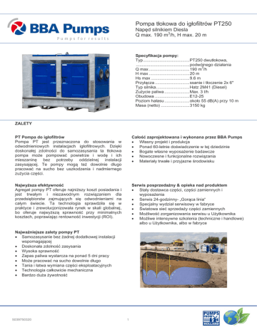 Pompa tłokowa do igłofiltrów PT250 Napęd silnikiem Diesla Q max. 190 m3/h, H max. 20 m Pumps for results Specyfikacja pompy: Typ ....................................... PT250 dwutłokowa, ............................................. podwójnego działania Q max .................................. 190 m3/h H max .................................. 20 m Hs max ................................ 9.6 m Przyłącza ............................. ssanie i tłoczenie 2x 6ʺ Typ silnika ............................ Hatz 2M41 (Diesel) Zużycie paliwa ..................... Max. 3 l/h Obudowa ............................. E12-25 Poziom hałasu ..................... około 55 dB(A) przy 10 m Masa (netto) ........................ 3150 kg ZALETY PT Pompa do igłofiltrów Pompa PT jest przeznaczona do stosowania w odwodnieniowych instalacjach igłofiltrowych. Dzięki doskonałej zdolności do samozasysania ta tłokowa pompa może pompować powietrze i wodę i ich mieszaninę bez potrzeby oddzielnej instalacji zasysającej. Te pompy mogą też dowolnie długo pracować na sucho bez uszkodzenia i nadmiernego zużycia części. Całość zaprojektowana i wykonana przez BBA Pumps • Własny projekt i produkcja • Ponad 60-letnie doświadczenie w tej dziedzinie • Bogate własne wyposażenie badawcze • Nowoczesne i funkcjonalne rozwiązania • Materiały trwałe i przyjazne środowisku Najwyższa efektywność Agregat pompy PT oferuje najniższy koszt posiadania i jest trwałym i niezawodnym rozwiązaniem dla przedsiębiorstw zajmujących się odwodnieniami na całym świecie. Ta technologia sprawdziła się w praktyce i zrewolucjonizowała rynek w skali globalnej, bo oferuje najwyższą sprawność przy minimalnych kosztach, poprawiając rentowność inwestycji (ROI). Serwis posprzedażny & opieka nad produktem • Stały dostawca części, części zamiennych i wyposażenia • Serwis 24-godzinny- „Gorąca linia“ • Specjalny wydział serwisowy w fabryce • Światowa sieć sprzedaży części zamiennych • Możliwość zorganizowania serwisu u Użytkownika • Możliwe intensywne szkolenia (techniczne i handlowe) albo u Użytkownika, albo w fabryce Najważniejsze zalety pompy PT • Samozasysanie bez żadnej dodatkowej instalacji wspomagającej • Doskonała zdolność zasysania • Wysoka sprawność • Zapas paliwa wystarcza na ponad 5 dni pracy • Może pracować na sucho dowolnie długo • Tania i łatwa wymiana części eksploatacyjnych • Technologia całkowicie mechaniczna • Bardzo duża żywotność 5039750320 1 Pompa tłokowa do igłofiltrów PT250 Napęd silnikiem Diesla Q max. 190 m3/h, H max. 20 m Pumps for results STANDARDOWA SPECYFIKACJA TECHNICZNA Pompa tłokowa podwójnego działania. Prod. BBA Typ pompy ........................................ PT250 Q max ............................................... 190 m3/h H max ............................................... 20 m Hs max.............................................. 9.6 m Ilość skoków ..................................... 62/min (standard fabr.) Max. ilość skoków ............................. 70/min Korpus pompy................................... St.37 Pokrywa pompy ................................ St.37 Tuleje cylindrowe .............................. Stal nierdzewna 1.4301 Uszczelki tłoków ............................... Skóra Drągi tłokowe .................................... Stal nierdzewna 304 Uszczelnienia wału ........................... Dławikowe Przylgi zaworów ................................ NBR Łapacz kamieni ................................. Stal ocynkowana ogniowo Wyposażenie pomiarowe ................. Wakuometr Przyłącza .......................................... Stal ocynkowana ogniowo Silnik Producent ......................................... Hatz Typ .................................................... 2M41 Moc ................................................... 15 kW (20 KM) Max. prędkość obrotowa .................. 1500/min Zużycie paliwa .................................. 223 g/kWh Pojemność tłokowa ........................... 1.716 l Liczba cylindrów ............................... 2 Chłodzenie ........................................ Powietrzem Rozruch ............................................ Elektryczny Emisja wydechu EU .......................... Stage IIIA Emisja wydechu US.......................... EPA Tier 4i Hatz M-series Panel sterujący Hatz - Pulpit z kompozytu - Licznik godzin pracy - Start kluczykiem - Lampka ostrzegawcza “ciśnienie oleju” - Lampka ostrzegawcza “alternator” System paliwowy - Zbiornik z kompozytu 300 l - Pokrywa zbiornika Ø 60 mm (2.5ʺ) - Wtrysk paliwa mechaniczny - Separator wody szeregowo z filtrem paliwa 5039750320 System elektryczny & zabezpieczenia - Napięcie nominalne 12 V - Wysokie jakości bateria 92Ah. - Wyłącznik przy spadku ciśnienia oleju 2 Pompa tłokowa do igłofiltrów PT250 Napęd silnikiem Diesla Q max. 190 m3/h, H max. 20 m Pumps for results OBUDOWA E12-25 Obudowa dźwiękochłonna BBA Typ obudowy .................................... E12-25 Wymiary L x W x H ........................... 2500 x 1250 x 1900 mm Wymiary L x W x H ........................... 98.5 x 49.2 x 75 cale Rama podstawowa ........................... Ocynkowana ogniowo Panele............................................... Malowane proszkowo Drzwi ................................................. 4 drzwi ułatwiających dostęp (zamykane) Zbiornik paliwa .................................. PE; pojemność 300 l Ilość godzin pracy ............................. 100 – 170 bez tankowania (zależnie od obciążenia) Pokrywa wlewu paliwa...................... 60 mm (2.5ʺ) Transport wózkiem widłowym........... 2 przyspawane kieszenie do wideł Zaczep do podnoszenia ................... Pojedynczy Pompa do usuwania oleju ................ Zainstalowana ręczna pompa do usuwania oleju z silnika Przyłącza ..................................