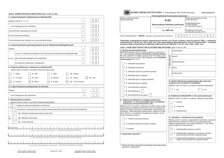 G£ÓWNY URZ¥D STATYSTYCZNY, al. Niepodleg³oœci 208, 00-925 Warszawa Dzia³ 9. KOMPUTERYZACJA BIBLIOTEKI (stan w dniu 31 XII) 1. Liczba komputerów u¿ytkowanych w bibliotece/filii Ogó³em (wiersz 3 + 4 + 5) Nazwa i adres jednostki sprawozdawczej 1 www.stat.gov.pl Przed wype³nieniem przeczytaæ objaœnienia Portal sprawozdawczy GUS www.stat.gov.pl K-03 Sprawozdanie biblioteki publicznej Urz¹d Statystyczny 31-223 Kraków ul. Kazimierza Wyki 3 w tym dostêpnych dla czytelników 2 Jako jednostki niepod³¹czone do sieci 3 za 2009 rok W sieci lokalnej tej biblioteki 4 Numer identyfikacyjny – REGON (wpisywaæ od pierwszej kratki z lewej strony) W sieci lokalnej innej instytucji (np. domu/oœrodka kultury) 5 Obowi¹zek przekazywania danych statystycznych wynika z art. 30 pkt 3 ustawy z dnia 29 czerwca 1995 r. o statystyce publicznej (Dz. U. Nr 88, poz. 439, z póŸn. zm.) oraz rozporz¹dzenia Rady Ministrów z dnia 27 listopada 2008 r. w sprawie programu badañ statystycznych statystyki publicznej na rok 2009 (Dz. U. Nr 221, poz. 1436, z póŸn. zm.). 2. Liczba komputerów wykorzystywanych do prac biblioteczno-bibliograficznych w tym Dzia³ 1. DANE IDENTYFIKACYJNE PLACÓWKI BIBLIOTECZNEJ (stan w dniu 31.XII) 1 do prac w zakresie gromadzenia i/lub opracowywania biblioteczno-bibliograficznego 2 jako terminale katalogowe dla czytelników 3 do ewidencji czytelników i udostêpnieñ 4 1. Rodzaj placówki bibliotecznej Biblioteka wpisuje znak X w kratce z jednym z symboli od 1 do 7 odpowiadaj¹cy funkcji okreœlonej w statucie jednostki. Filia, zale¿nie od rodzaju, wpisuje znak X w kratce z symbolem 8 lub 9 oraz w kratce obok dopisuje symbol biblioteki macierzystej (od 1 do 7) 1 biblioteka wojewódzka 3. Programy biblioteczne u¿ytkowane w bibliotece/filii: wpisaæ znak X w kratce z symbolem w³aœciwej odpowiedzi 2 biblioteka powiatowa województwo 4. Adres placówki Ogó³em Przekazaæ w terminie do dnia 28 stycznia 2010 r. powiat miasto/dzielnica gmina 3 biblioteka miasta na prawach powiatu 1 Aleph 4 ISIS 7 MOL miejscowoœæ 10 Schola 4 biblioteka gminy miejskiej 2 Co-Liber 5 Libra 8 Patron 11 Sowa 3 Horizon 6 MAK 9 Prolib 12 VTLS (Virtua) 13 inny 5 biblioteka gminy miejsko-wiejskiej 6 biblioteka gminy wiejskiej 4. Liczba komputerów pod³¹czonych do Internetu 7 inna biblioteka publiczna Ogó³em w tym dostêpnych dla czytelników 1 tak 1 8 filia biblioteczna 2 9 filia biblioteczna dla dzieci 5. Biblioteka/filia umo¿liwia: wpisaæ znak X w kratce z symbolem w³aœciwej odpowiedzi 1 dostêp do w³asnych katalogów w Internecie 2 korzystanie z zewnêtrznych baz danych (ka¿d¹ bazê poza w³asn¹ uwa¿a siê za zewnêtrzn¹) 2a biblioteki macierzystej (dotyczy tylko filii) w tym 2. Zadania ponadlokalne (o zasiêgu powiatowym) realizowane w roku sprawozdawczym na podstawie podpisanej umowy/porozumienia, dla: Wpisaæ znak X w kratce z w³aœciwym symbolem tylko wtedy, gdy zadania ponadlokalne realizowane s¹ na podstawie formalnej umowy/porozumienia z jednostkami samorz¹du terytorialnego. Je¿eli jednostka realizuje takie zadania z innego tytu³u (ale nie na podstawie umowy/porozumienia), nie zaznacza ¿adnego symbolu. 2b Biblioteki Narodowej 1 miasta na prawach powiatu 2c innych bibliotek 2 miasta na prawach powiatu i powiatu W W W . 3 powiatu 3. Organizator jednostki a) (e-mail sekretariatu dyrektora/prezesa – WYPE£NIAÆ WIELKIMI LITERAMI) (e-mail osoby sporz¹dzaj¹cej sprawozdanie – WYPE£NIAÆ WIELKIMI LITERAMI) ........................................................ (miejscowoœæ, data) ............................ ...................................... (piecz¹tka imienna i podpis osoby dzia³aj¹cej w imieniu sprawozdawcy) 2 nie 6. Dzia³alnoœæ biblioteki/filii w roku sprawozdawczym Wpisaæ znak X w kratce z symbolem w³aœciwej odpowiedzi 1 czynna 2 nieczynna 3 zlikwidowana 7. Jednostka w strukturze innej instytucji Wpisaæ znak X w kratce z odpowiednim symbolem w sytuacji, gdy biblioteka publiczna lub filia nie jest jednostk¹ samodzieln¹ organizacyjnie, ale zosta³a po³¹czona z inn¹ instytucj¹ lub w³¹czona w jej strukturê. 1 biblioteka/filia publiczno-szkolna (adres strony internetowej jednostki – WYPE£NIAÆ WIELKIMI LITERAMI) ....................................................................... (imiê, nazwisko i telefon osoby sporz¹dzaj¹cej sprawozdanie) 5. Obiekt biblioteczny przystosowany dla osób poruszaj¹cych siê na wózkach inwalidzkich Wpisaæ znak X w kratce z symbolem w³aœciwej odpowiedzi 2 biblioteka/filia dzia³aj¹ca w strukturze oœrodka (domu) kultury lub innej instytucji kultury 3 biblioteka/filia dzia³aj¹ca w strukturze organizacyjnej innej instytucji ni¿ instytucja kultury a) Wpisaæ jednostkê samorz¹du terytorialnego (samorz¹d gminny, powiatowy, wojewódzki). Dzia³ 2. ZBIORY BIBLIOTECZNE Wp³ywy w ci¹gu roku Wyszczególnienie Stan w dniu 31 XII 2008 r. 0 Dzia³ 5. POMIESZCZENIA BIBLIOTECZNE Ubytki w ci¹gu roku ogó³em w tym przejêto z innych bibliotek ogó³em w tym przekazano do innych bibliotek Stan w dniu 31 XII 2009 r. (rubryka 1 + rubryka 2 – rubryka 4) 2 3 4 5 6 1 Wyszczególnienie Ogó³em 0 1 Ksiê- ksi¹¿ki gozbiór czasopisma 1 Powierzchnia pomieszczeñ 1 bibliotecznych (w m2) stan w dniu 2 Liczba miejsc dla czytelników Zbiory specjalne 3 rêkopisy w tym 5 materia³y audiowizualne 6 dokumenty elektroniczne 7 2 Dzia³ 6. PRACOWNICY BIBLIOTEKI (stan w dniu 31 XII) 4 mikroformy 31 XII Wyszczególnienie Ogó³em 0 1 Ogó³em w tym pe³nozatrudnieni W tym z wykszta³ceniem bibliotekarskim wy¿szym œrednim 2 3 1 2 Liczba tytu³ów czasopism bie¿¹cych 8 Dzia³ 3. CZYTELNICY ZAREJESTROWANI W CI¥GU ROKU Ogó³em (wiersz 1 rubryka 2 do 7=wiersz 2, rubryka 1 do 7) A. Wed³ug wieku 0 do lat 15 16-19 lat 20-24 lata 25-44 lata 45-60 lat powy¿ej 60 lat 2 3 4 5 6 7 1 Ogó³em Dzia³ 7. ZAKUP NIEKTÓRYCH MATERIA£ÓW BIBLIOTECZNYCH W wieku Uczniowie 0 Studenci 1 Z ,,Ogó³em” (czêœæ A rubryka 1 wiersz 1) 2 Pracow