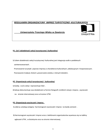 REGULAMIN ORGANIZACYJNY IMPREZ TURYSTYCZNO -KULTURALNYCH Uniwersytetu Trzeciego Wieku w Zawierciu §1 .Cel i działalność sekcji turystycznej i kulturalnej 1.Celem działalności sekcji turystycznej i kulturalnej jest integracja osób o podobnych zainteresowaniach . Promowanie turystyki poprzez imprezy o charakterze kulturalnym ,edukacyjnym i krajoznawczym. Poznawanie tradycji ,historii ,poszerzanie wiedzy z różnych dziedzin. §2 Organizacja sekcji turystycznej i kulturalnej 1.Każdą z w/w sekcji reprezentuje lider . 2.Sekcja dokumentuje swa działalnośd w formie fotografii ,krótkich relacji z imprez , wycieczek na stronie internetowej oraz w kronice UTW. §3 Organizacja wycieczek i imprez . 1.Liderzy ustalają wstępny harmonogram wycieczek i imprez na każdy semestr . 2.Harmonogram wycieczek i imprez wraz z telefonami organizatorów wywiesza się na tablicy ogłoszeo UTW , w biuletynie oraz na stronie internetowej. 1 3. W wycieczkach ,imprezach mogą brad udział w pierwszej kolejności członkowie UTW, posiadający ważną legitymacje członkowską. 4 . W przypadku braku kompletu członków Stowarzyszenia UTW uczestniczących w imprezie , mogą w niej uczestniczyd osoby nie będące członkami UTW . 5. Organizator imprezy zastrzega sobie prawo do odwołania imprezy z powodu niewystarczającej liczby zgłoszeo. 6 . Członek Stowarzyszenia UTW, po zapoznaniu się z ofertą wpisuje się na listę i dokonuje wpłaty w pełnej wysokości w przypadku imprezy kulturalnej , w przypadku imprezy turystycznej / wycieczki/ wplata jest dokonywana w dwóch przedpłatach. 7. Uczestnicy wycieczki przed jej rozpoczęciem zostaną ubezpieczeni przez lidera. 8. Organizator zastrzega sobie możliwośd zmiany ceny ze względów od niego niezależnych . 9. Lista zadeklarowanych osób stanowi podstawę kalkulacji kosztów wycieczki. 10. W przypadku rezygnacji z udziału w imprezie członek Stowarzyszenia UTW powinien zgłosid na swoje miejsce inną osobę. 11. Wycofanie się osoby z uczestnictwa w imprezie ,wycieczce wiąże się z utratą częściową / bądź całkowitą/wpłaconej kwoty w zależności od ustalonych i dokonanych przedpłat. § 4 .Zasady rozliczania finansowego imprez i wycieczek 1. Po każdej wycieczce dokonuje się rozliczenia finansowego Rozliczenie musi nastąpid w terminie14 dniowym 2 2. Skarbnik sekcji prowadzi dokumentacje finansową w postaci list wpłat i zwrotów, faktur i rachunków. 3. Zwrot nadpłaconej kwoty o której mowa w § 3 punkt 6 potwierdzony jest podpisem zainteresowanego w rubryce ,, zwroty,, 4. W przypadku wzrostu wstępnie skalkulowanej imprezy uczestnicy dokonują dopłat w oparciu o jej rzeczywiste koszty. 5 . W przypadku nadpłaty o której mowa w § 4 punkt 3 w wysokości 2 złote lub więcej zwraca się uczestnikowi kwotę nadpłaconą. Nadpłata w wysokości poniżej 2 złotych wnoszona jest do puli przeznaczonej na cele organizacyjne. § 5 .Postanowienia końcowe 1. Regulamin został przyjęty na zebraniu Rady Programowej w dniu 04.03 .2011r w głosowaniu jawnym . 2. Postanowienia niniejszego Regulaminu wchodzą w życie z dniem podpisania przez członków Rady Programowej. 3. Regulamin zostaje zamieszczony do wiadomości członków UTW na tablicy ogłoszeo i na stronie internetowej. Zawiercie dnia 04. 03 .2011 r Podpisy członków Rady Programowej 3