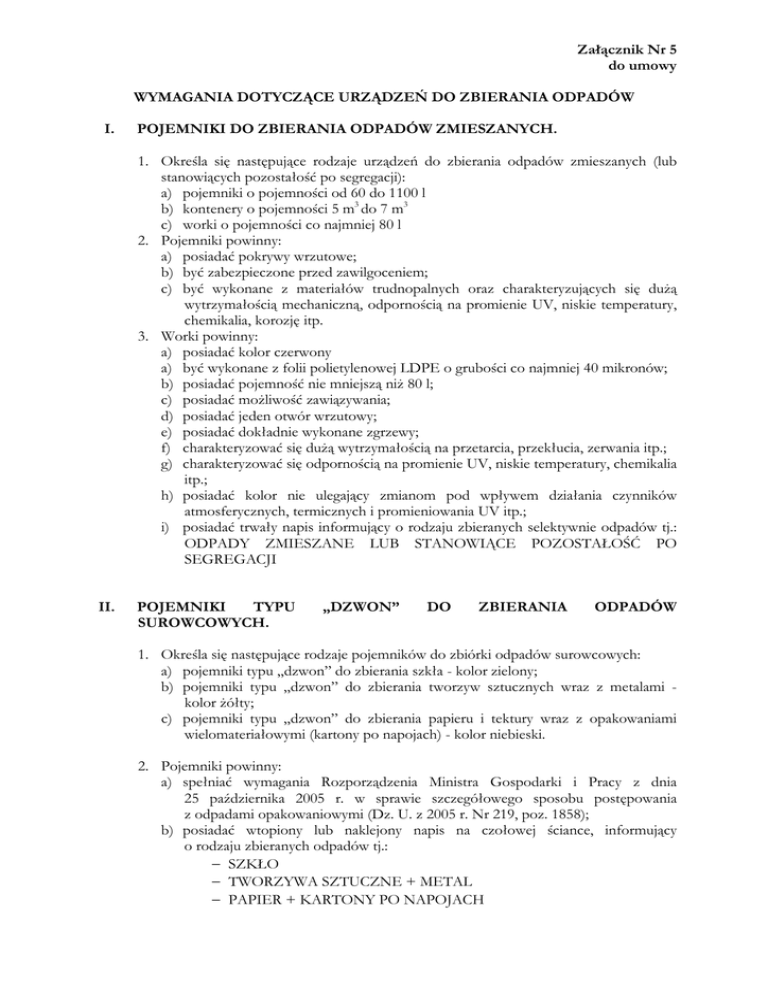 Załącznik Nr 5 do umowy WYMAGANIA DOTYCZĄCE URZĄDZEŃ DO ZBIERANIA ODPADÓW I. POJEMNIKI DO ZBIERANIA ODPADÓW ZMIESZANYCH. 1. Określa się następujące rodzaje urządzeń do zbierania odpadów zmieszanych (lub stanowiących pozostałość po segregacji): a) pojemniki o pojemności od 60 do 1100 l b) kontenery o pojemności 5 m3 do 7 m3 c) worki o pojemności co najmniej 80 l 2. Pojemniki powinny: a) posiadać pokrywy wrzutowe; b) być zabezpieczone przed zawilgoceniem; c) być wykonane z materiałów trudnopalnych oraz charakteryzujących się dużą wytrzymałością mechaniczną, odpornością na promienie UV, niskie temperatury, chemikalia, korozję itp. 3. Worki powinny: a) posiadać kolor czerwony a) być wykonane z folii polietylenowej LDPE o grubości co najmniej 40 mikronów; b) posiadać pojemność nie mniejszą niż 80 l; c) posiadać możliwość zawiązywania; d) posiadać jeden otwór wrzutowy; e) posiadać dokładnie wykonane zgrzewy; f) charakteryzować się dużą wytrzymałością na przetarcia, przekłucia, zerwania itp.; g) charakteryzować się odpornością na promienie UV, niskie temperatury, chemikalia itp.; h) posiadać kolor nie ulegający zmianom pod wpływem działania czynników atmosferycznych, termicznych i promieniowania UV itp.; i) posiadać trwały napis informujący o rodzaju zbieranych selektywnie odpadów tj.: ODPADY ZMIESZANE LUB STANOWIĄCE POZOSTAŁOŚĆ PO SEGREGACJI II. POJEMNIKI TYPU SUROWCOWYCH. „DZWON” DO ZBIERANIA ODPADÓW 1. Określa się następujące rodzaje pojemników do zbiórki odpadów surowcowych: a) pojemniki typu „dzwon” do zbierania szkła - kolor zielony; b) pojemniki typu „dzwon” do zbierania tworzyw sztucznych wraz z metalami kolor żółty; c) pojemniki typu „dzwon” do zbierania papieru i tektury wraz z opakowaniami wielomateriałowymi (kartony po napojach) - kolor niebieski. 2. Pojemniki powinny: a) spełniać wymagania Rozporządzenia Ministra Gospodarki i Pracy z dnia 25 października 2005 r. w sprawie szczegółowego sposobu postępowania z odpadami opakowaniowymi (Dz. U. z 2005 r. Nr 219, poz. 1858); b) posiadać wtopiony lub naklejony napis na czołowej ściance, informujący o rodzaju zbieranych odpadów tj.: − SZKŁO − TWORZYWA SZTUCZNE + METAL − PAPIER + KARTONY PO NAPOJACH c) d) e) f) g) h) i) III. napis ten powinien być umieszczony w sposób trwały (wtopiony, zalaminowany itp.) oraz informację na temat podstawowych rodzajów odpadów, jakie należy umieszczać w określonych rodzajach pojemników; być zabezpieczone przed zawilgoceniem; charakteryzować się dużą wytrzymałością mechaniczną, odpornością na promienie UV, niskie temperatury, chemikalia, korozję itp.; posiadać kolor nie ulegający zmianom pod wpływem działania czynników atmosferycznych, termicznych i promieniowania UV itp.; posiadać konstrukcję wygłuszającą hałas powstający podczas wrzucania odpadów; być łatwe w utrzymaniu czystości; być jednokomorowe i posiadać jeden otwór wrzutowy dostosowany do rodzaju gromadzonego surowca (surowców); posiadać pojemność nie mniejszą, niż 1,5 m3 WORKI DO ZBIERANIA ODPADÓW SUROWCOWYCH ORAZ ODPADÓW ZIELONYCH. 1. Określa się następujące rodzaje worków do zbierania odpadów surowcowych oraz odpadów zielonych: a) worki do zbierania szkła - kolor zielony; b) worki do zbierania tworzyw sztucznych wraz z metalami - kolor żółty; c) worki do zbierania papieru i tektury wraz z opakowaniami wielomateriałowymi (kartony po napojach) - kolor niebieski d) worki do zbierania odpadów zielonych – kolor brązowy 2. Worki powinny: a) być wykonane z folii polietylenowej LDPE o grubości: a. co najmniej 60 mikronów w przypadku worków przeznaczonych do zbierania szkła oraz worków przeznaczonych do zbierania odpadów zielonych, przy czym worki do zbierania odpadów zielonych muszą być biodegradowalne; b. co najmniej 40 mikronów w przypadku worków pozostałych; b) posiadać pojemność nie mniejszą niż 80 l; c) posiadać możliwość zawiązywania; d) posiadać jeden otwór wrzutowy; e) posiadać dokładnie wykonane zgrzewy; f) charakteryzować się dużą wytrzymałością na przetarcia, przekłucia, zerwania itp.; g) charakteryzować się odpornością na promienie UV, niskie temperatury, chemikalia itp.; h) posiadać kolor nie ulegający zmianom pod wpływem działania czynników atmosferycznych, termicznych i promieniowania UV itp.; i) posiadać trwały napis informujący o rodzaju zbieranych selektywnie odpadów tj.: − SZKŁO − TWORZYWA SZTUCZNE + METAL − PAPIER + KARTONY PO NAPOJACH oraz informację na temat podstawowych rodzajów odpadów, jakie należy umieszczać w określonych rodzajach pojemników
