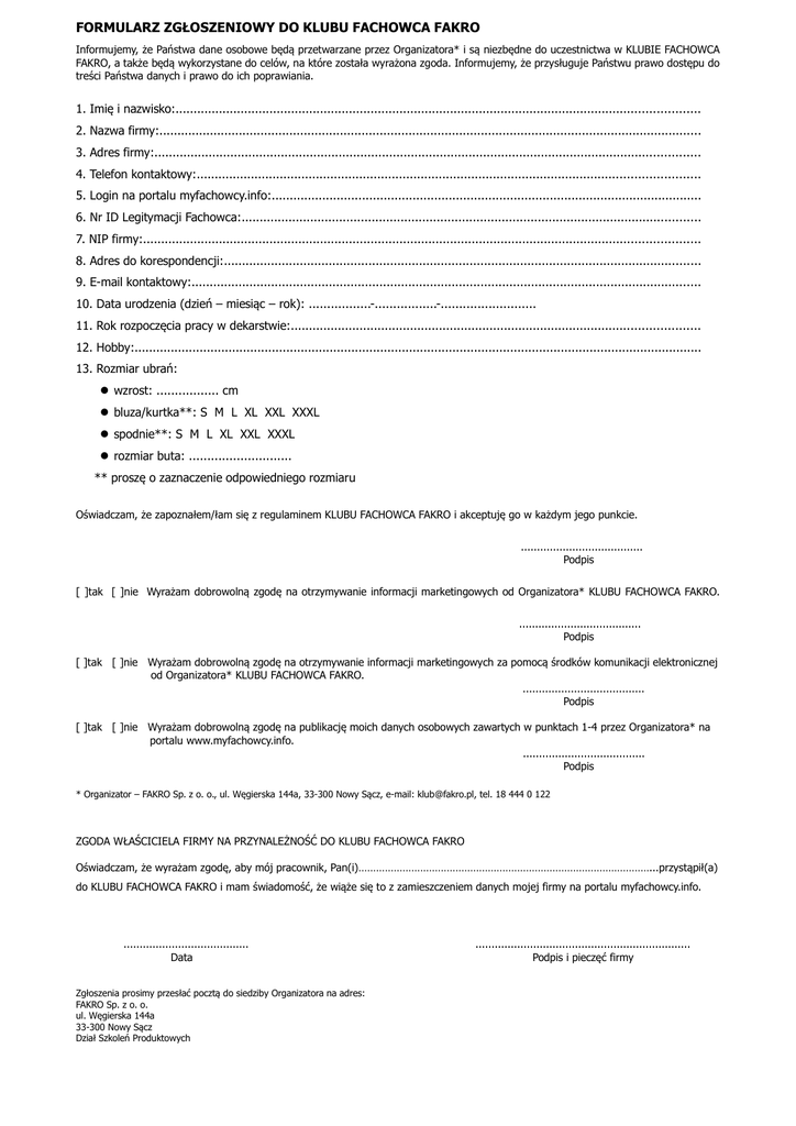 FORMULARZ ZGŁOSZENIOWY DO KLUBU FACHOWCA FAKRO Informujemy, że Państwa dane osobowe będą przetwarzane przez Organizatora* i są niezbędne do uczestnictwa w KLUBIE FACHOWCA FAKRO, a także będą wykorzystane do celów, na które została wyrażona zgoda. Informujemy, że przysługuje Państwu prawo dostępu do treści Państwa danych i prawo do ich poprawiania. 1. Imię i nazwisko:................................................................................................................................................. 2. Nazwa firmy:...................................................................................................................................................... 3. Adres firmy:....................................................................................................................................................... 4. Telefon kontaktowy:........................................................................................................................................... 5. Login na portalu myfachowcy.info:....................................................................................................................... 6. Nr ID Legitymacji Fachowca:............................................................................................................................... 7. NIP firmy:.......................................................................................................................................................... 8. Adres do korespondencji:.................................................................................................................................... 9. E-mail kontaktowy:............................................................................................................................................. 10. Data urodzenia (dzień – miesiąc – rok): .................-.................-.......................... 11. Rok rozpoczęcia pracy w dekarstwie:................................................................................................................. 12. Hobby:............................................................................................................................................................. 13. Rozmiar ubrań: wzrost: ................. cm bluza/kurtka**: S M L XL XXL XXXL spodnie**: S M L XL XXL XXXL rozmiar buta: ............................ ** proszę o zaznaczenie odpowiedniego rozmiaru Oświadczam, że zapoznałem/łam się z regulaminem KLUBU FACHOWCA FAKRO i akceptuję go w każdym jego punkcie. ...................................... Podpis [ ]tak [ ]nie Wyrażam dobrowolną zgodę na otrzymywanie informacji marketingowych od Organizatora* KLUBU FACHOWCA FAKRO. ...................................... Podpis [ ]tak [ ]nie Wyrażam dobrowolną zgodę na otrzymywanie informacji marketingowych za pomocą środków komunikacji elektronicznej od Organizatora* KLUBU FACHOWCA FAKRO. ...................................... Podpis [ ]tak [ ]nie Wyrażam dobrowolną zgodę na publikację moich danych osobowych zawartych w punktach 1-4 przez Organizatora* na portalu www.myfachowcy.info. ...................................... Podpis * Organizator – FAKRO Sp. z o. o., ul. Węgierska 144a, 33-300 Nowy Sącz, e-mail: [email protected], tel. 18 444 0 122 ZGODA WŁAŚCICIELA FIRMY NA PRZYNALEŻNOŚĆ DO KLUBU FACHOWCA FAKRO Oświadczam, że wyrażam zgodę, aby mój pracownik, Pan(i)………………………………………………………………………………………...przystąpił(a) do KLUBU FACHOWCA FAKRO i mam świadomość, że wiąże się to z zamieszczeniem danych mojej firmy na portalu myfachowcy.info. ....................................... Data Zgłoszenia prosimy przesłać pocztą do siedziby Organizatora na adres: FAKRO Sp. z o. o. ul. Węgierska 144a 33-300 Nowy Sącz Dział Szkoleń Produktowych ................................................................... Podpis i pieczęć firmy