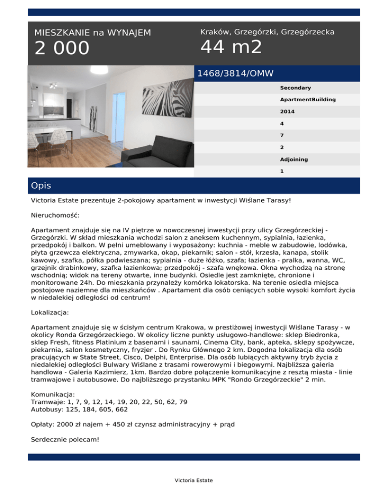 Kraków, Grzegórzki, Grzegórzecka MIESZKANIE na WYNAJEM 44 m2 2 000 1468/3814/OMW Secondary ApartmentBuilding 2014 4 7 2 Adjoining 1 Opis Victoria Estate prezentuje 2-pokojowy apartament w inwestycji Wiślane Tarasy! Nieruchomość: Apartament znajduje się na IV piętrze w nowoczesnej inwestycji przy ulicy Grzegórzeckiej Grzegórzki. W skład mieszkania wchodzi salon z aneksem kuchennym, sypialnia, łazienka, przedpokój i balkon. W pełni umeblowany i wyposażony: kuchnia - meble w zabudowie, lodówka, płyta grzewcza elektryczna, zmywarka, okap, piekarnik; salon - stół, krzesła, kanapa, stolik kawowy, szafka, półka podwieszana; sypialnia - duże łóżko, szafa; łazienka - pralka, wanna, WC, grzejnik drabinkowy, szafka łazienkowa; przedpokój - szafa wnękowa. Okna wychodzą na stronę wschodnią; widok na tereny otwarte, inne budynki. Osiedle jest zamknięte, chronione i monitorowane 24h. Do mieszkania przynależy komórka lokatorska. Na terenie osiedla miejsca postojowe naziemne dla mieszkańców . Apartament dla osób ceniących sobie wysoki komfort życia w niedalekiej odległości od centrum! Lokalizacja: Apartament znajduje się w ścisłym centrum Krakowa, w prestiżowej inwestycji Wiślane Tarasy - w okolicy Ronda Grzegórzeckiego. W okolicy liczne punkty usługowo-handlowe: sklep Biedronka, sklep Fresh, fitness Platinium z basenami i saunami, Cinema City, bank, apteka, sklepy spożywcze, piekarnia, salon kosmetyczny, fryzjer . Do Rynku Głównego 2 km. Dogodna lokalizacja dla osób pracujących w State Street, Cisco, Delphi, Enterprise. Dla osób lubiących aktywny tryb życia z niedalekiej odległości Bulwary Wiślane z trasami rowerowymi i biegowymi. Najbliższa galeria handlowa - Galeria Kazimierz, 1km. Bardzo dobre połączenie komunikacyjne z resztą miasta - linie tramwajowe i autobusowe. Do najbliższego przystanku MPK "Rondo Grzegórzeckie" 2 min. Komunikacja: Tramwaje: 1, 7, 9, 12, 14, 19, 20, 22, 50, 62, 79 Autobusy: 125, 184, 605, 662 Opłaty: 2000 zł najem + 450 zł czynsz administracyjny + prąd Serdecznie polecam! Victoria Estate Małgorzata Wicha tel. +48 511 560 721 email: [email protected] Victoria Estate Powered by TCPDF (www.tcpdf.org)
