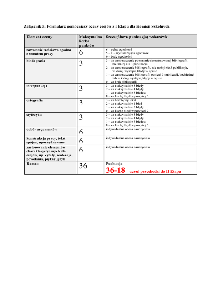 Załącznik 5: Formularz pomocniczy oceny esejów z I Etapu dla Komisji Szkolnych. Element oceny zawartość treściowa zgodna z tematem pracy bibliografia Maksymalna Szczegółowa punktacja; wskazówki liczba punktów 6 3 interpunkcja 3 ortografia 3 stylistyka 3 dobór argumentów 6 6 6 konstrukcja pracy, tekst spójny, uporządkowany zastosowanie elementów charakterystycznych dla esejów, np. cytaty, sentencje, powołania, piękny język Razem 36 6 – pełna zgodność 5 – 1 – wystarczająca zgodność 0 – brak zgodności 3 – za zamieszczenie poprawnie skonstruowanej bibliografii, nie mniej niŜ 3 publikacje 2 – za zamieszczenie bibliografii, nie mniej niŜ 3 publikacje, w której wystąpią błędy w opisie 1 – za zamieszczenie bibliografii poniŜej 3 publikacji, bezbłędnej lub w której wystąpią błędy w opisie 0 – za brak bibliografii 3 – za maksymalnie 3 błędy 2 – za maksymalnie 4 błędy 1 – za maksymalnie 5 błędów 0 – za liczbę błędów powyŜej 5 3 – za bezbłędny tekst 2 – za maksymalnie 1 błąd 1 – za maksymalnie 2 błędy 0 – za liczbę błędów powyŜej 2 3 – za maksymalnie 3 błędy 2 – za maksymalnie 4 błędy 1 – za maksymalnie 5 błędów 0 – za liczbę błędów powyŜej 5 indywidualna ocena nauczyciela indywidualna ocena nauczyciela indywidualna ocena nauczyciela Punktacja 36-18 – uczeń przechodzi do II Etapu