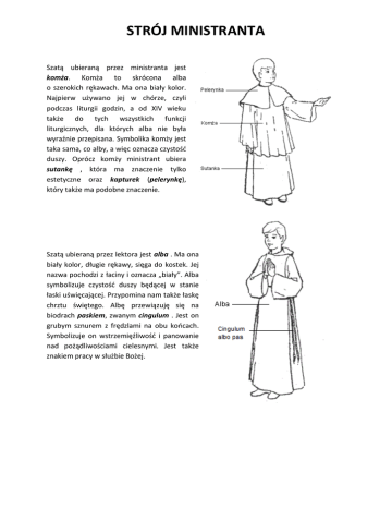 STRÓJ MINISTRANTA Szatą ubieraną przez ministranta jest komża. Komża to skrócona alba o szerokich rękawach. Ma ona biały kolor. Najpierw używano jej w chórze, czyli podczas liturgii godzin, a od XIV wieku także do tych wszystkich funkcji liturgicznych, dla których alba nie była wyraźnie przepisana. Symbolika komży jest taka sama, co alby, a więc oznacza czystość duszy. Oprócz komży ministrant ubiera sutankę , która ma znaczenie tylko estetyczne oraz kapturek (pelerynkę), który także ma podobne znaczenie. Szatą ubieraną przez lektora jest alba . Ma ona biały kolor, długie rękawy, sięga do kostek. Jej nazwa pochodzi z łaciny i oznacza „biały”. Alba symbolizuje czystość duszy będącej w stanie łaski uświęcającej. Przypomina nam także łaskę chrztu świętego. Albę przewiązuję się na biodrach paskiem, zwanym cingulum . Jest on grubym sznurem z frędzlami na obu końcach. Symbolizuje on wstrzemięźliwość i panowanie nad pożądliwościami cielesnymi. Jest także znakiem pracy w służbie Bożej.