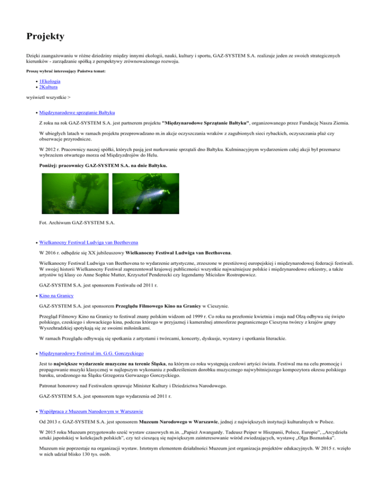 Projekty Dzięki zaangażowaniu w różne dziedziny między innymi ekologii, nauki, kultury i sportu, GAZ-SYSTEM S.A. realizuje jeden ze swoich strategicznych kierunków - zarządzanie spółką z perspektywy zrównoważonego rozwoju. Proszę wybrać interesujący Państwa temat: 1Ekologia 2Kultura wyświetl wszystkie > Międzynarodowe sprzątanie Bałtyku Z roku na rok GAZ-SYSTEM S.A. jest partnerem projektu "Międzynarodowe Sprzątanie Bałtyku", organizowanego przez Fundację Nasza Ziemia. W ubiegłych latach w ramach projektu przeprowadzano m.in akcje oczyszczania wraków z zagubionych sieci rybackich, oczyszczania plaż czy obserwacje przyrodnicze. W 2012 r. Pracownicy naszej spółki, których pasją jest nurkowanie sprzątali dno Bałtyku. Kulminacyjnym wydarzeniem całej akcji był przemarsz wybrzeżem otwartego morza od Międzyzdrojów do Helu. Poniżej: pracownicy GAZ-SYSTEM S.A. na dnie Bałtyku. Fot. Archiwum GAZ-SYSTEM S.A. Wielkanocny Festiwal Ludviga van Beethovena W 2016 r. odbędzie się XX jubileuszowy Wielkanocny Festiwal Ludwiga van Beethovena. Wielkanocny Festiwal Ludwiga van Beethovena to wydarzenie artystyczne, zrzeszone w prestiżowej europejskiej i międzynarodowej federacji festiwali. W swojej historii Wielkanocny Festiwal zaprezentował krajowej publiczności wszystkie najważniejsze polskie i międzynarodowe orkiestry, a także artystów tej klasy co Anne Sophie Mutter, Krzysztof Penderecki czy legendarny Mścisław Rostropowicz. GAZ-SYSTEM S.A. jest sponsorem Festiwalu od 2011 r. Kino na Granicy GAZ-SYSTEM S.A. jest sponsorem Przeglądu Filmowego Kino na Granicy w Cieszynie. Przegląd Filmowy Kino na Granicy to festiwal znany polskim widzom od 1999 r. Co roku na przełomie kwietnia i maja nad Olzą odbywa się święto polskiego, czeskiego i słowackiego kina, podczas którego w przyjaznej i kameralnej atmosferze pogranicznego Cieszyna twórcy z krajów grupy Wyszehradzkiej spotykają się ze swoimi miłośnikami. W ramach Przeglądu odbywają się spotkania z artystami i twórcami, koncerty, dyskusje, wystawy i spotkania literackie. Międzynarodowy Festiwal im. G.G. Gorczyckiego Jest to największe wydarzenie muzyczne na terenie Śląska, na którym co roku występują czołowi artyści świata. Festiwal ma na celu promocję i propagowanie muzyki klasycznej w najlepszym wykonaniu z podkreśleniem dorobku muzycznego najwybitniejszego kompozytora okresu polskiego baroku, urodzonego na Śląsku Grzegorza Gerwazego Gorczyckiego. Patronat honorowy nad Festiwalem sprawuje Minister Kultury i Dziedzictwa Narodowego. GAZ-SYSTEM S.A. jest sponsorem tego wydarzenia od 2011 r. Współpraca z Muzeum Narodowym w Warszawie Od 2013 r. GAZ-SYSTEM S.A. jest sponsorem Muzeum Narodowego w Warszawie, jednej z największych instytucji kulturalnych w Polsce. W 2015 roku Muzeum przygotowało sześć wystaw czasowych m.in. „Papież Awangardy. Tadeusz Peiper w Hiszpanii, Polsce, Europie”, „Arcydzieła sztuki japońskiej w kolekcjach polskich”, czy też cieszącą się największym zainteresowanie wśród zwiedzających, wystawę „Olga Boznańska”. Muzeum nie poprzestaje na organizacji wystaw. Istotnym elementem działalności Muzeum jest organizacja projektów edukacyjnych. W 2015 r. wzięło w nich udział blisko 130 tys. osób.