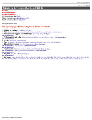 Informacje o produkcie Utworzono 08-03-2017 Zdjęcie na krysztale 30x40 cm FK220z Cena : Ceny dostępne po zalogowaniu Nr katalogowy : FK220Z Stan magazynowy : bardzo wysoki Średnia ocena : brak recenzji zdjęcie na krysztale 30X40 Dostępne opcje Zdjęcie na krysztale 30x40 cm FK220z » Rodzaj kryształu: Fazowany, Bez fazy. » Typ: kryształ prostokąt czarno-białe, kryształ prostokąt kolorowe, kryształ prostokąt sepia. » Kolorowanie zdjęcia czarnobiałeg: Nie, Tak (+Ceny dostępne po zalogowaniu). » Wykończenie zdjęcia: Zdjęcie na całości, Bezbarwna faza, Czarny pasek (+Ceny dostępne po zalogowaniu). » Profil: Bez zmian, Zmiana profilu. » Tło: Do decyzji F.H. Alina, W oryginale, Niebieskie, Beżowe, Szare, Inne - opis w uwagach. » Zdjęcie Podwojne: Nie, Tak - w poziomie (+Ceny dostępne po zalogowaniu), Tak - w pionie (+Ceny dostępne po zalogowaniu). » Mocowanie: Taśma montażowa, Podstawka szklana (+Ceny dostępne po zalogowaniu), Otwory pod tuleje dystansowe (+Ceny dostępne po zalogowaniu). » Projekt: Nie, Tak (+Ceny dostępne po zalogowaniu). » Ubranie: Bez zmian, K1, K2, K3, K4, K5, K6, K7, K8, K9, K10, K11, K12, K13, K14, K15, K16, K17, K18, K19, K20, M1, M2, M3, M4, M5, M6, M7, M8, M9, M10, M11, M12, M13, M14, M15, M16, M17, M18, M19, M20, D1, D2, D3, D4, D5, D6, D7, D8, D9, D10, D11, D12. Wygenerowano w programie www.oscGold.com