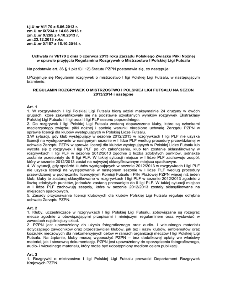 t.j.U nr VI/170 z 5.06.2013 r. zm.U nr IX/234 z 14.08.2013 r. zm.U.nr X/265 z 4.10.2013 r. zm.23.12.2013 roku zm.U.nr X/157 z 15.10.2014 r. Uchwała nr VI/170 z dnia 5 czerwca 2013 roku Zarządu Polskiego Związku Piłki Nożnej w sprawie przyjęcia Regulaminu Rozgrywek o Mistrzostwo I Polskiej Ligi Futsalu Na podstawie art. 36 § 1 pkt 9) i 12) Statutu PZPN postanawia się, co następuje: I.Przyjmuje się Regulamin rozgrywek o mistrzostwo I ligi Polskiej Ligi Futsalu, w następującym brzmieniu: REGULAMIN ROZGRYWEK O MISTRZOSTWO I POLSKIEJ LIGI FUTSALU NA SEZON 2013/2014 i następne Art. 1 1. W rozgrywkach I ligi Polskiej Ligi Futsalu biorą udział maksymalnie 24 drużyny w dwóch grupach, które zakwalifikowały się na podstawie uzyskanych wyników rozgrywek Ekstraklasy Polskiej Ligi Futsalu i I ligi oraz II ligi PLF sezonu poprzedniego. 2. Do rozgrywek I ligi Polskiej Ligi Futsalu zostaną dopuszczone kluby, które są członkami macierzystego związku piłki nożnej i spełnią warunki określone uchwałą Zarządu PZPN w sprawie licencji dla klubów występujących w Polskiej Lidze Futsalu. 3.W sytuacji, gdy klub występujący w sezonie 2012/2013 w rozgrywkach I ligi PLF nie uzyska licencji na występowanie w następnym sezonie w I lidze PLF według procedury przewidzianej w uchwale Zarządu PZPN w sprawie licencji dla klubów występujących w Polskiej Lidze Futsalu lub wycofa się z rozgrywek I ligi PLF po ich zakończeniu, klub ten zostanie sklasyfikowany w rozgrywkach I ligi PLF w sezonie 2012/2013 zgodnie z liczbą zdobytych punktów, jednakże zostanie przesunięty do II ligi PLF. W takiej sytuacji miejsce w I lidze PLF zachowuje zespół, który w sezonie 2012/2013 został na najwyżej sklasyfikowanym miejscu spadkowym. 4. W sytuacji, gdy spośród klubów występujących w sezonie 2012/2013 w rozgrywkach I ligi PLF nie uzyska licencji na występowanie w następnym sezonie w I lidze PLF według procedury przewidzianej w podręczniku licencyjnym Komisji Futsalu i Piłki Plażowej PZPN więcej niż jeden klub, kluby te zostaną sklasyfikowane w rozgrywkach I ligi PLF w sezonie 2012/2013 zgodnie z liczbą zdobytych punktów, jednakże zostaną przesunięte do II ligi PLF. W takiej sytuacji miejsce w I lidze PLF zachowują zespoły, które w sezonie 2012/2013 zostały sklasyfikowane na miejscach spadkowych. 5. Zasady przyznawania licencji klubowych dla klubów Polskiej Ligi Futsalu reguluje odrębna uchwała Zarządu PZPN. Art. 2 1. Kluby, uczestniczące w rozgrywkach I ligi Polskiej Ligi Futsalu, zobowiązane są rozegrać mecze zgodnie z obowiązującymi przepisami i niniejszym regulaminem oraz wystawiać w zawodach najsilniejszy skład. 2. PZPN jest upoważniony do użycia fotograficznego oraz audio- i wizualnego materiału dotyczącego zawodników oraz przedstawicieli klubów, jak też i nazw klubów, emblematów oraz koszulek meczowych dla niekomercyjnych celów w ramach organizacji meczów I ligi Polskiej Ligi Futsalu. Na żądanie, kluby muszą wyposażyć PZPN – bez dodatkowej opłaty we właściwy materiał, jak i stosowną dokumentację. PZPN jest upoważniony do sporządzenia fotograficznego, audio- i wizualnego materiału, który może być udostępniony mediom celem publikacji. Art. 3 1. Rozgrywki o mistrzostwo I ligi Polskiej Ligi Futsalu prowadzi Departament Rozgrywek Krajowych PZPN. 2. Rozgrywki o mistrzostwo I ligi Polskiej Ligi Futsalu są prowadzone w terminach ustalonych przez Departament Rozgrywek Krajowych PZPN. 3. Kluby uczestniczące w rozgrywkach I ligi Polskiej Ligi Futsalu zobowiązane są do posiadania oficjalnego adresu poczty elektronicznej, za pomocą którego prowadzona jest korespondencja z Departamentem Rozgrywek Krajowych PZPN. Wszelka korespondencja dotycząca I ligi PLF powinna być przesyłana za pomocą poczty elektronicznej na adres [email protected] 4. Sędziów do prowadzenia zawodów I ligi Polskiej Ligi Futsalu wyznacza Kolegium Sędziów PZPN. 5. Kluby uczestniczące w rozgrywkach I ligi PLF zobowiązane są do dokonania przedpłat na pokrycie kosztów delegowania sędziów i obserwatorów w dwóch ratach: • I rata w wysokości 3000- zł – płatna przed rozpoczęciem rozgrywek rundy jesiennej sezonu 2013/2014. Dowód uregulowania opłaty należy złożyć w Departamencie Rozgrywek Krajowych PZPN na 7 dni przed rozpoczęciem rozgrywek rundy jesiennej. • II rata w wysokości 3000- zł - płatna przed rozpoczęciem rozgrywek rundy wiosennej sezonu 2013/2014.Dowód uregulowania opłaty należy złożyć w Departamencie Rozgrywek Krajowych PZPN na 7 dni przed rozpoczęciem rozgrywek rundy wiosennej. W uzasadnionych przypadkach wynikających z potrzeby zachowania integralności rozgrywek, Departament Rozgrywek Krajowych PZPN zastrzega sobie prawo do zmiany wysokości kwoty wpłaty na pokrycie kosztów delegowania sędziów i obserwatorów. Poniższa tabela szczegółowo precyzuje wysokość przedpłat w w/w sprawie: Ilość drużyn Ilość meczy jako gospodarz Poniesione koszty przez KLUB Poniesione koszty przez PZPN 12 11 6000 11 10 5500 6000 5500 Ilość drużyn w grupie 10 9 8 9 8 7 5000 4500 4000 5000 4500 4000 7 6 3500 6 5 3000 3500 3000 6. Brak terminowego dokonania ww. opłat spowoduje odwoływanie kolejnych zawodów, w których dany klub pełni rolę gospodarza i ich weryfikację jako walkower 0:5, zgodnie z postanowieniami Art. 24 ust. 1 pkt s niniejszego regulaminu, do czasu uregulowania przez klub przedmiotowej należności. Postanowienia art. 14 ust. 2 niniejszego regulaminu stosuje się odpowiednio. 7. Kluby uczestniczące w rozgrywkach I ligi PLF zobowiązane są do dokonania przedpłat na poczet przyszłych kar za żółte kartki w dwóch ratach: • I rata w wysokości 500 zł – płatna przed rozpoczęciem rozgrywek rundy jesiennej sezonu 2013/2014. Dowód uregulowania opłaty należy złożyć w Departamencie Rozgrywek Krajowych PZPN na 7 dni przed rozpoczęciem rozgrywek rundy jesiennej. • II rata w wysokości