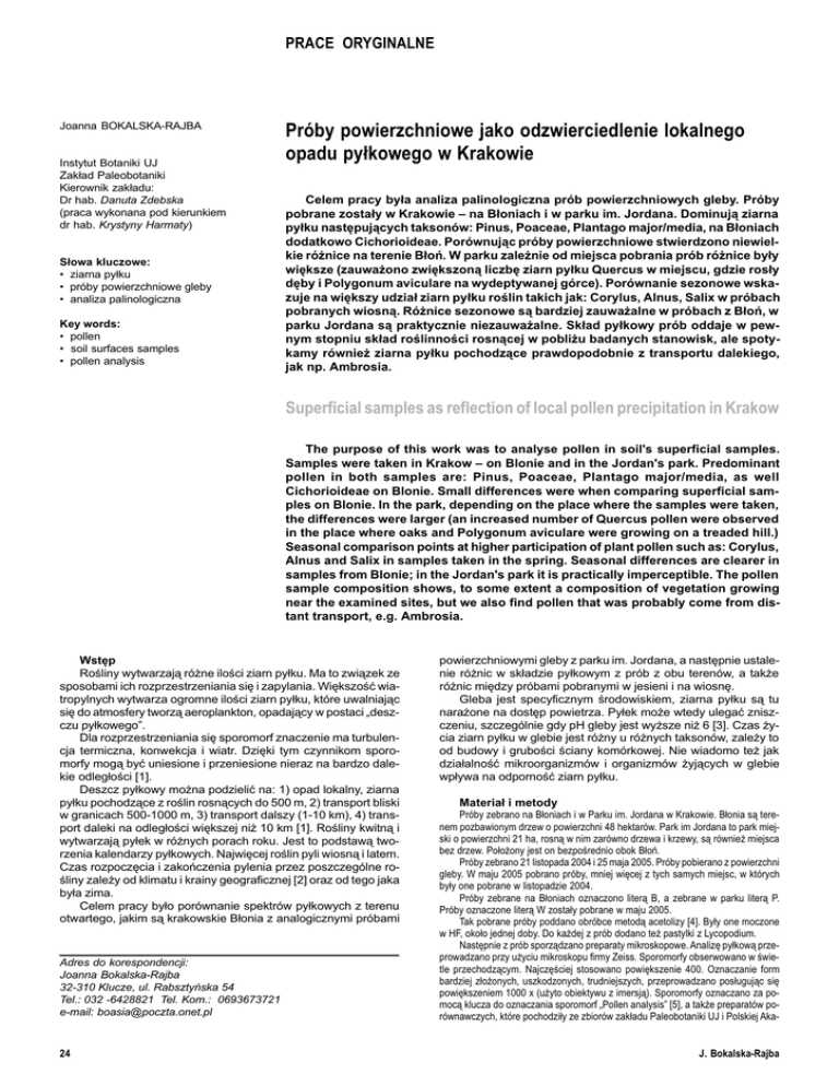 PRACE ORYGINALNE Joanna BOKALSKA-RAJBA Instytut Botaniki UJ Zak³ad Paleobotaniki Kierownik zak³adu: Dr hab. Danuta Zdebska (praca wykonana pod kierunkiem dr hab. Krystyny Harmaty) S³owa kluczowe: ziarna py³ku próby powierzchniowe gleby analiza palinologiczna Key words: pollen soil surfaces samples pollen analysis Próby powierzchniowe jako odzwierciedlenie lokalnego opadu py³kowego w Krakowie Celem pracy by³a analiza palinologiczna prób powierzchniowych gleby. Próby pobrane zosta³y w Krakowie na B³oniach i w parku im. Jordana. Dominuj¹ ziarna py³ku nastêpuj¹cych taksonów: Pinus, Poaceae, Plantago major/media, na B³oniach dodatkowo Cichorioideae. Porównuj¹c próby powierzchniowe stwierdzono niewielkie ró¿nice na terenie B³oñ. W parku zale¿nie od miejsca pobrania prób ró¿nice by³y wiêksze (zauwa¿ono zwiêkszon¹ liczbê ziarn py³ku Quercus w miejscu, gdzie ros³y dêby i Polygonum aviculare na wydeptywanej górce). Porównanie sezonowe wskazuje na wiêkszy udzia³ ziarn py³ku rolin takich jak: Corylus, Alnus, Salix w próbach pobranych wiosn¹. Ró¿nice sezonowe s¹ bardziej zauwa¿alne w próbach z B³oñ, w parku Jordana s¹ praktycznie niezauwa¿alne. Sk³ad py³kowy prób oddaje w pewnym stopniu sk³ad rolinnoci rosn¹cej w pobli¿u badanych stanowisk, ale spotykamy równie¿ ziarna py³ku pochodz¹ce prawdopodobnie z transportu dalekiego, jak np. Ambrosia. Superficial samples as reflection of local pollen precipitation in Krakow The purpose of this work was to analyse pollen in soil's superficial samples. Samples were taken in Krakow on Blonie and in the Jordan's park. Predominant pollen in both samples are: Pinus, Poaceae, Plantago major/media, as well Cichorioideae on Blonie. Small differences were when comparing superficial samples on Blonie. In the park, depending on the place where the samples were taken, the differences were larger (an increased number of Quercus pollen were observed in the place where oaks and Polygonum aviculare were growing on a treaded hill.) Seasonal comparison points at higher participation of plant pollen such as: Corylus, Alnus and Salix in samples taken in the spring. Seasonal differences are clearer in samples from Blonie; in the Jordan's park it is practically imperceptible. The pollen sample composition shows, to some extent a composition of vegetation growing near the examined sites, but we also find pollen that was probably come from distant transport, e.g. Ambrosia. Wstêp Roliny wytwarzaj¹ ró¿ne iloci ziarn py³ku. Ma to zwi¹zek ze sposobami ich rozprzestrzeniania siê i zapylania. Wiêkszoæ wiatropylnych wytwarza ogromne iloci ziarn py³ku, które uwalniaj¹c siê do atmosfery tworz¹ aeroplankton, opadaj¹cy w postaci deszczu py³kowego. Dla rozprzestrzeniania siê sporomorf znaczenie ma turbulencja termiczna, konwekcja i wiatr. Dziêki tym czynnikom sporomorfy mog¹ byæ uniesione i przeniesione nieraz na bardzo dalekie odleg³oci [1]. Deszcz py³kowy mo¿na podzieliæ na: 1) opad lokalny, ziarna py³ku pochodz¹ce z rolin rosn¹cych do 500 m, 2) transport bliski w granicach 500-1000 m, 3) transport dalszy (1-10 km), 4) transport daleki na odleg³oci wiêkszej ni¿ 10 km [1]. Roliny kwitn¹ i wytwarzaj¹ py³ek w ró¿nych porach roku. Jest to podstaw¹ tworzenia kalendarzy py³kowych. Najwiêcej rolin pyli wiosn¹ i latem. Czas rozpoczêcia i zakoñczenia pylenia przez poszczególne roliny zale¿y od klimatu i krainy geograficznej [2] oraz od tego jaka by³a zima. Celem pracy by³o porównanie spektrów py³kowych z terenu otwartego, jakim s¹ krakowskie B³onia z analogicznymi próbami Adres do korespondencji: Joanna Bokalska-Rajba 32-310 Klucze, ul. Rabsztyñska 54 Tel.: 032 -6428821 Tel. Kom.: 0693673721 e-mail: [email protected] 24 powierzchniowymi gleby z parku im. Jordana, a nastêpnie ustalenie ró¿nic w sk³adzie py³kowym z prób z obu terenów, a tak¿e ró¿nic miêdzy próbami pobranymi w jesieni i na wiosnê. Gleba jest specyficznym rodowiskiem, ziarna py³ku s¹ tu nara¿one na dostêp powietrza. Py³ek mo¿e wtedy ulegaæ zniszczeniu, szczególnie gdy pH gleby jest wy¿sze ni¿ 6 [3]. Czas ¿ycia ziarn py³ku w glebie jest ró¿ny u ró¿nych taksonów, zale¿y to od budowy i gruboci ciany komórkowej. Nie wiadomo te¿ jak dzia³alnoæ mikroorganizmów i organizmów ¿yj¹cych w glebie wp³ywa na odpornoæ ziarn py³ku. Materia³ i metody Próby zebrano na B³oniach i w Parku im. Jordana w Krakowie. B³onia s¹ terenem pozbawionym drzew o powierzchni 48 hektarów. Park im Jordana to park miejski o powierzchni 21 ha, rosn¹ w nim zarówno drzewa i krzewy, s¹ równie¿ miejsca bez drzew. Po³o¿ony jest on bezporednio obok B³oñ. Próby zebrano 21 listopada 2004 i 25 maja 2005. Próby pobierano z powierzchni gleby. W maju 2005 pobrano próby, mniej wiêcej z tych samych miejsc, w których by³y one pobrane w listopadzie 2004. Próby zebrane na B³oniach oznaczono liter¹ B, a zebrane w parku liter¹ P. Próby oznaczone liter¹ W zosta³y pobrane w maju 2005. Tak pobrane próby poddano obróbce metod¹ acetolizy [4]. By³y one moczone w HF, oko³o jednej doby. Do ka¿dej z prób dodano te¿ pastylki z Lycopodium. Nastêpnie z prób sporz¹dzano preparaty mikroskopowe. Analizê py³kow¹ przeprowadzano przy u¿yciu mikroskopu firmy Zeiss. Sporomorfy obserwowano w wietle przechodz¹cym. Najczêciej stosowano powiêkszenie 400. Oznaczanie form bardziej z³o¿onych, uszkodzonych, trudniejszych, przeprowadzano pos³uguj¹c siê powiêkszeniem 1000 x (u¿yto obiektywu z imersj¹). Sporomorfy oznaczano za pomoc¹ klucza do oznaczania sporomorf Pollen analysis [5], a tak¿e preparatów porównawczych, które pochodzi³y ze zbiorów zak³adu Paleobotaniki UJ i Polskiej AkaJ. Bokalska-Rajba Rycina1 Próby powierzchniowe, Kraków, B³onia. Comparision between soil surface samples from Kraków, B³onia. Rycina2 Próby powierzchniowe, Kraków, park im. Jordana. Comparision between soil surface samples f