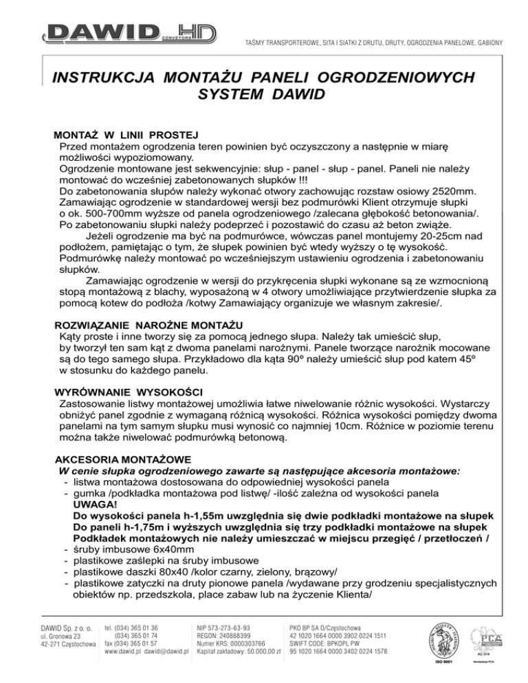 INSTRUKCJA MONTAŻU PANELI OGRODZENIOWYCH SYSTEM DAWID MONTAŻ W LINII PROSTEJ Przed montażem ogrodzenia teren powinien być oczyszczony a następnie w miarę możliwości wypoziomowany. Ogrodzenie montowane jest sekwencyjnie: słup - panel - słup - panel. Paneli nie należy montować do wcześniej zabetonowanych słupków !!! Do zabetonowania słupów należy wykonać otwory zachowując rozstaw osiowy 2520mm. Zamawiając ogrodzenie w standardowej wersji bez podmurówki Klient otrzymuje słupki o ok. 500-700mm wyższe od panela ogrodzeniowego /zalecana głębokość betonowania/. Po zabetonowaniu słupki należy podeprzeć i pozostawić do czasu aż beton zwiąże. Jeżeli ogrodzenie ma być na podmurówce, wówczas panel montujemy 20-25cm nad podłożem, pamiętając o tym, że słupek powinien być wtedy wyższy o tę wysokość. Podmurówkę należy montować po wcześniejszym ustawieniu ogrodzenia i zabetonowaniu słupków. Zamawiając ogrodzenie w wersji do przykręcenia słupki wykonane są ze wzmocnioną stopą montażową z blachy, wyposażoną w 4 otwory umożliwiające przytwierdzenie słupka za pomocą kotew do podłoża /kotwy Zamawiający organizuje we własnym zakresie/. ROZWIĄZANIE NAROŻNE MONTAŻU Kąty proste i inne tworzy się za pomocą jednego słupa. Należy tak umieścić słup, by tworzył ten sam kąt z dwoma panelami narożnymi. Panele tworzące narożnik mocowane są do tego samego słupa. Przykładowo dla kąta 90º należy umieścić słup pod katem 45º w stosunku do każdego panelu. WYRÓWNANIE WYSOKOŚCI Zastosowanie listwy montażowej umożliwia łatwe niwelowanie różnic wysokości. Wystarczy obniżyć panel zgodnie z wymaganą różnicą wysokości. Różnica wysokości pomiędzy dwoma panelami na tym samym słupku musi wynosić co najmniej 10cm. Różnice w poziomie terenu można także niwelować podmurówką betonową. AKCESORIA MONTAŻOWE W cenie słupka ogrodzeniowego zawarte są następujące akcesoria montażowe: - listwa montażowa dostosowana do odpowiedniej wysokości panela - gumka /podkładka montażowa pod listwę/ -ilość zależna od wysokości panela UWAGA! Do wysokości panela h-1,55m uwzględnia się dwie podkładki montażowe na słupek Do paneli h-1,75m i wyższych uwzględnia się trzy podkładki montażowe na słupek Podkładek montażowych nie należy umieszczać w miejscu przegięć / przetłoczeń / - śruby imbusowe 6x40mm - plastikowe zaślepki na śruby imbusowe - plastikowe daszki 80x40 /kolor czarny, zielony, brązowy/ - plastikowe zatyczki na druty pionowe panela /wydawane przy grodzeniu specjalistycznych obiektów np. przedszkola, place zabaw lub na życzenie Klienta/