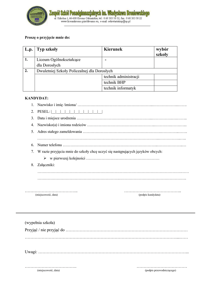 Proszę o przyjęcie mnie do: L.p. Typ szkoły 1. 2. wybór szkoły Kierunek Liceum Ogólnokształcące dla Dorosłych Dwuletniej Szkoły Policealnej dla Dorosłych technik administracji technik BHP technik informatyk KANDYDAT: 1. Nazwisko i imię /imiona/ …………………………………………………..………………..……. 2. PESEL: |__|__|__|__|__|__|__|__|__|__|__| 3. Data i miejsce urodzenia …………………………………………………..…………….….…….. 4. Nazwisko(a) i imiona rodziców ……………………………………………..………….…….…... 5. Adres stałego zameldowania …………………………………………………….…………..……. …………………………………………………………………………………..……………..….. 6. Numer telefonu ………………………………………………………………..………………..… 7. W razie przyjęcia mnie do szkoły chcę uczyć się następujących języków obcych:  w pierwszej kolejności ………………………………………………… 8. Załączniki: ………………………………………………………………………………………………….…… ……………………………………………………….……………………………………………. ……………………………….. (miejscowość, data) ………………………………….. (podpis kandydata) (wypełnia szkoła) Przyjąć / nie przyjąć do …………………………………………………………………………… ………………………………………………………………………………………………...…… Uwagi: ……………………………………………………………………………………………... ………………………………. (miejscowość, data) ……………………………… (podpis przewodniczącego)