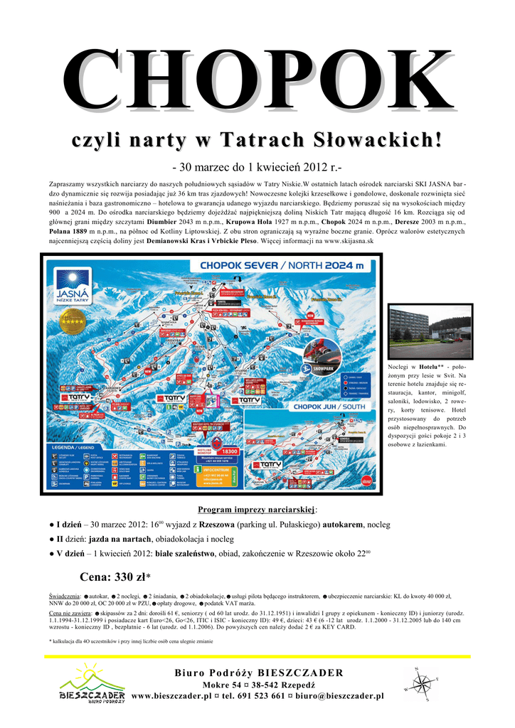 CHOPOK czyli narty w Tatrach Słowackich! - 30 marzec do 1 kwiecień 2012 r.Zapraszamy wszystkich narciarzy do naszych południowych sąsiadów w Tatry Niskie.W ostatnich latach ośrodek narciarski SKI JASNA bar dzo dynamicznie się rozwija posiadając już 36 km tras zjazdowych! Nowoczesne kolejki krzesełkowe i gondolowe, doskonale rozwinięta sieć naśnieżania i baza gastronomiczno – hotelowa to gwarancja udanego wyjazdu narciarskiego. Będziemy poruszać się na wysokościach między 900 a 2024 m. Do ośrodka narciarskiego będziemy dojeżdżać najpiękniejszą doliną Niskich Tatr mającą długość 16 km. Rozciąga się od głównej grani między szczytami Diumbier 2043 m n.p.m., Krupowa Hola 1927 m n.p.m., Chopok 2024 m n.p.m., Deresze 2003 m n.p.m., Polana 1889 m n.p.m., na północ od Kotliny Liptowskiej. Z obu stron ograniczają są wyraźne boczne granie. Oprócz walorów estetycznych najcenniejszą częścią doliny jest Demianowski Kras i Vrbickie Pleso. Więcej informacji na www.skijasna.sk Noclegi w Hotelu** - położonym przy lesie w Svit. Na terenie hotelu znajduje się restauracja, kantor, minigolf, saloniki, lodowisko, 2 rowery, korty tenisowe. Hotel przystosowany do potrzeb osób niepełnosprawnych. Do dyspozycji gości pokoje 2 i 3 osobowe z łazienkami. Program imprezy narciarskiej : ● I dzień – 30 marzec 2012: 16 wyjazd z Rzeszowa (parking ul. Pułaskiego) autokarem, nocleg 00 ● II dzień: jazda na nartach, obiadokolacja i nocleg ● V dzień – 1 kwiecień 2012: białe szaleństwo, obiad, zakończenie w Rzeszowie około 2200 Cena: 330 zł * Świadczenia: ☻autokar, ☻2 noclegi, ☻2 śniadania, ☻2 obiadokolacje,☻usługi pilota będącego instruktorem, ☻ubezpieczenie narciarskie: KL do kwoty 40 000 zł, NNW do 20 000 zł, OC 20 000 zł w PZU,☻opłaty drogowe, ☻podatek VAT marża. Cena nie zawiera: ☻skipassów za 2 dni: dorośli 61 €, seniorzy ( od 60 lat urodz. do 31.12.1951) i inwalidzi I grupy z opiekunem - konieczny ID) i juniorzy (urodz. 1.1.1994-31.12.1999 i posiadacze kart Euro<26, Go<26, ITIC i ISIC - konieczny ID): 49 €, dzieci: 43 € (6 -12 lat urodz. 1.1.2000 - 31.12.2005 lub do 140 cm wzrostu - konieczny ID , bezpłatnie - 6 lat (urodz. od 1.1.2006). Do powyższych cen należy dodać 2 € za KEY CARD. * kalkulacja dla 4O uczestników i przy innej liczbie osób cena ulegnie zmianie B i u r o P o d r ó ży B I E S ZC ZA D E R Mokre 54 ¤ 38-542 Rzepedź www.bieszczader.pl ¤ tel. 691 523 661 ¤ [email protected]