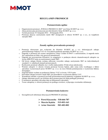 REGULAMIN PROMOCJI Postanowienia ogólne o o o o Organizatorem promocji „WIELKA PROMOCJA SKF” jest firma M-MOT sp. z o.o. Akcja promocyjna przeznaczona jest dla klientów firmy M-MOT sp. z o.o. Termin promocji: 01 listopada 2016 – 30 listopada 2016. Promocja dotyczy asortymentu marki SKF dostępnych w ofercie M-MOT sp. z o.o., za wyjątkiem narzędzi SKF. Zasady ogólne prowadzenia promocji o o o o o o o o o o o o Promocja skierowana jest wyłącznie do klientów M-MOT sp. z o.o. dokonujących zakupu potwierdzonego Fakturą VAT we wszystkich punktach sprzedaży M-MOT sp. z o.o.. Nagrodą w promocji jest zestaw narzędziowy firmy Condor D.50437 z zastrzeżeniem, iż nagroda może być zamieniona na inną o nie gorszych parametrach. Nagroda jest przyznawana Klientowi za osiągnięcie w podanym okresie skumulowanych zakupów na kwotę 4000 PLN netto na asortymencie marki SKF. Od kwoty zakupu klienta zostaną odliczone wszystkie zakupy asortymentu SKF na indywidualnych zasadach i w odrębnych akcjach promocyjnych. Rozliczenie promocji odbędzie się w trybie maksymalnie 30 dni od jej zakończenia. Wartość zakupów w okresie trwania promocji liczona będzie, jako suma netto wynikająca z faktur sprzedaży wystawionych przez M-MOT sp. z o.o. na rzecz Klienta pomniejszona o wystawione faktury korygujące. Nagroda będzie wydana na podstawie Faktury VAT za kwotę 1 PLN netto. Dowodem zakupu towarów marki SKF jest prawidłowo wystawiona faktura VAT. Warunkiem udziału w promocji jest brak przeterminowanych płatności względem M-MOT sp. z o.o.. Zakupy dokonane przed i po terminie akcji promocyjnej nie będą podlegały promocji. O momencie sprzedaży decyduje data na dokumencie sprzedaży. Towar zakupiony w okresie promocji nie podlega zwrotowi, wyłączając ewentualne reklamacje. Postanowienia końcowe o Szczegółowych informacji dotyczących PROMOCJI udzielają: Paweł Kaczocha 518-666-787 Marcin Kędzia 515-093-163 Artur Stawicki 503-402-002