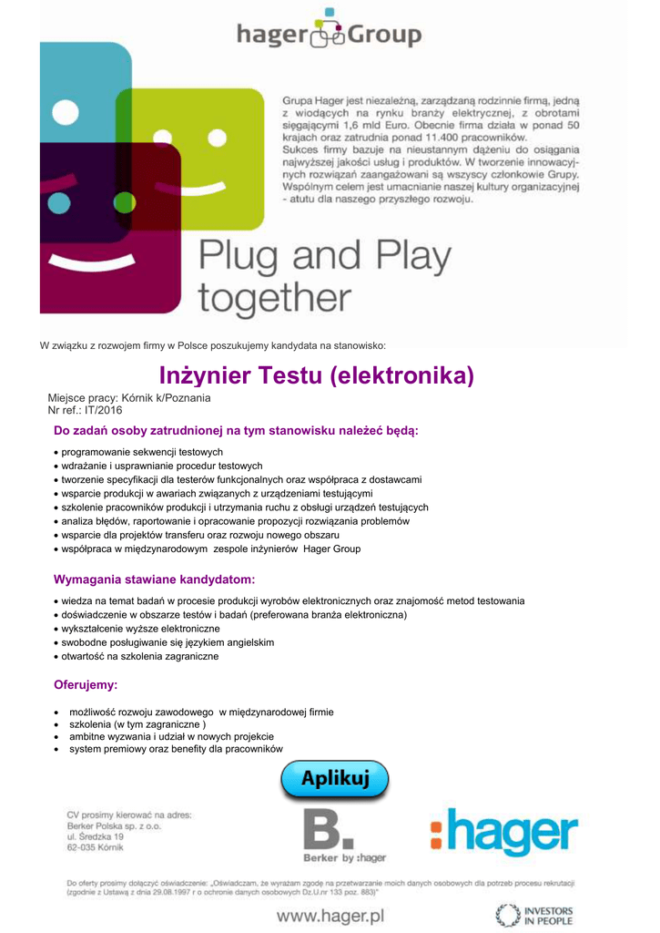 W związku z rozwojem firmy w Polsce poszukujemy kandydata na stanowisko: Inżynier Testu (elektronika) Miejsce pracy: Kórnik k/Poznania Nr ref.: IT/2016 + Do zadań osoby zatrudnionej na tym stanowisku należeć będą: programowanie sekwencji testowych wdrażanie i usprawnianie procedur testowych tworzenie specyfikacji dla testerów funkcjonalnych oraz współpraca z dostawcami wsparcie produkcji w awariach związanych z urządzeniami testującymi szkolenie pracowników produkcji i utrzymania ruchu z obsługi urządzeń testujących analiza błędów, raportowanie i opracowanie propozycji rozwiązania problemów wsparcie dla projektów transferu oraz rozwoju nowego obszaru współpraca w międzynarodowym zespole inżynierów Hager Group Wymagania stawiane kandydatom: wiedza na temat badań w procesie produkcji wyrobów elektronicznych oraz znajomość metod testowania doświadczenie w obszarze testów i badań (preferowana branża elektroniczna) wykształcenie wyższe elektroniczne swobodne posługiwanie się językiem angielskim otwartość na szkolenia zagraniczne Oferujemy: możliwość rozwoju zawodowego w międzynarodowej firmie szkolenia (w tym zagraniczne ) ambitne wyzwania i udział w nowych projekcie system premiowy oraz benefity dla pracowników