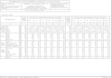 MINISTERSTWO PRACY i POLITYKI SPOŁECZNEJ ul. Nowogrodzka 1/3/5, 00-507 Warszawa Powiatowy Urząd Pracy Sanok ZAŁĄCZNIK 1 do sprawozdania MPiPS - 01 Przekazać/wysłać do 8 dnia roboczego po miesiącu kończącym kwartał do wojewódzkiego urzędu pracy Bezrobotni według czasu pozostawania bez pracy, wieku, poziomu wykształcenia i staŜu pracy Numer identyfikacyjny-REGON 370487260 Stan za 01.12.2008-31.12.2008 1. Bezrobotni ogółem Liczba bezrobotnych razem Wyszczególnienie 0 Czas pozostawania bez pracy w m-cach Wiek Wykształcenie StaŜ pracy ogółem 1 Z tego wg czasu pozostawania bez pracy w miesiącach do 1 1-3 3-6 2 3 4 6-12 12-24 pow.24 5 6 7 do 1 1-3 3-6 6-12 12-24 pow.24 01 02 03 04 05 06 213 350 239 189 185 399 213 18-24 25-34 35-44 45-54 55-59 60-64 lata 07 08 09 10 11 12 295 471 261 432 106 10 44 76 38 45 10 0 111 113 51 65 9 1 68 92 32 42 5 0 34 46 37 53 19 0 25 55 37 53 15 0 wyŜsze polic. i śr. zaw. śr. ogólokszt. zasadnicze zawodowe gimnazj. i poniŜej 13 14 15 16 17 201 464 189 451 270 20 73 38 54 28 63 97 44 89 57 47 70 30 55 37 24 52 19 70 24 do 1 roku 1-5 5-10 10-20 20-30 30 lat i więcej bez staŜu 18 19 20 21 22 23 24 200 353 197 288 176 41 320 26 60 31 38 20 6 32 52 81 38 50 29 6 94 38 69 25 28 17 5 57 Ogółem 25 1575 213 350 239 8 Z tego wg czasu pozostawania bez pracy w miesiącach do 1 1-3 3-6 6-12 12-24 pow.24 9 10 11 12 13 14 101 188 134 93 117 253 101 13 89 66 174 48 9 166 274 160 251 35 17 38 16 27 3 58 60 36 32 2 38 48 19 26 3 24 20 16 29 4 19 38 29 29 2 10 70 44 108 21 21 54 24 50 36 26 118 34 133 88 116 295 122 218 135 6 45 22 17 11 40 61 26 34 27 24 41 19 30 20 13 28 13 30 9 17 37 19 26 18 16 83 23 81 50 24 27 29 42 23 8 36 22 34 24 31 22 9 43 38 82 50 99 65 7 58 113 194 111 162 87 11 208 8 33 17 16 10 2 15 26 44 16 25 16 0 61 22 29 14 18 13 4 34 12 15 12 21 10 2 21 18 22 15 19 6 3 34 27 51 37 63 32 0 43 189 185 399 886 101 188 134 93 117 253 350 239 189 185 399 PULS: St*R - Strumień wydruku - wyk. Zatwarnicki dn. 28.01.09 Liczba bezrobotnych kobiet razem 188 134 93 117 253 Strona 1 z 3 2. Bezrobotni będący w szczególnej sytuacji na rynku pracy 2.1. Ogółem Będący w szczególnej sytuacji na rynku pracy (z rubryki 1) Wyszczególnienie 0 Czas pozostawania bez pracy w m-cach Wiek Wykształcenie StaŜ pracy ogółem Liczba bezrobotnych razem do 25 roku Ŝycia 1 2 długotrwale pow. 50 roku Ŝycia bez kwalifikacji zawodowych bez doświadczenia zawodowego 3 4 5 6 do 1 1-3 3-6 6-12 12-24 pow.24 26 27 28 29 30 31 213 350 239 189 185 399 44 111 68 34 25 13 46 82 58 69 184 399 18-24 25-34 35-44 45-54 55-59 60-64 lata 32 33 34 35 36 37 295 471 261 432 106 10 295 71 212 162 308 76 9 wyŜsze polic. i śr. zaw. śr. ogólokszt. zasadnicze zawodowe gimnazj. i poniŜej 38 39 40 41 42 201 464 189 451 270 46 75 92 55 27 70 245 82 265 176 do 1 roku 1-5 5-10 10-20 20-30 30 lat i więcej bez staŜu 43 44 45 46 47 48 49 200 353 197 288 176 41 320 65 53 3 0 0 0 174 Ogółem 50 1575 295 7 8 którzy po odbyciu kary pozbawienia wolności nie podjęli zatrudnienia 9 niepełnosprawni 10 27 66 41 28 39 77 46 114 79 45 50 69 82 146 92 94 86 221 15 27 19 22 19 33 1 6 3 1 0 5 14 16 5 10 16 27 87 35 35 85 33 3 218 155 17 10 3 0 82 160 153 250 70 6 18 57 27 28 5 0 1 3 4 8 0 0 7 15 12 38 15 1 13 92 34 88 106 103 95 99 83 70 56 451 270 12 32 16 45 30 0 0 0 9 7 2 22 13 29 22 108 167 120 191 100 18 134 16 20 32 108 110 41 6 42 43 27 45 34 5 82 320 72 151 120 168 93 21 96 21 38 15 18 12 0 31 6 5 2 2 0 0 1 8 14 12 24 14 6 10 838 333 278 403 721 135 16 88 PULS: St*R - Strumień wydruku - wyk. Zatwarnicki dn. 28.01.09 27 41 29 44 47 145 bez samotnie wykszwychotałcenia wujący średniego dziecko do 18roku Ŝycia 175 83 Strona 2 z 3 2.2. Kobiety Będące w szczególnej sytuacji na rynku pracy (z rubryki 1) Wyszczególnienie 0 Czas pozostawania bez pracy w m-cach Liczba bezrobotnych razem do 25 roku Ŝycia 1 2 długotrwale pow. 50 roku Ŝycia bez kwalifikacji zawodowych bez doświadczenia zawodowego 3 4 5 6 do 1 1-3 3-6 6-12 12-24 pow.24 51 52 53 54 55 56 101 188 134 93 117 253 17 58 38 24 19 10 31 55 33 32 117 253 57 58 59 60 61 166 274 160 251 35 166 Wiek 18-24 25-34 35-44 45-54 55-59 52 153 107 183 26 Wykształcenie wyŜsze polic. i śr. zaw. śr. ogólokszt. zasadnicze zawodowe gimnazj. i poniŜej 62 63 64 65 66 116 295 122 218 135 31 40 56 27 12 50 172 60 149 90 4 62 21 31 47 104 do 1 roku 1-5 5-10 10-20 20-30 30 lat i więcej bez staŜu 67 68 69 70 71 72 73 113 194 111 162 87 11 208 28 24 0 0 0 0 114 75 108 74 114 47 3 100 9 10 16 61 55 11 3 23 24 17 27 24 2 62 Ogółem 74 886 166 521 165 179 StaŜ pracy ogółem PULS: St*R - Strumień wydruku - wyk. Zatwarnicki dn. 28.01.09 13 19 19 18 22 74 bez samotnie wykszwychotałcenia wujące średniego dziecko do 18roku Ŝycia 7 8 które po odbyciu kary pozbawienia wolności nie podjęły zatrudnienia 9 niepełnosprawne 10 które nie podjęły zatrudnienia po urodzeniu dziecka 11 16 38 27 18 26 54 18 69 48 24 40 52 28 61 50 39 44 131 14 22 14 18 18 31 0 1 1 0 0 0 7 8 3 4 8 13 14 40 24 22 34 86 55 23 25 60 16 131 103 11 6 0 39 86 83 123 22 16 50 26 23 2 1 1 0 0 0 3 5 8 25 2 36 97 48 35 4 75 57 63 57 41 33 218 135 10 30 15 37 25 0 0 0 0 2 0 14 9 14 6 25 62 31 74 28 208 36 80 55 83 37 2 60 20 30 12 15 10 0 30 1 0 0 0 0 0 1 5 10 4 12 8 2 2 28 59 21 26 2 0 84 251 353 117 2 43 220 43 Strona 3 z 3
