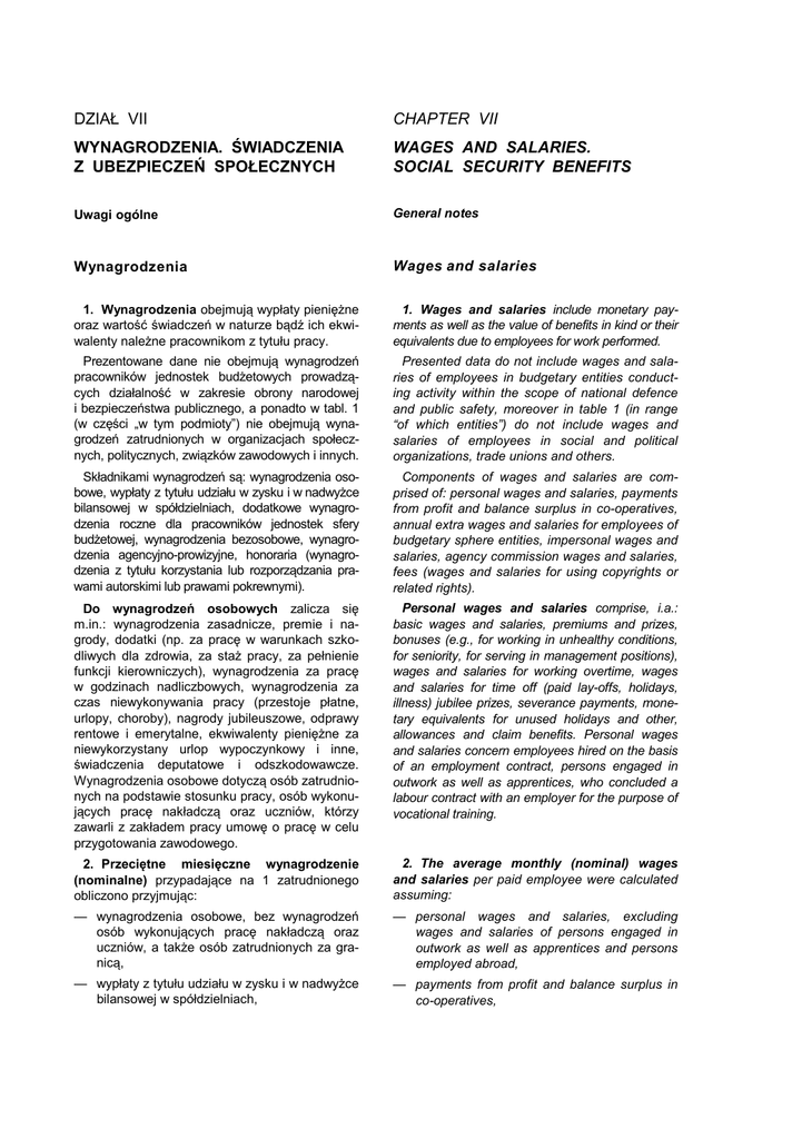 DZIAŁ VII CHAPTER VII WYNAGRODZENIA. ŚWIADCZENIA Z UBEZPIECZEŃ SPOŁECZNYCH WAGES AND SALARIES. SOCIAL SECURITY BENEFITS Uwagi ogólne General notes Wynagrodzenia Wages and salaries 1. Wynagrodzenia obejmują wypłaty pieniężne oraz wartość świadczeń w naturze bądź ich ekwiwalenty należne pracownikom z tytułu pracy. 1. Wages and salaries include monetary payments as well as the value of benefits in kind or their equivalents due to employees for work performed. Prezentowane dane nie obejmują wynagrodzeń pracowników jednostek budżetowych prowadzących działalność w zakresie obrony narodowej i bezpieczeństwa publicznego, a ponadto w tabl. 1 (w części „w tym podmioty”) nie obejmują wynagrodzeń zatrudnionych w organizacjach społecznych, politycznych, związków zawodowych i innych. Presented data do not include wages and salaries of employees in budgetary entities conducting activity within the scope of national defence and public safety, moreover in table 1 (in range “of which entities”) do not include wages and salaries of employees in social and political organizations, trade unions and others. Składnikami wynagrodzeń są: wynagrodzenia osobowe, wypłaty z tytułu udziału w zysku i w nadwyżce bilansowej w spółdzielniach, dodatkowe wynagrodzenia roczne dla pracowników jednostek sfery budżetowej, wynagrodzenia bezosobowe, wynagrodzenia agencyjno-prowizyjne, honoraria (wynagrodzenia z tytułu korzystania lub rozporządzania prawami autorskimi lub prawami pokrewnymi). Components of wages and salaries are comprised of: personal wages and salaries, payments from profit and balance surplus in co-operatives, annual extra wages and salaries for employees of budgetary sphere entities, impersonal wages and salaries, agency commission wages and salaries, fees (wages and salaries for using copyrights or related rights). Do wynagrodzeń osobowych zalicza się m.in.: wynagrodzenia zasadnicze, premie i nagrody, dodatki (np. za pracę w warunkach szkodliwych dla zdrowia, za staż pracy, za pełnienie funkcji kierowniczych), wynagrodzenia za pracę w godzinach nadliczbowych, wynagrodzenia za czas niewykonywania pracy (przestoje płatne, urlopy, choroby), nagrody jubileuszowe, odprawy rentowe i emerytalne, ekwiwalenty pieniężne za niewykorzystany urlop wypoczynkowy i inne, świadczenia deputatowe i odszkodowawcze. Wynagrodzenia osobowe dotyczą osób zatrudnionych na podstawie stosunku pracy, osób wykonujących pracę nakładczą oraz uczniów, którzy zawarli z zakładem pracy umowę o pracę w celu przygotowania zawodowego. Personal wages and salaries comprise, i.a.: basic wages and salaries, premiums and prizes, bonuses (e.g., for working in unhealthy conditions, for seniority, for serving in management positions), wages and salaries for working overtime, wages and salaries for time off (paid lay-offs, holidays, illness) jubilee prizes, severance payments, monetary equivalents for unused holidays and other, allowances and claim benefits. Personal wages and salaries concern employees hired on the basis of an employment contract, persons engaged in outwork as well as apprentices, who concluded a labour contract with an employer for the purpose of vocational training. 2. Przeciętne miesięczne wynagrodzenie (nominalne) przypadające na 1 zatrudnionego obliczono przyjmując: 2. The average monthly (nominal) wages and salaries per paid employee were calculated assuming: — wynagrodzenia osobowe, bez wynagrodzeń osób wykonujących pracę nakładczą oraz uczniów, a także osób zatrudnionych za granicą, — personal wages and salaries, excluding wages and salaries of persons engaged in outwork as well as apprentices and persons employed abroad, — wypłaty z tytułu udziału w zysku i w nadwyżce bilansowej w spółdzielniach, — payments from profit and balance surplus in co-operatives, WAGES AND SALARIES. SOCIAL SECURITY BENEFITS 163 — dodatkowe wynagrodzenia roczne dla pracowników jednostek sfery budżetowej, — annual extra wages and salaries for employees of budgetary sphere entities, — honoraria wypłacone niektórym grupom pracowników za prace wynikające z umowy o pracę, np. dziennikarzom, realizatorom filmów, programów radiowych i telewizyjnych. — fees paid to selected groups of employees for performing work in accordance with a labour contract, e.g., to journalists, film producers, radio and television program producers. Dane o przeciętnych wynagrodzeniach dotyczą osób pełnozatrudnionych oraz niepełnozatrudnionych w przeliczeniu na pełnozatrudnionych. Data regarding average wages and salaries concern full-time paid employees as well as part-time paid employees, the wages and salaries of whom have been converted into those of full-time paid employees. 3. Dane o wynagrodzeniach podaje się w ujęciu brutto, tj. łącznie z zaliczkami na poczet podatku dochodowego od osób fizycznych oraz ze składkami na obowiązkowe ubezpieczenia społeczne (emerytalne, rentowe i chorobowe) płaconymi przez ubezpieczonego pracownika. 3. Data regarding wages and salaries are given in gross terms, i.e. including deductions for personal income taxes and employee’s contributions to compulsory social security (retirement, pension and illness). 4. Dane w tabl. 3-6 opracowano na podstawie reprezentacyjnego badania struktury wynagrodzeń według zawodów za październik 2014 r. Dane dotyczą zatrudnionych, którzy otrzymali wynagrodzenie za cały miesiąc, bez zatrudnionych w organizacjach: społecznych, politycznych, związków zawodowych i innych. Do obliczenia wynagrodzenia przyjęto sumę: wypłat wynagrodzeń osobowych za badany miesiąc z uwzględnieniem wypłat dokonanych za okresy dłuższe niż miesiąc w przeliczeniu na jeden miesiąc (np. 1/3 premii kwartalnej, 1/12: nagród i premii rocznych, wypłat z tytułu udziału w zysku i w nadwyżce bilansowej w spółdzielniach, dodatkowych wynagrodzeń rocznych dla pracowników jednostek sfery budże