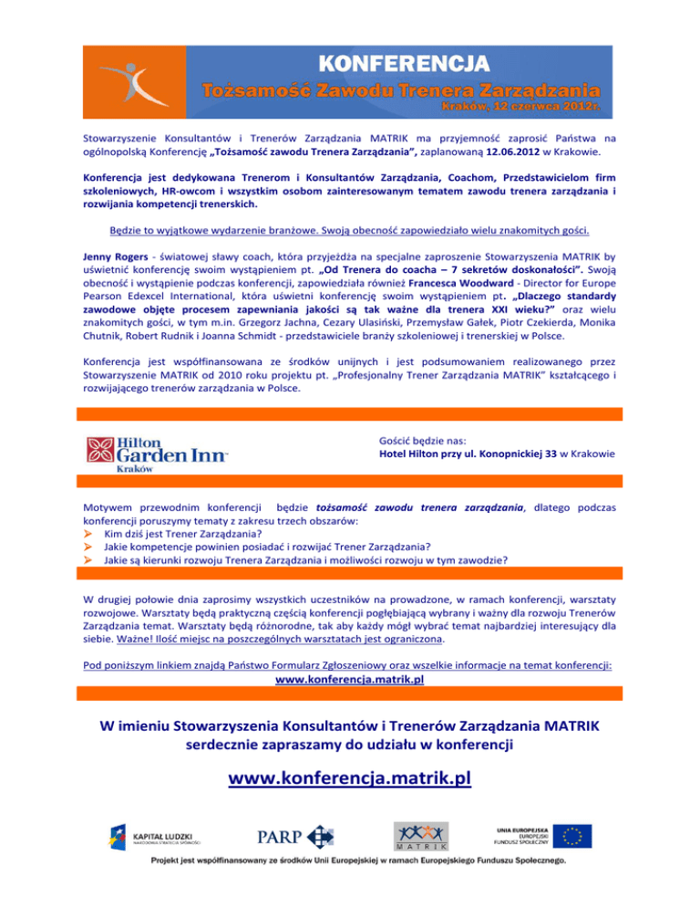 Stowarzyszenie Konsultantów i Trenerów Zarządzania MATRIK ma przyjemność zaprosić Państwa na ogólnopolską Konferencję „Tożsamość zawodu Trenera Zarządzania”, zaplanowaną 12.06.2012 w Krakowie. Konferencja jest dedykowana Trenerom i Konsultantów Zarządzania, Coachom, Przedstawicielom firm szkoleniowych, HR-owcom i wszystkim osobom zainteresowanym tematem zawodu trenera zarządzania i rozwijania kompetencji trenerskich. Będzie to wyjątkowe wydarzenie branżowe. Swoją obecność zapowiedziało wielu znakomitych gości. Jenny Rogers - światowej sławy coach, która przyjeżdża na specjalne zaproszenie Stowarzyszenia MATRIK by uświetnić konferencję swoim wystąpieniem pt. „Od Trenera do coacha – 7 sekretów doskonałości”. Swoją obecność i wystąpienie podczas konferencji, zapowiedziała również Francesca Woodward - Director for Europe Pearson Edexcel International, która uświetni konferencję swoim wystąpieniem pt. „Dlaczego standardy zawodowe objęte procesem zapewniania jakości są tak ważne dla trenera XXI wieku?” oraz wielu znakomitych gości, w tym m.in. Grzegorz Jachna, Cezary Ulasiński, Przemysław Gałek, Piotr Czekierda, Monika Chutnik, Robert Rudnik i Joanna Schmidt - przedstawiciele branży szkoleniowej i trenerskiej w Polsce. Konferencja jest współfinansowana ze środków unijnych i jest podsumowaniem realizowanego przez Stowarzyszenie MATRIK od 2010 roku projektu pt. „Profesjonalny Trener Zarządzania MATRIK” kształcącego i rozwijającego trenerów zarządzania w Polsce. Gościć będzie nas: Hotel Hilton przy ul. Konopnickiej 33 w Krakowie Motywem przewodnim konferencji będzie tożsamość zawodu trenera zarządzania, dlatego podczas konferencji poruszymy tematy z zakresu trzech obszarów: Kim dziś jest Trener Zarządzania? Jakie kompetencje powinien posiadać i rozwijać Trener Zarządzania? Jakie są kierunki rozwoju Trenera Zarządzania i możliwości rozwoju w tym zawodzie? W drugiej połowie dnia zaprosimy wszystkich uczestników na prowadzone, w ramach konferencji, warsztaty rozwojowe. Warsztaty będą praktyczną częścią konferencji pogłębiającą wybrany i ważny dla rozwoju Trenerów Zarządzania temat. Warsztaty będą różnorodne, tak aby każdy mógł wybrać temat najbardziej interesujący dla siebie. Ważne! Ilość miejsc na poszczególnych warsztatach jest ograniczona. Pod poniższym linkiem znajdą Państwo Formularz Zgłoszeniowy oraz wszelkie informacje na temat konferencji: www.konferencja.matrik.pl W imieniu Stowarzyszenia Konsultantów i Trenerów Zarządzania MATRIK serdecznie zapraszamy do udziału w konferencji www.konferencja.matrik.pl
